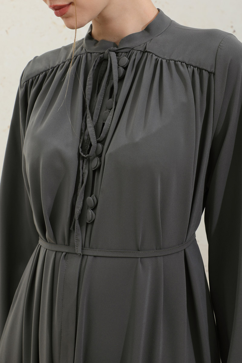 Çift Düğmeli Elbise Füme. Hakim yakalıdır, üst kısım çift düğmelidir, alt kısım gizli düğmelidir, robası büzgülüdür, ince biye kuşaklıdır, yandan gizli ceplidir, manşet kısmı lastiklidir, astarsızdır, günlük ve özel günlerde kullanıma uygundur.