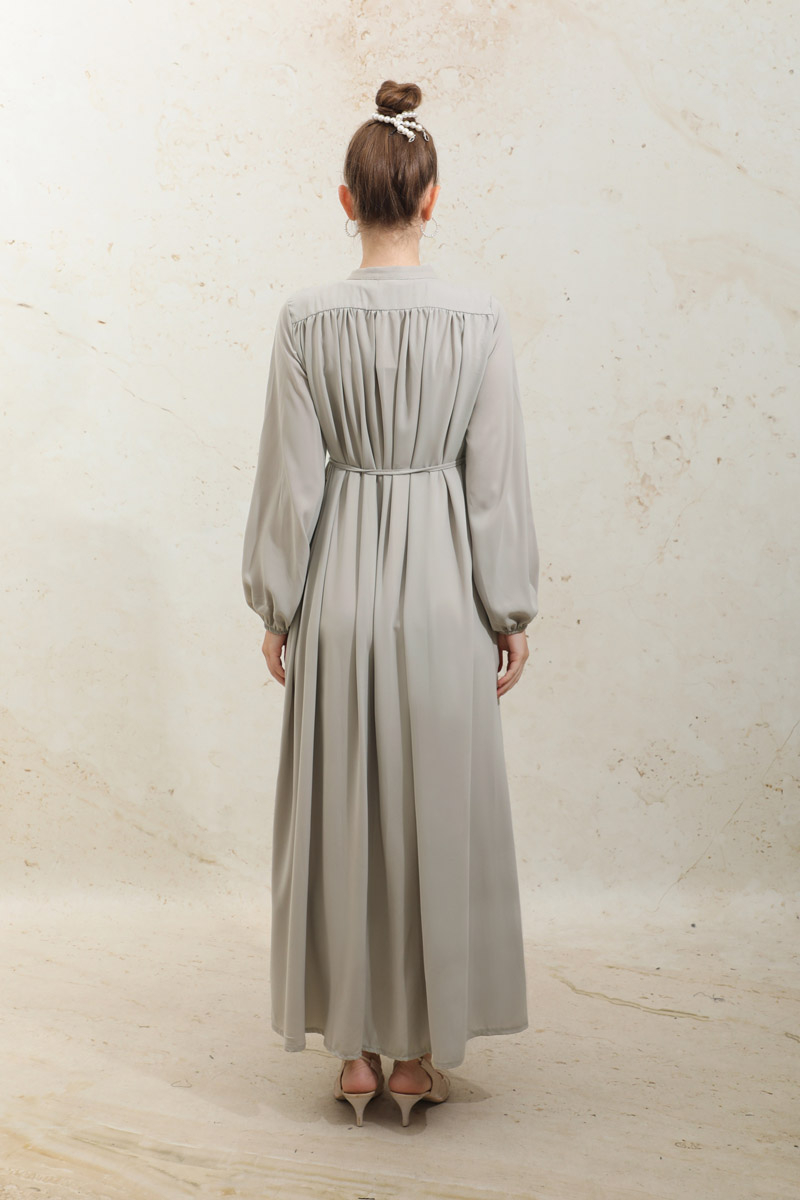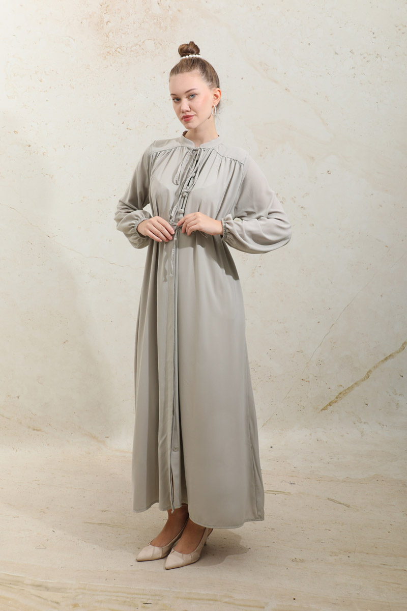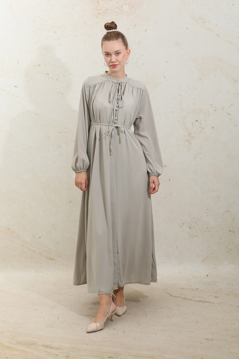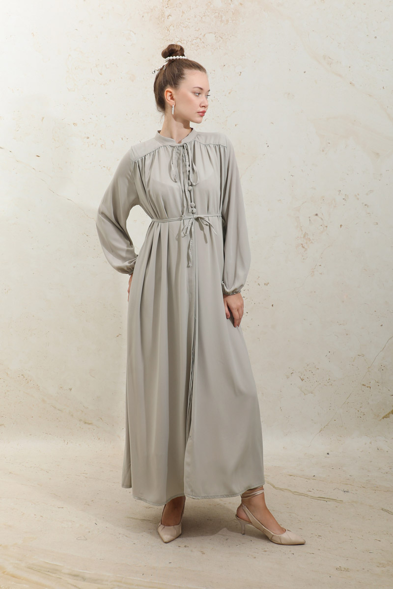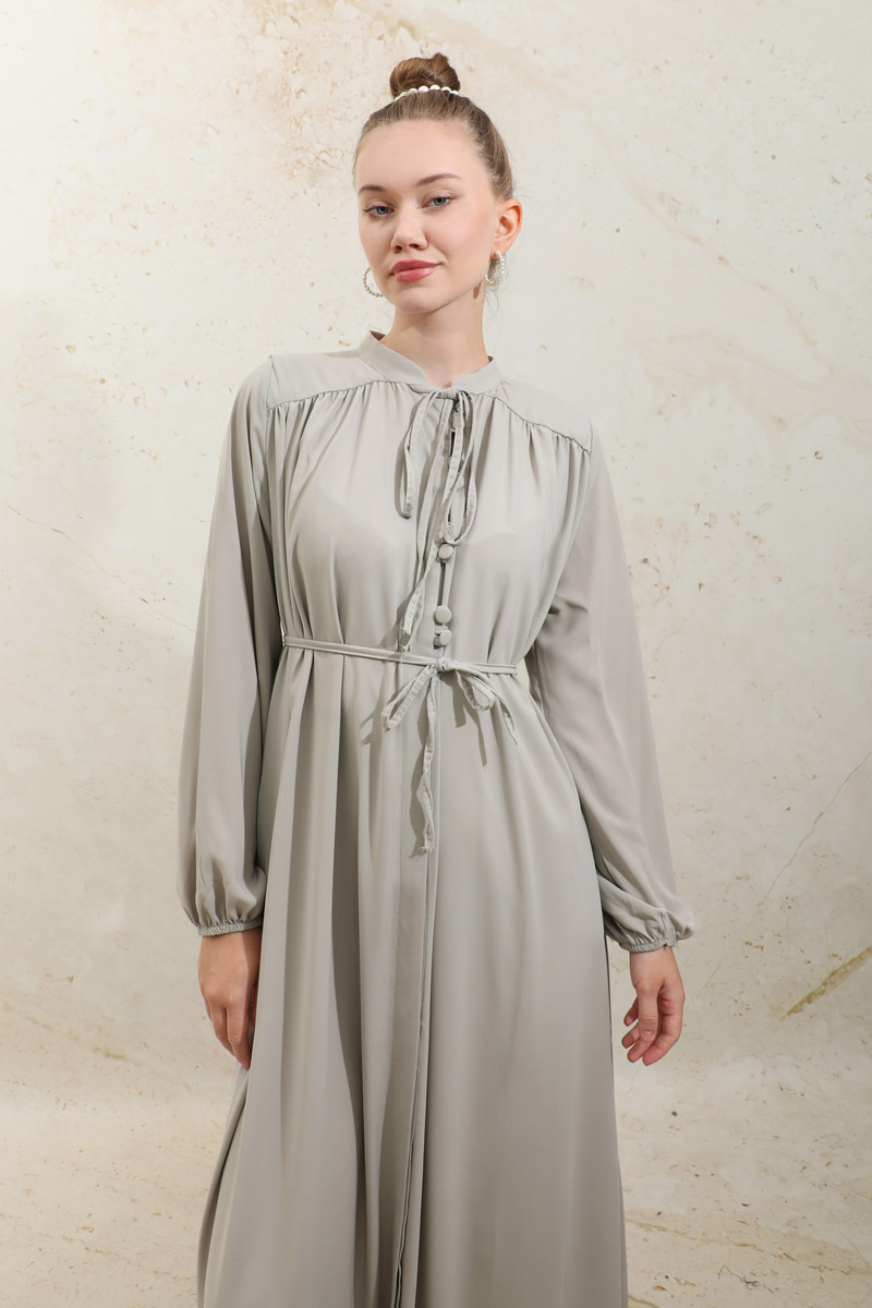 Çift Düğmeli Elbise Taş. Hakim yakalıdır, üst kısım çift düğmelidir, alt kısım gizli düğmelidir, robası büzgülüdür, ince biye kuşaklıdır, yandan gizli ceplidir, manşet kısmı lastiklidir, astarsızdır, günlük ve özel günlerde kullanıma uygundur.