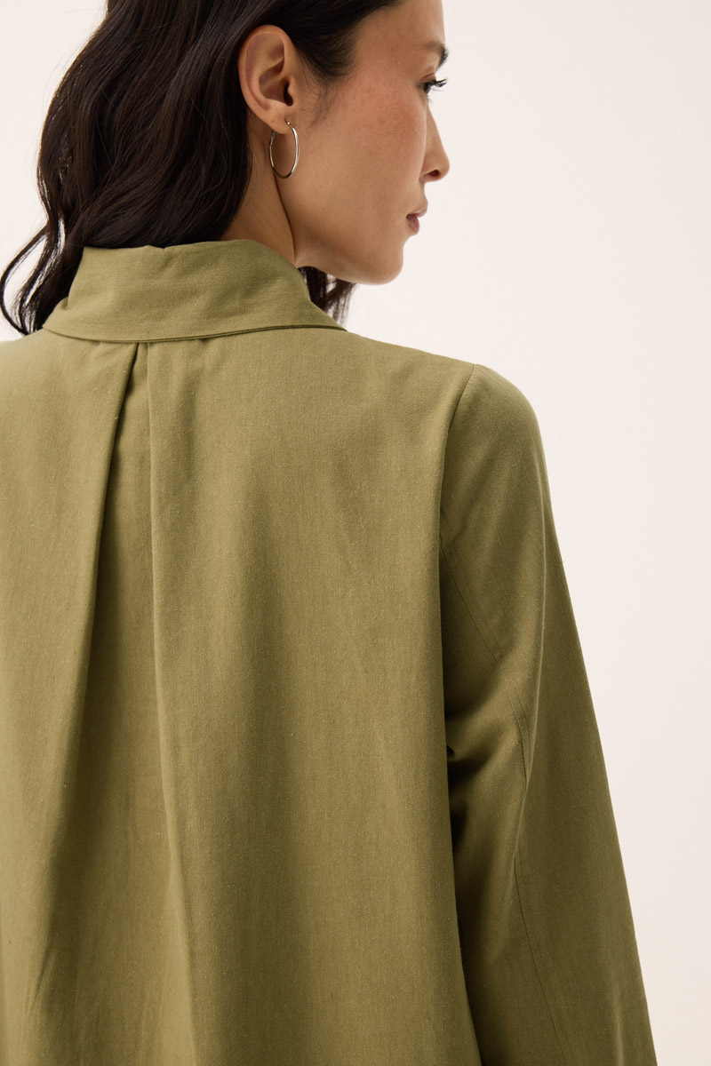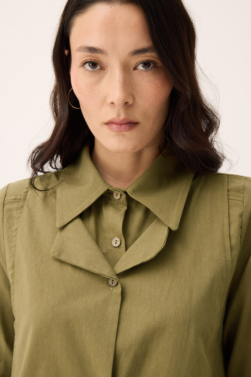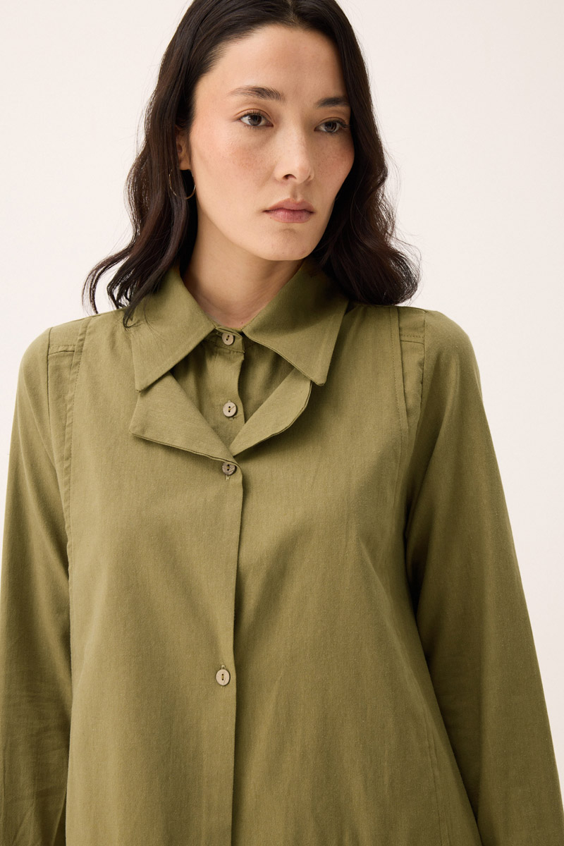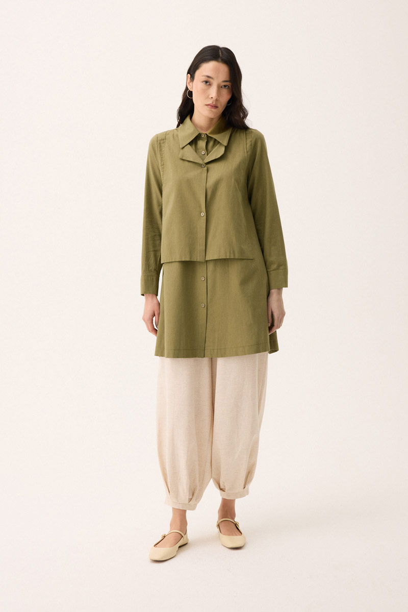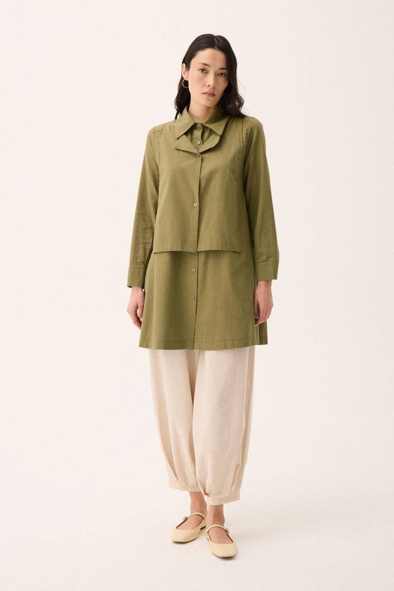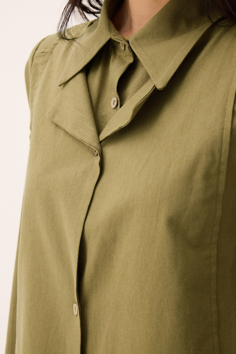 Çift Yaka Keten Gömlek Haki. Gömlek yakadır, önden parça detaylıdır, düğmelidir, manşetlidir, cepsizdir, Günlük kullanım için uygundur.