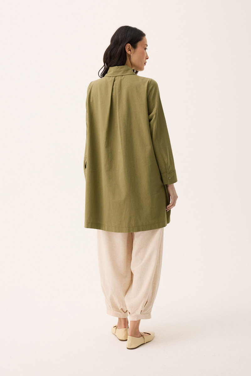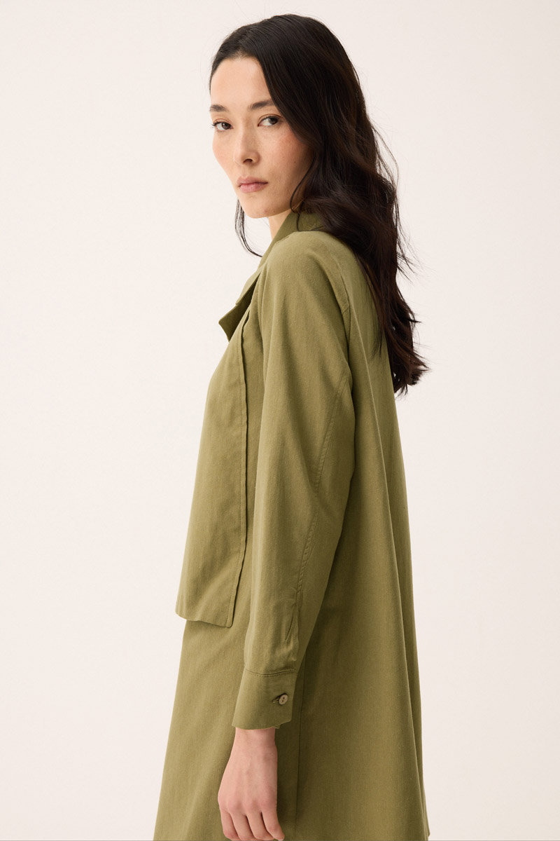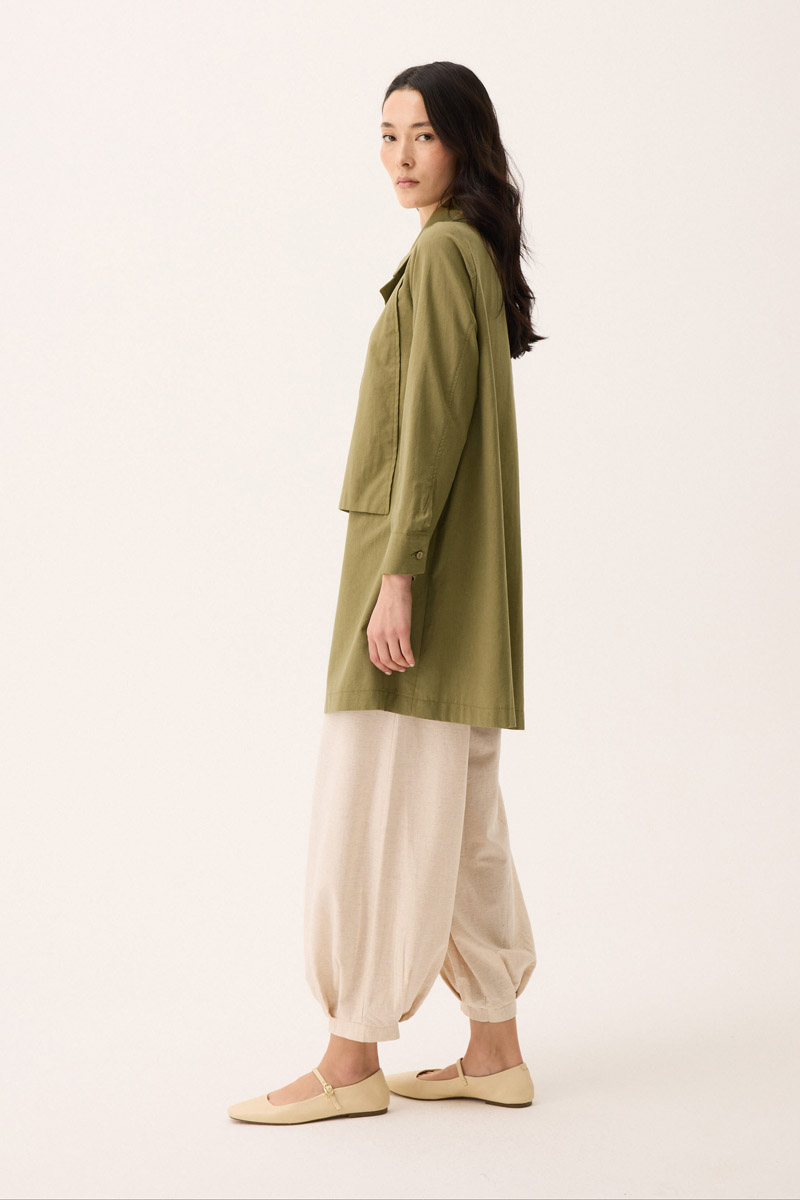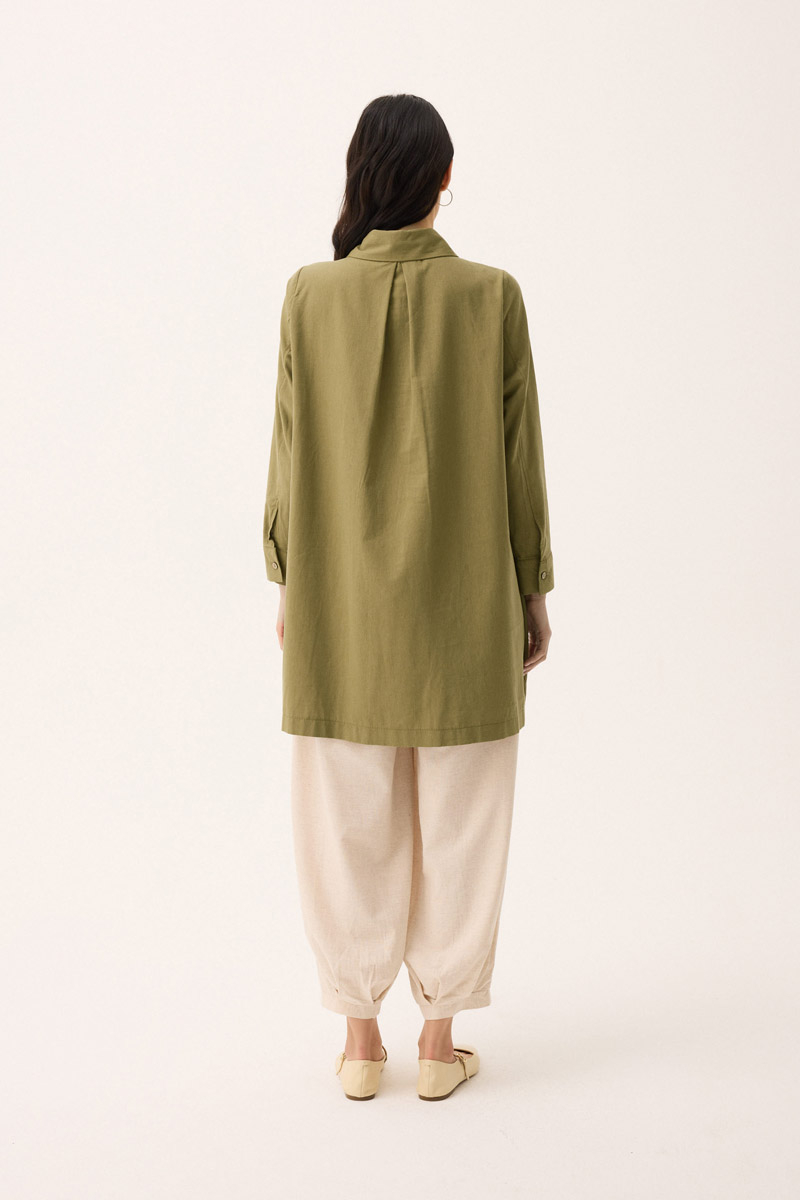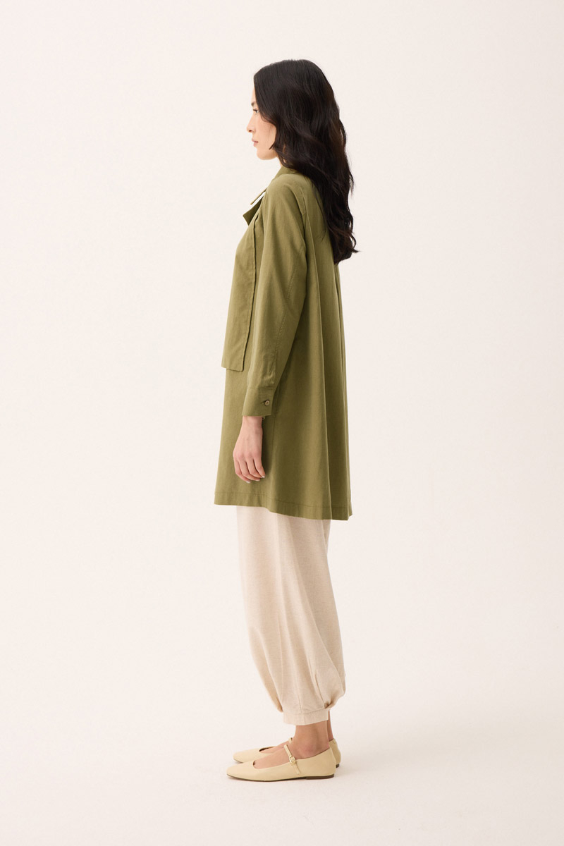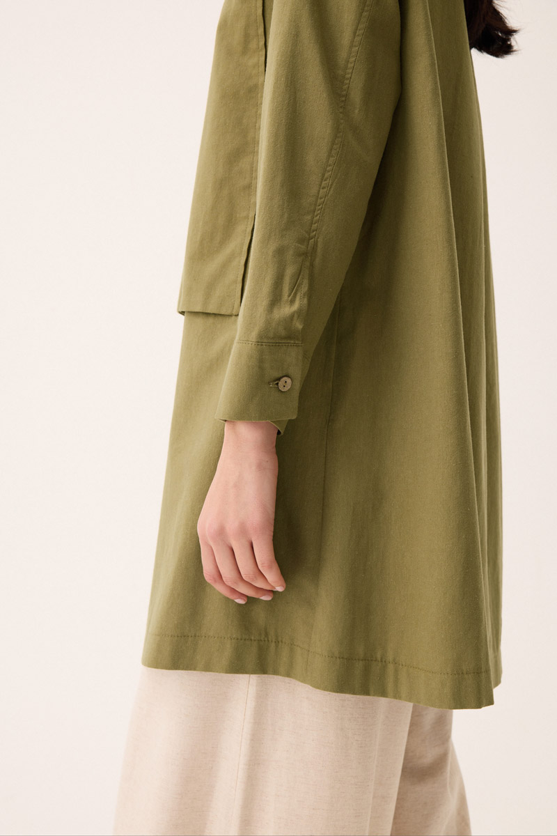 Çift Yaka Keten Gömlek Haki. Gömlek yakadır, önden parça detaylıdır, düğmelidir, manşetlidir, cepsizdir, Günlük kullanım için uygundur.