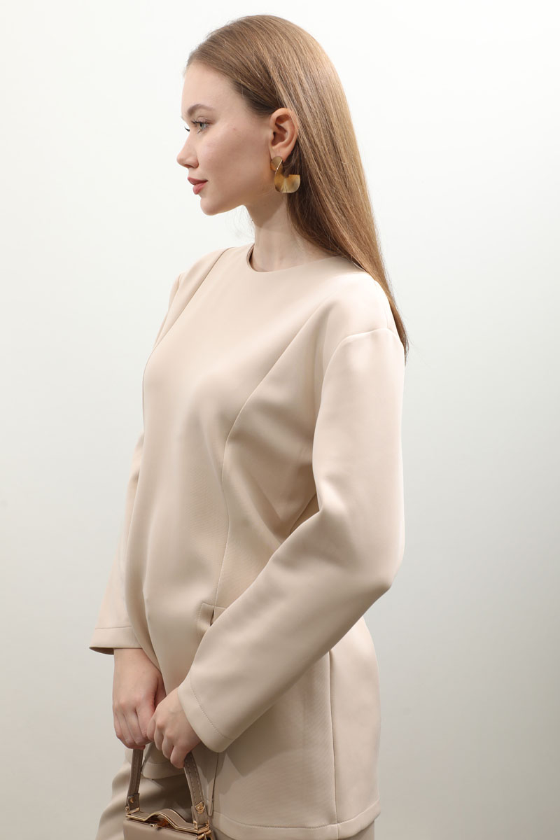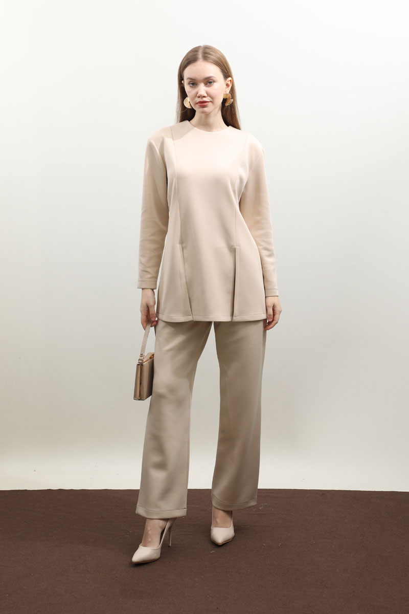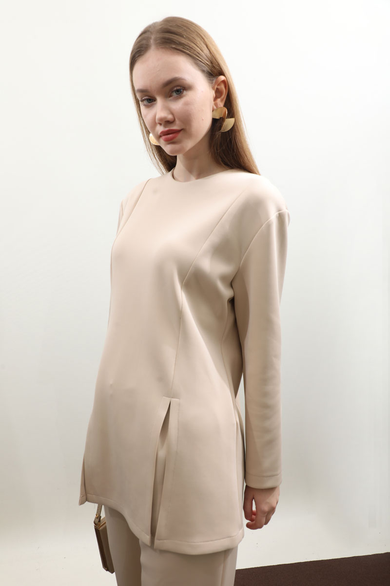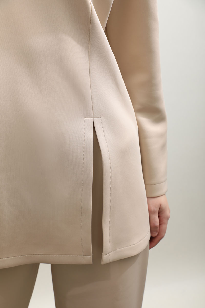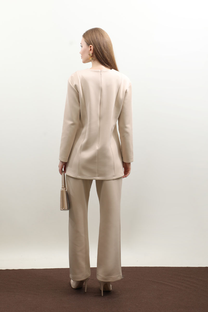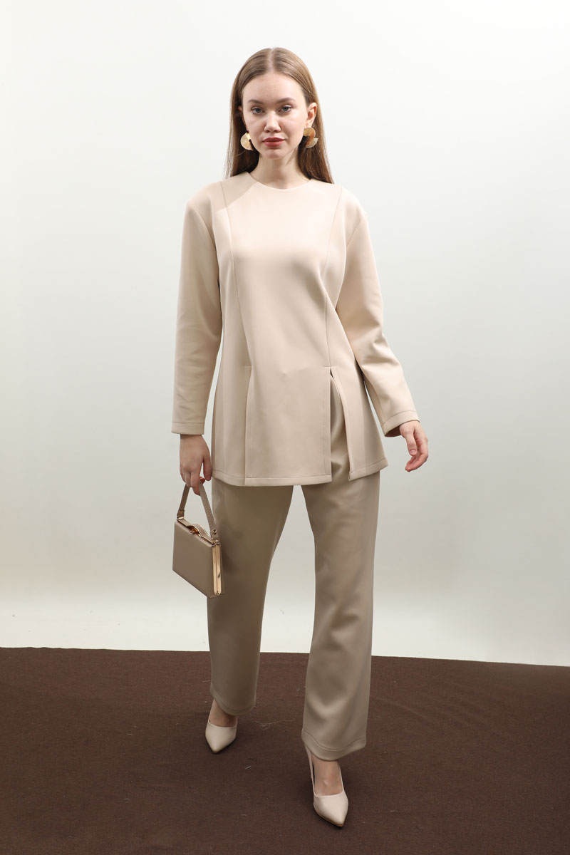 Çift Yırtmaçlı Takım Krem. Bisiklet yaka, arkadan fermuarlı, önden dikiş ve yırtmaç detaylıdır. Pantolon beli düğmelidir önden fermuarlıdır, bel kısmında pile detayı vardır, düz paçalı, cepsizdir. Bahar ve kış mevsimi için uygundur.