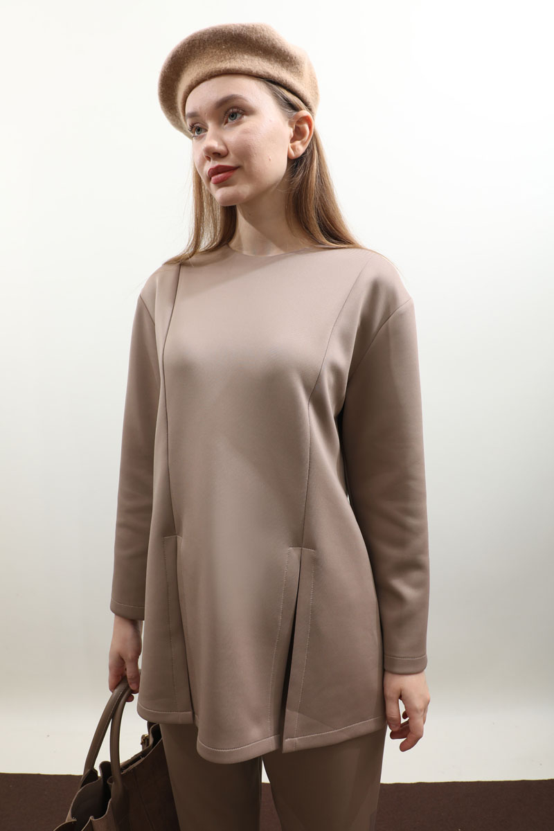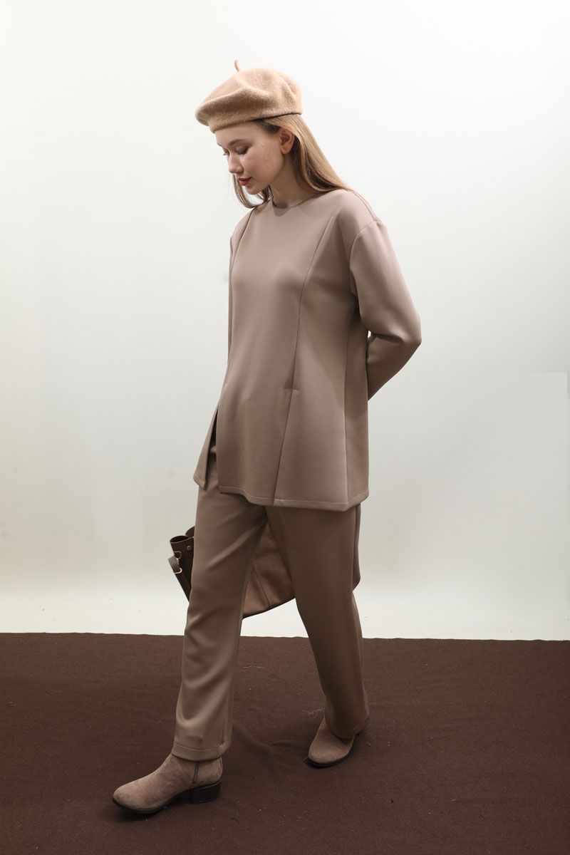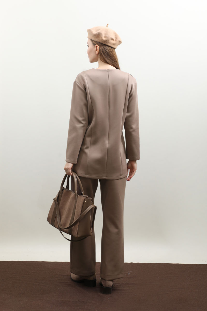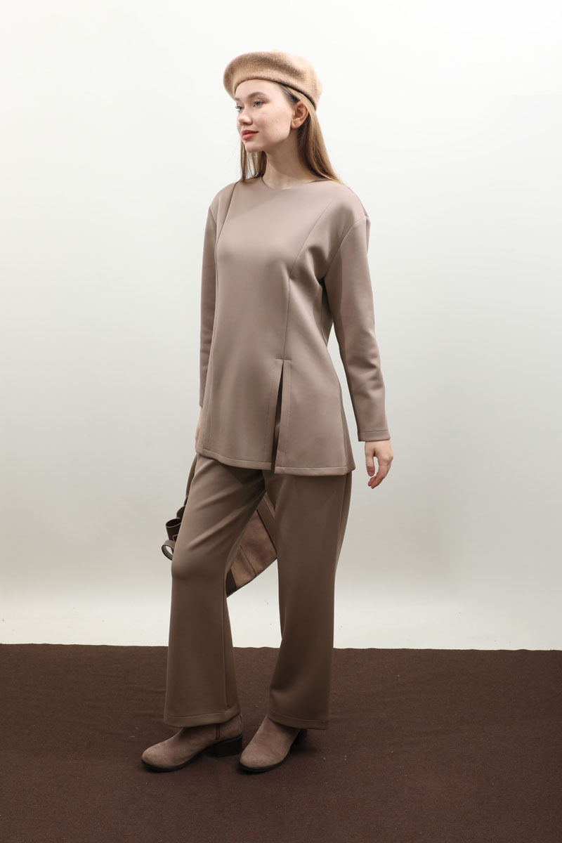 Çift Yırtmaçlı Takım Vizon. Bisiklet yaka, arkadan fermuarlı, önden dikiş ve yırtmaç detaylıdır. Pantolon beli düğmelidir önden fermuarlıdır, bel kısmında pile detayı vardır, düz paçalı, cepsizdir. Bahar ve kış mevsimi için uygundur.