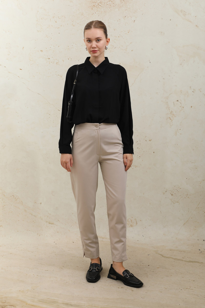 Cigarette Trousers Stone. The leg has a slit (4cm). It is zippered. It has a back flap pocket. It has side pockets. The waist is corsage. It's a normal pattern. You can choose it for your daily use and special days.