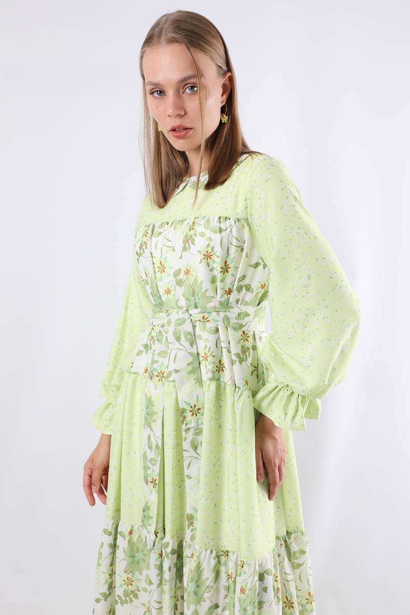 Çıtır Desenli Büzgülü Elbise Yeşil