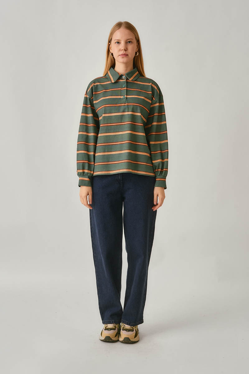Çizgi Baskılı Sweatshirt Koyu Yeşil, rahat kalıbı ve zamansız çizgi deseniyle günlük stilin vazgeçilmez parçalarından biridir. Polo yaka detayı sportif bir görünüm kazandırırken, yumuşak dokulu kumaşı sayesinde gün boyu konfor sunar. Mevsim geçişlerinde hem tek başına hem de katmanlı kombinlerde rahatlıkla kullanılabilir.