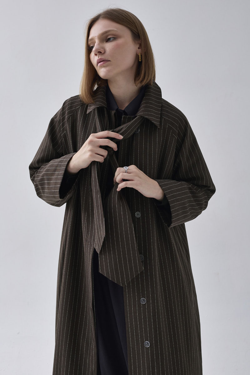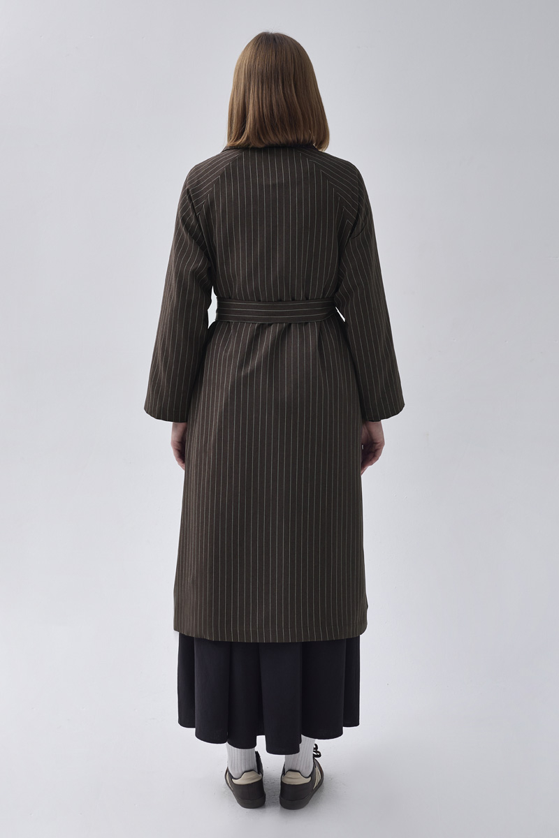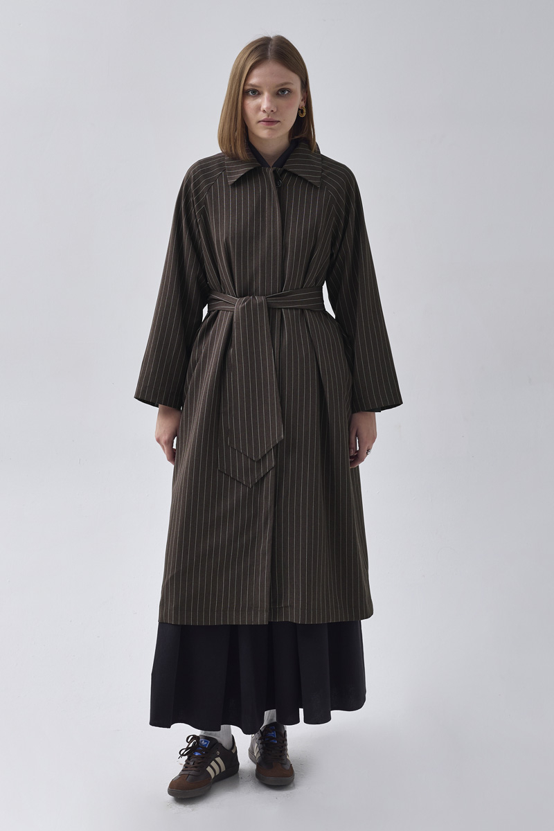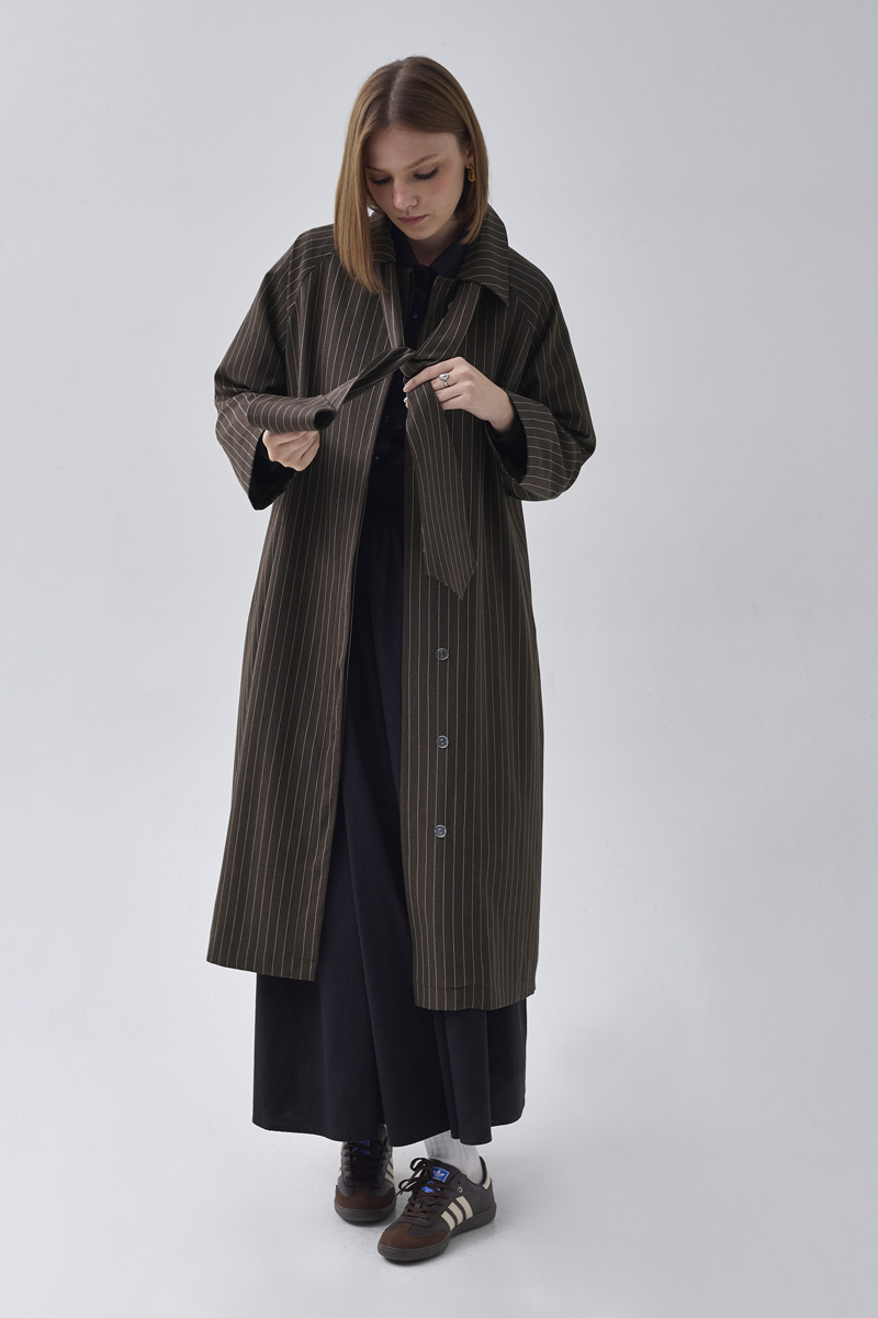 Çizgi Desenli Trençkot Kahverengi, zamansız şıklığıyla günlük ve özel kombinlerde rahatlıkla kullanılabilir. Dikey çizgi deseni ile uzun ve zarif bir siluet sunarken, kuşaklı tasarımı sayesinde belinizi vurgular ve farklı bağlama stilleriyle çok yönlü bir kullanım sağlar. Hem klasik hem de modern görünümlere uyum sağlayan bu trençkot, gardırobunuzun vazgeçilmez parçalarından biri olacaktır.