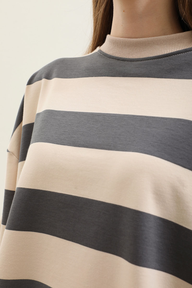 Çizgili Basic Sweat Füme Bisiklet yakadır, boyun, bilek ve beli ribanalıdır, düşük omuzulu ve yarasa kolludur, kalın çizgi detaylıdır. Cepsizdir. Günlük kullanım ve özel günlerinizde tercih edebilirsiniz.