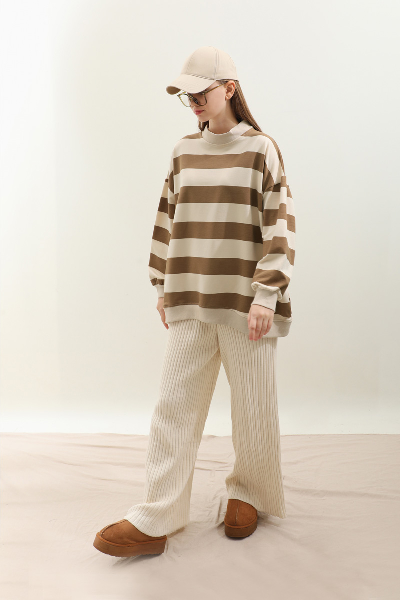 Çizgili basic Sweat Taba. Bisiklet yakadır, boyun, bilek ve beli ribanalıdır, düşük omuzulu ve yarasa kolludur, kalın çizgi detaylıdır. Cepsizdir. Günlük kullanım ve özel günlerinizde tercih edebilirsiniz.