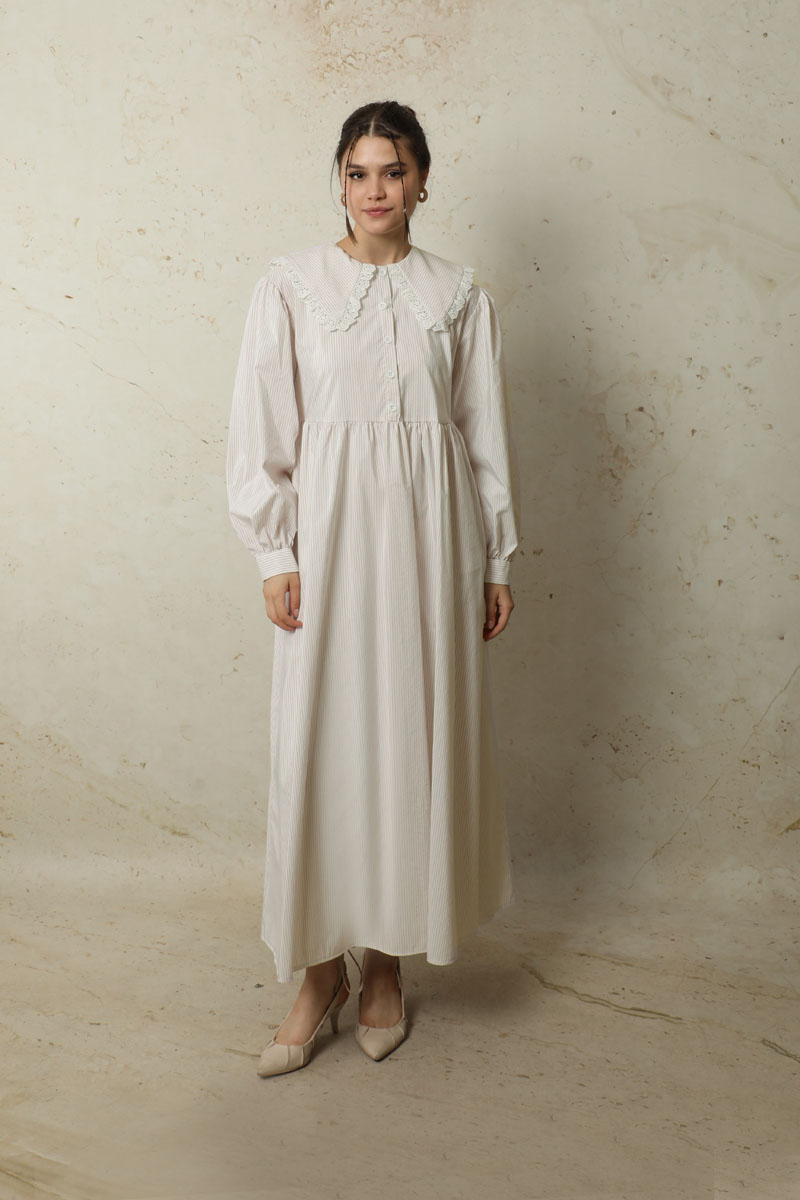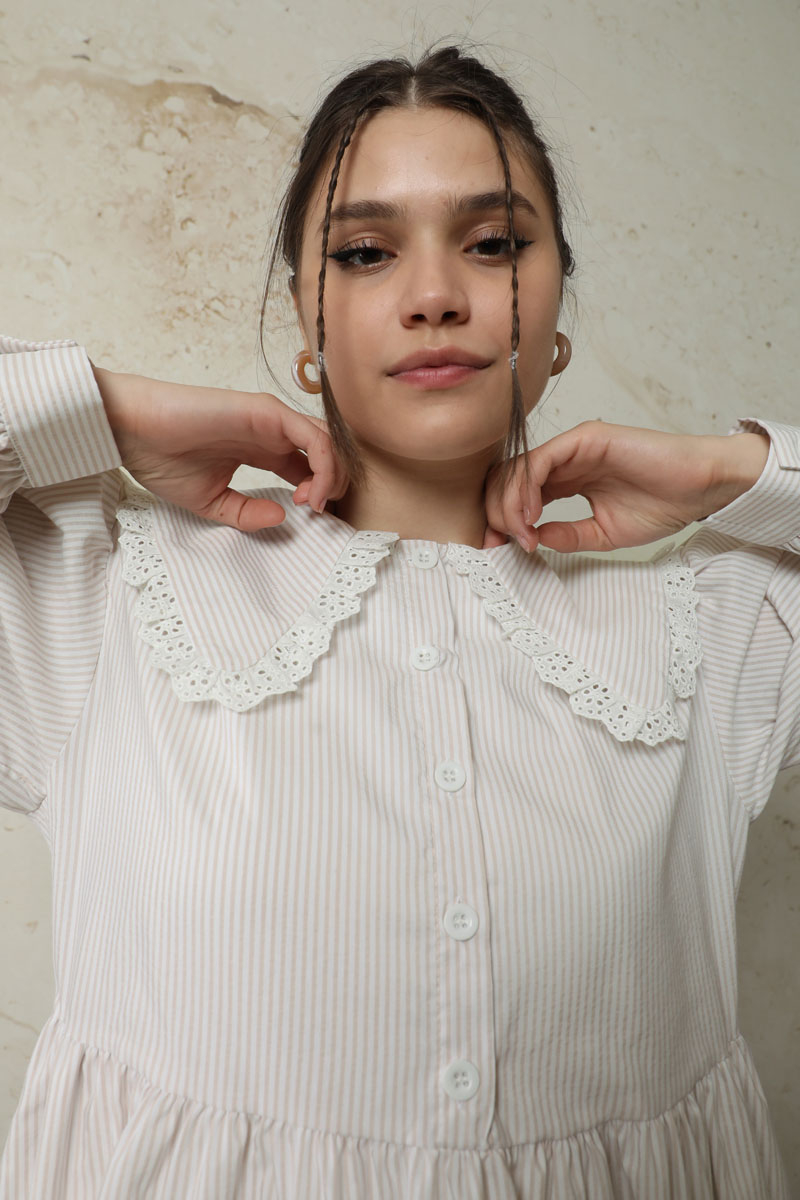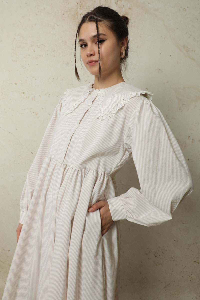 Çizgili Bebe Yaka Elbise Taş. Yaka kenarları dantellidir. Önü yarım pat düğmelidir. Beli kesikli büzgülüdür. Balon koldur. Omuz tepesi büzgülüdür. Manşeti büzgülüdür. Yandan ceplidir. Astarsızdır.