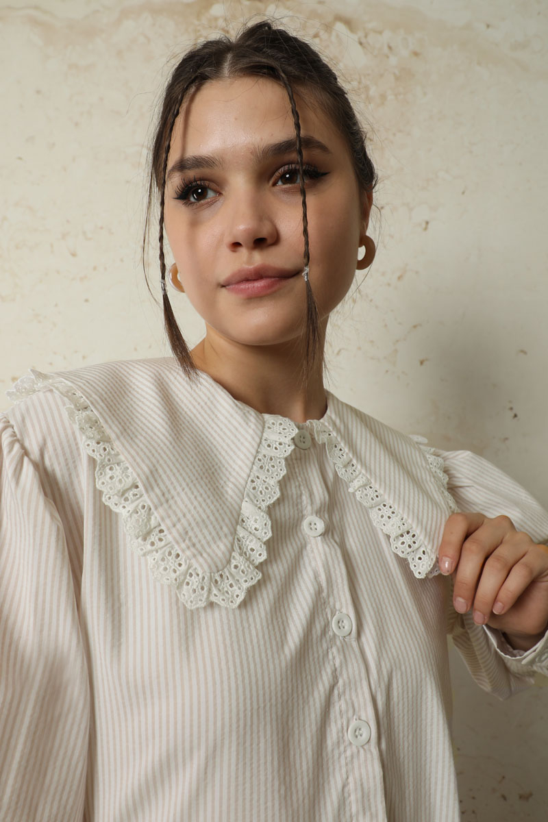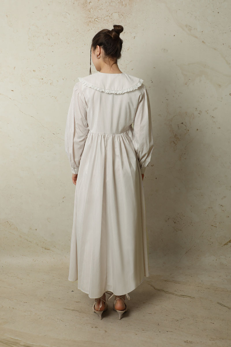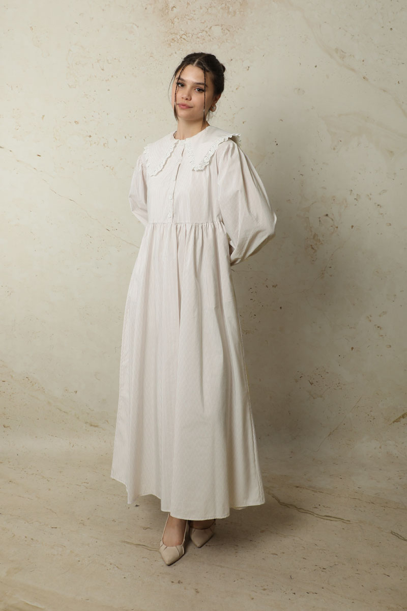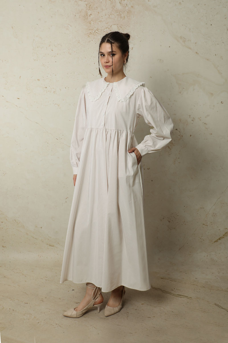 Çizgili Bebe Yaka Elbise Taş. Yaka kenarları dantellidir. Önü yarım pat düğmelidir. Beli kesikli büzgülüdür. Balon koldur. Omuz tepesi büzgülüdür. Manşeti büzgülüdür. Yandan ceplidir. Astarsızdır.