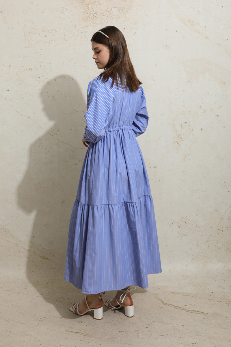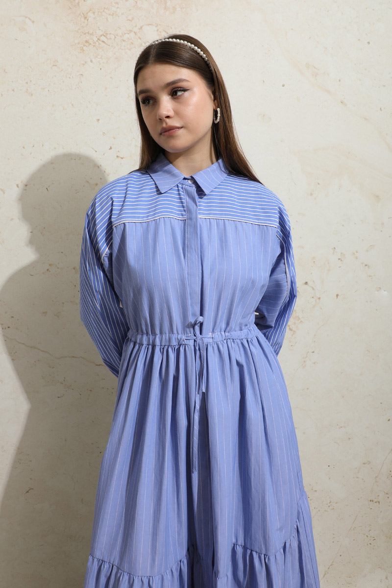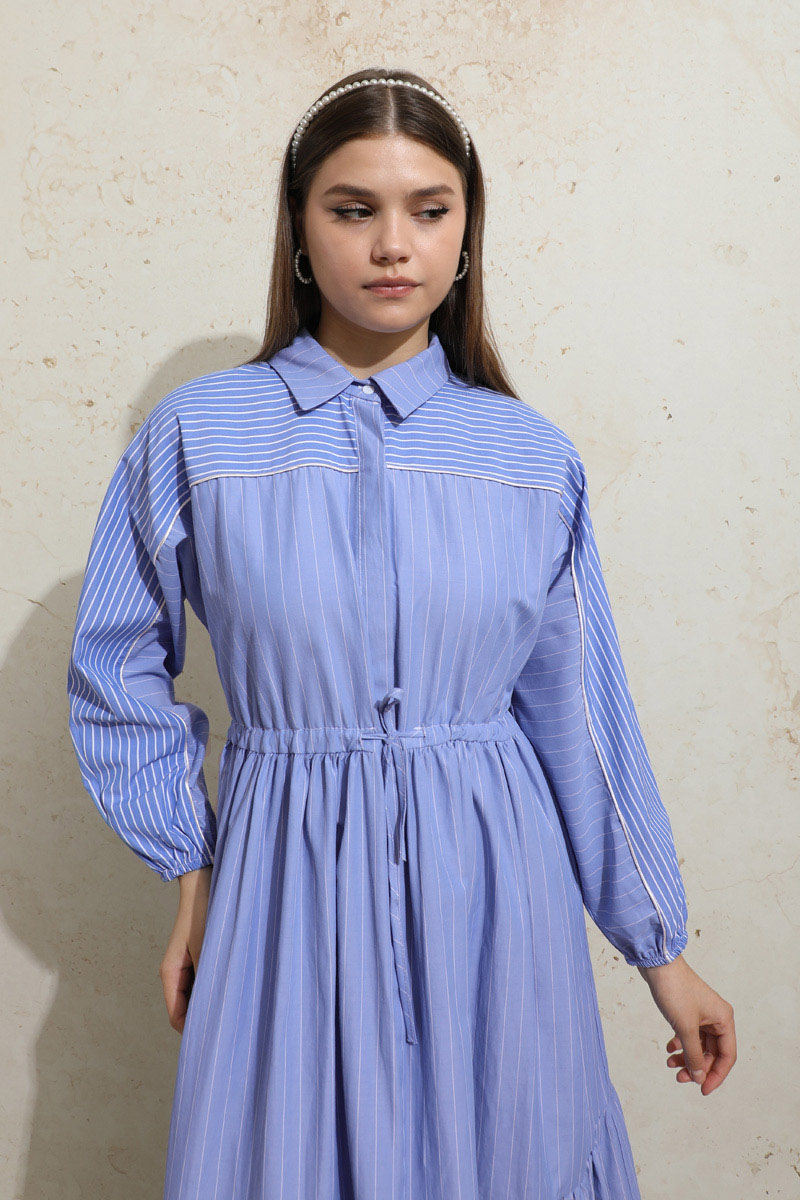 Çizgili Büzgü Elbise Mavi. Gömlek yakalıdır. Ön kısmı gizli düğmelidir. Kolu lastiklidir. Beli tünellidir. Belden sıkmalıdır. Yan ceplidir. Yarım yarasa kolludur. Robalıdır ve Robası garnilidir. Robasında biye vardır. Eteği kesikli ve büzgülüdür.