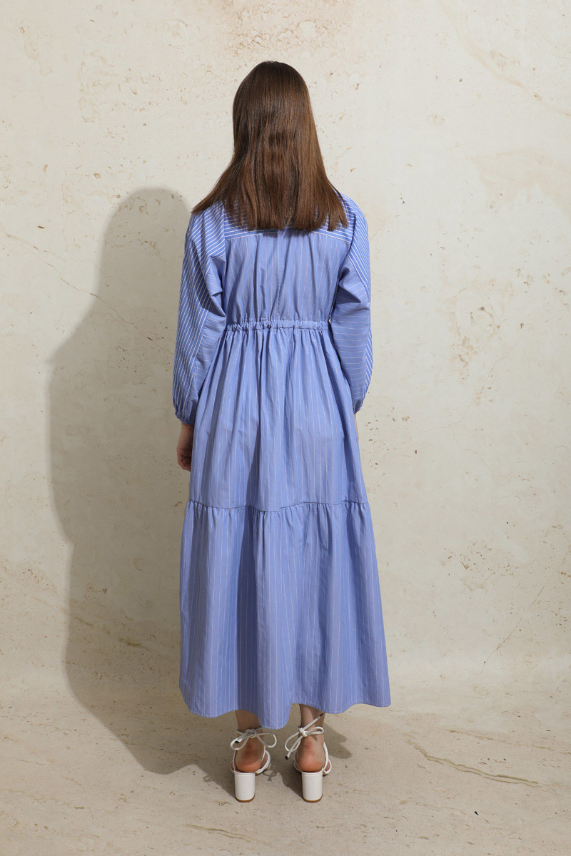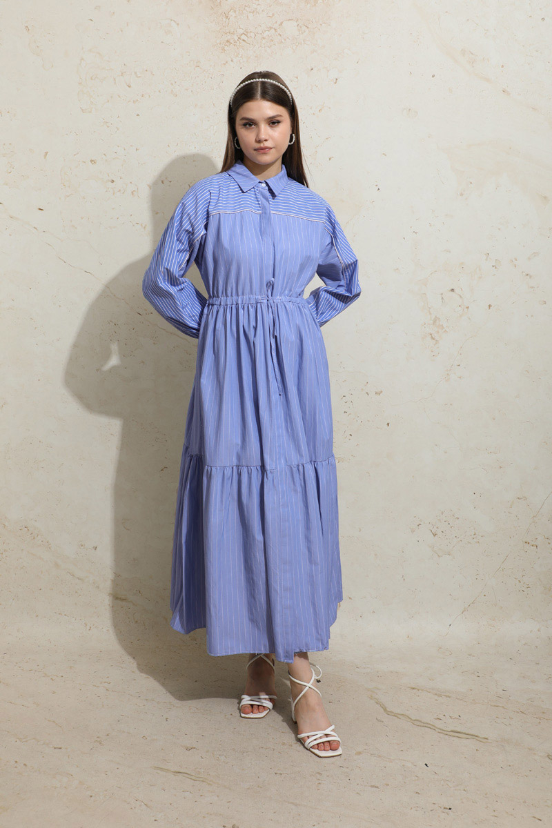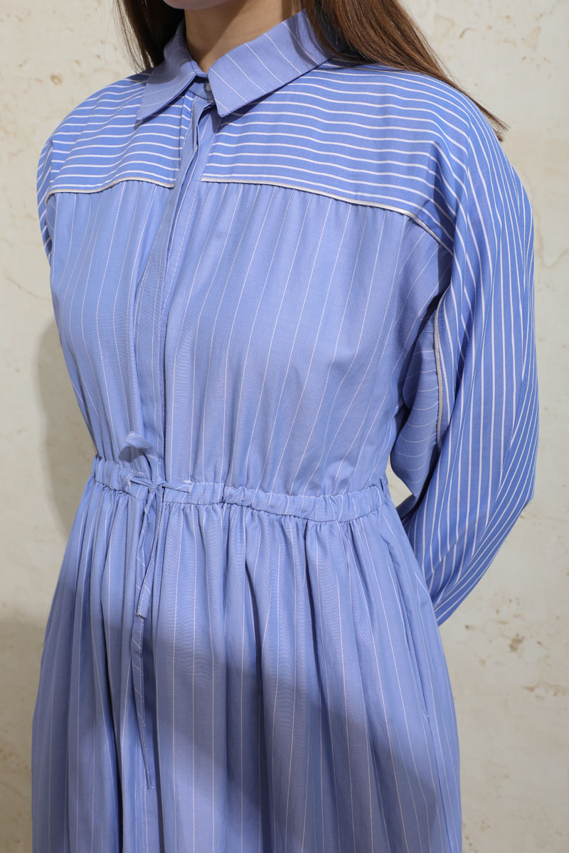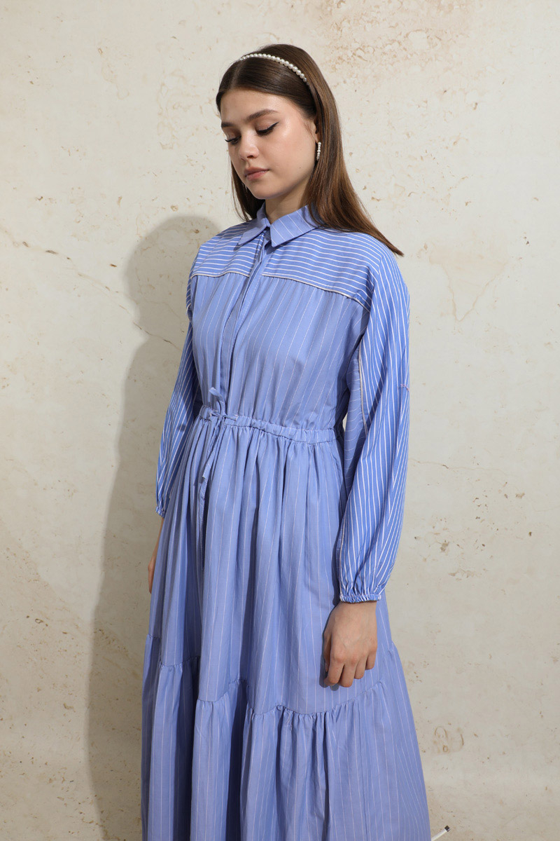 Çizgili Büzgü Elbise Mavi. Gömlek yakalıdır. Ön kısmı gizli düğmelidir. Kolu lastiklidir. Beli tünellidir. Belden sıkmalıdır. Yan ceplidir. Yarım yarasa kolludur. Robalıdır ve Robası garnilidir. Robasında biye vardır. Eteği kesikli ve büzgülüdür.