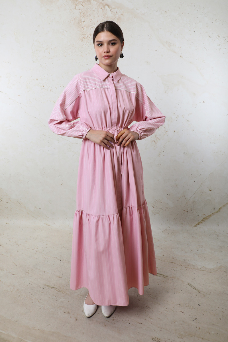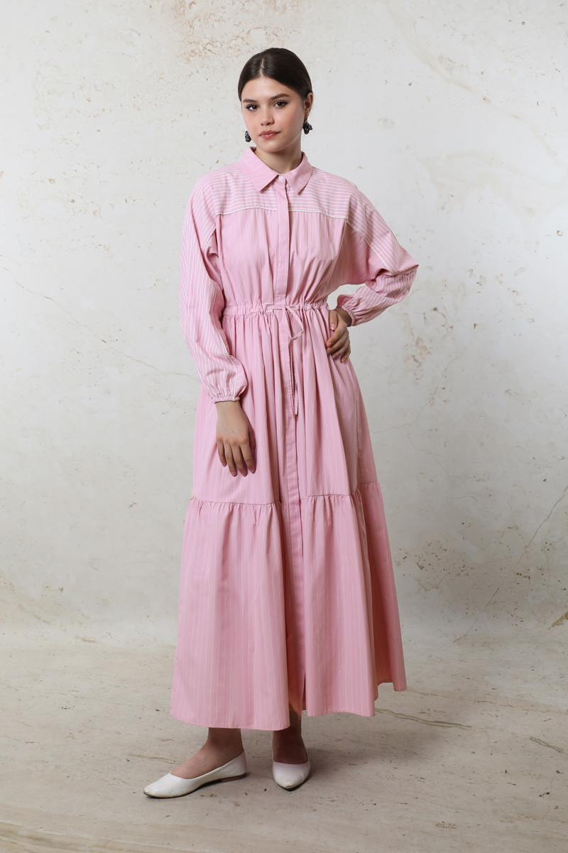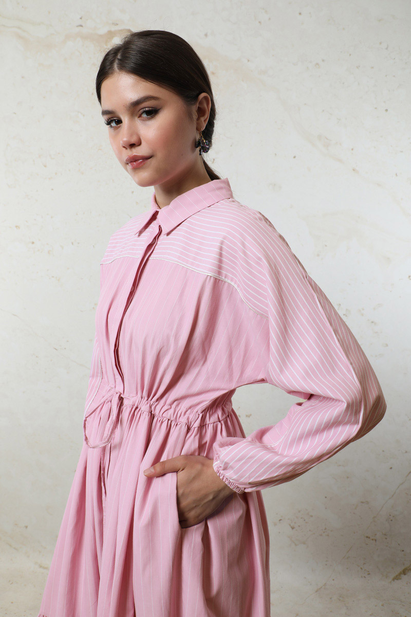 Çizgili Büzgü Elbise Pembe. Gömlek yakalıdır. Ön kısmı gizli düğmelidir. Kolu lastiklidir. Beli tünellidir. Belden sıkmalıdır. Yan ceplidir. Yarım yarasa kolludur. Robalıdır ve Robası garnilidir. Robasında biye vardır. Eteği kesikli ve büzgülüdür.