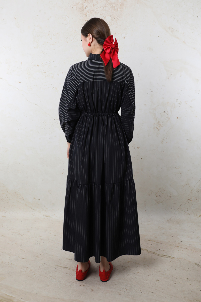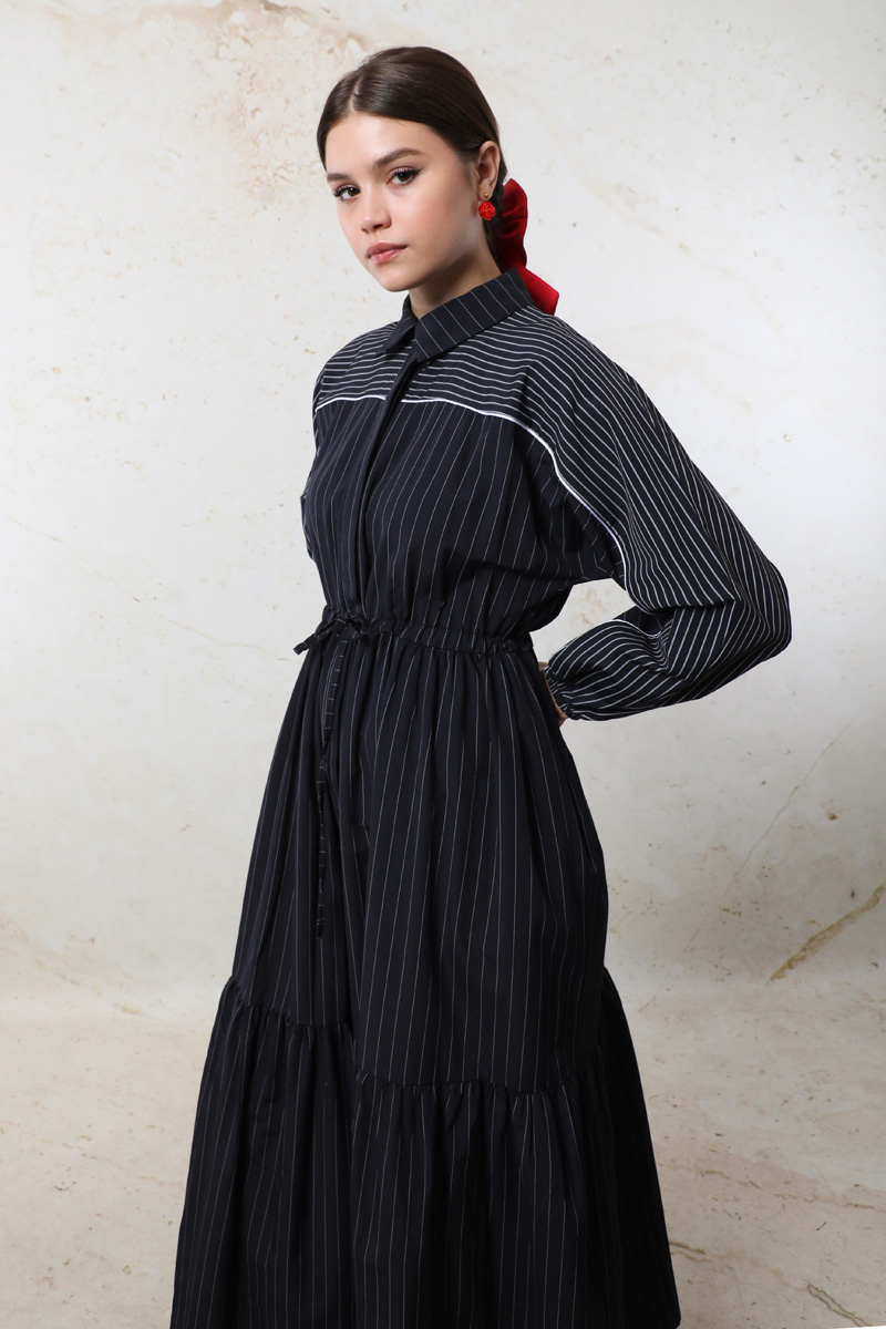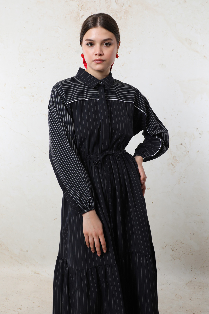 Çizgili Büzgü Elbise Siyah. Gömlek yakalıdır. Ön kısmı gizli düğmelidir. Kolu lastiklidir. Beli tünellidir. Belden sıkmalıdır. Yan ceplidir. Yarım yarasa kolludur. Robalıdır ve Robası garnilidir. Robasında biye vardır. Eteği kesikli ve büzgülüdür.