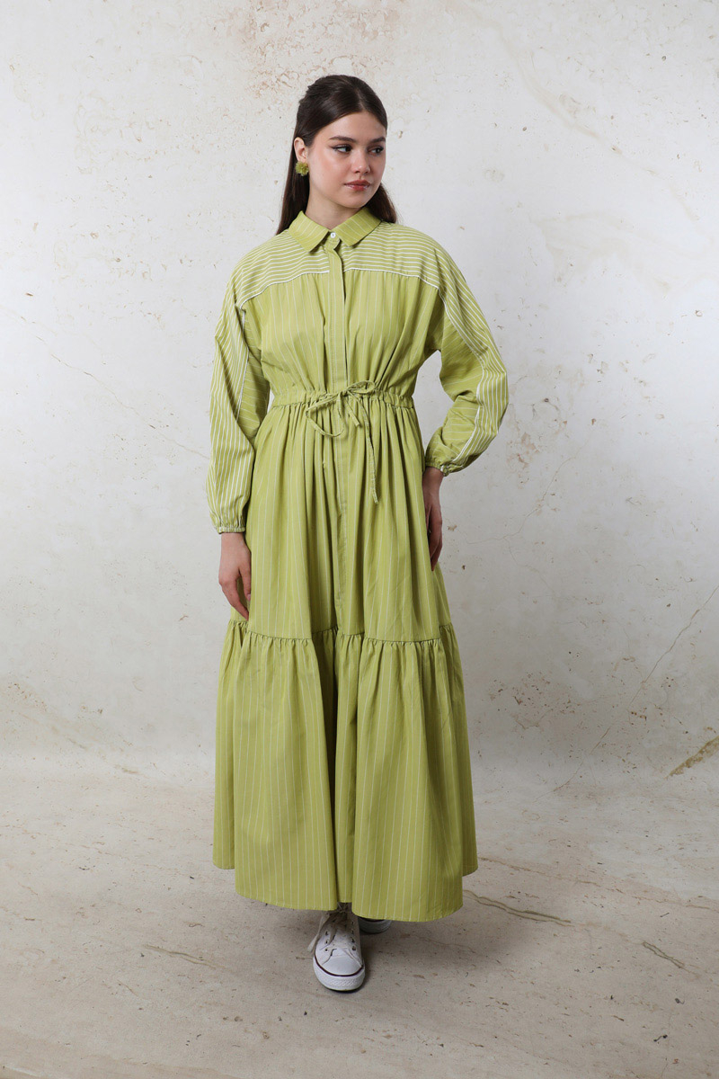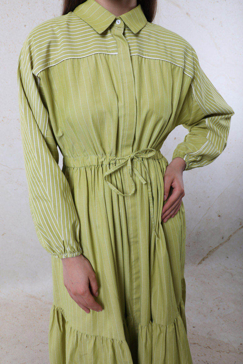 Çizgili Büzgü Elbise Yağ Yeşili