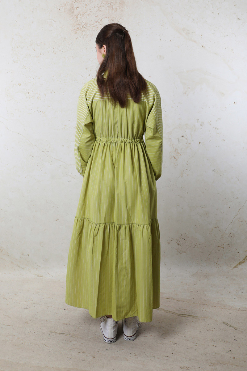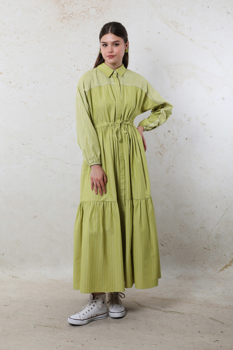 Çizgili Büzgü Elbise Yağ Yeşili. Gömlek yakalıdır. Ön kısmı gizli düğmelidir. Kolu lastiklidir. Beli tünellidir. Belden sıkmalıdır. Yan ceplidir. Yarım yarasa kolludur. Robalıdır ve Robası garnilidir. Robasında biye vardır. Eteği kesikli ve büzgülüdür.