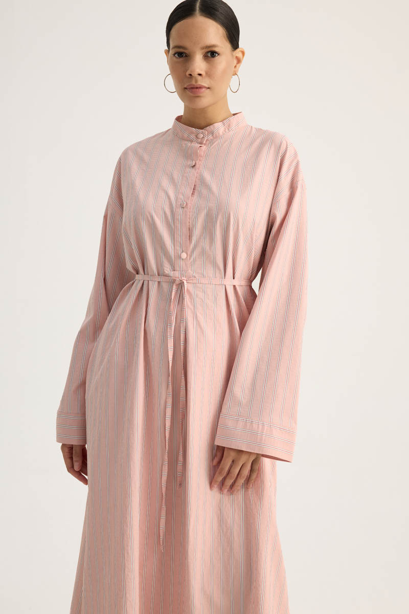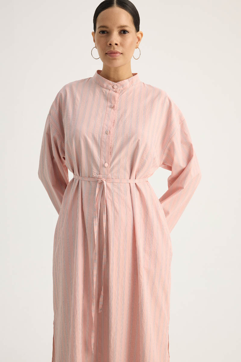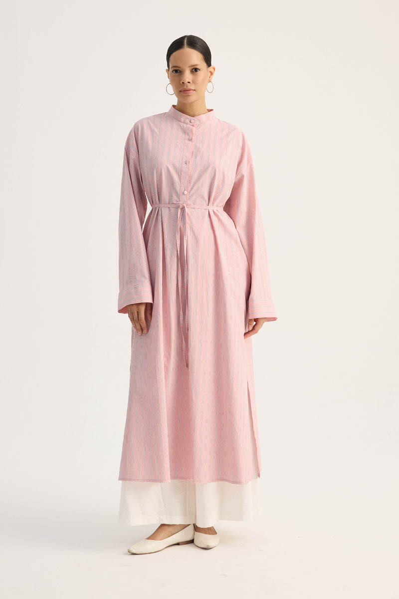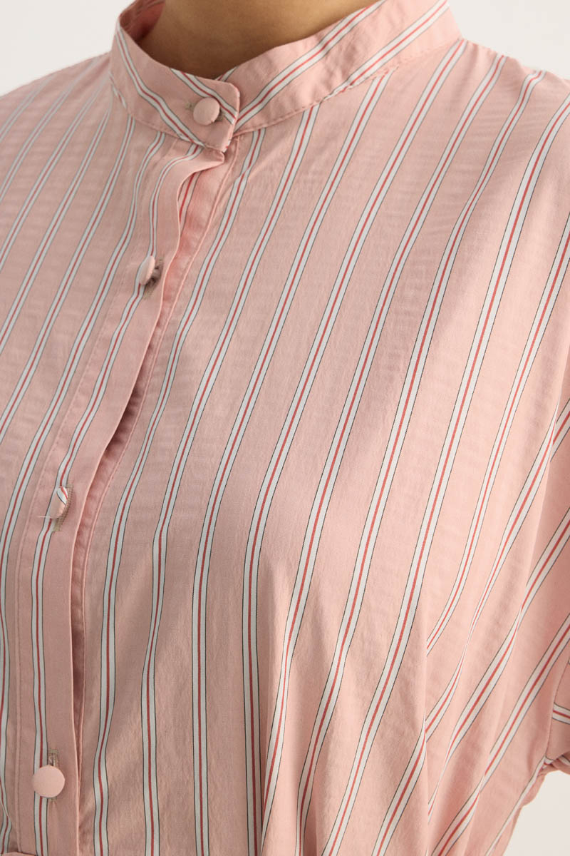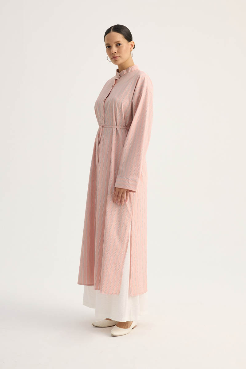 Çizgili Hakim Yaka Tunik Toz Pembe