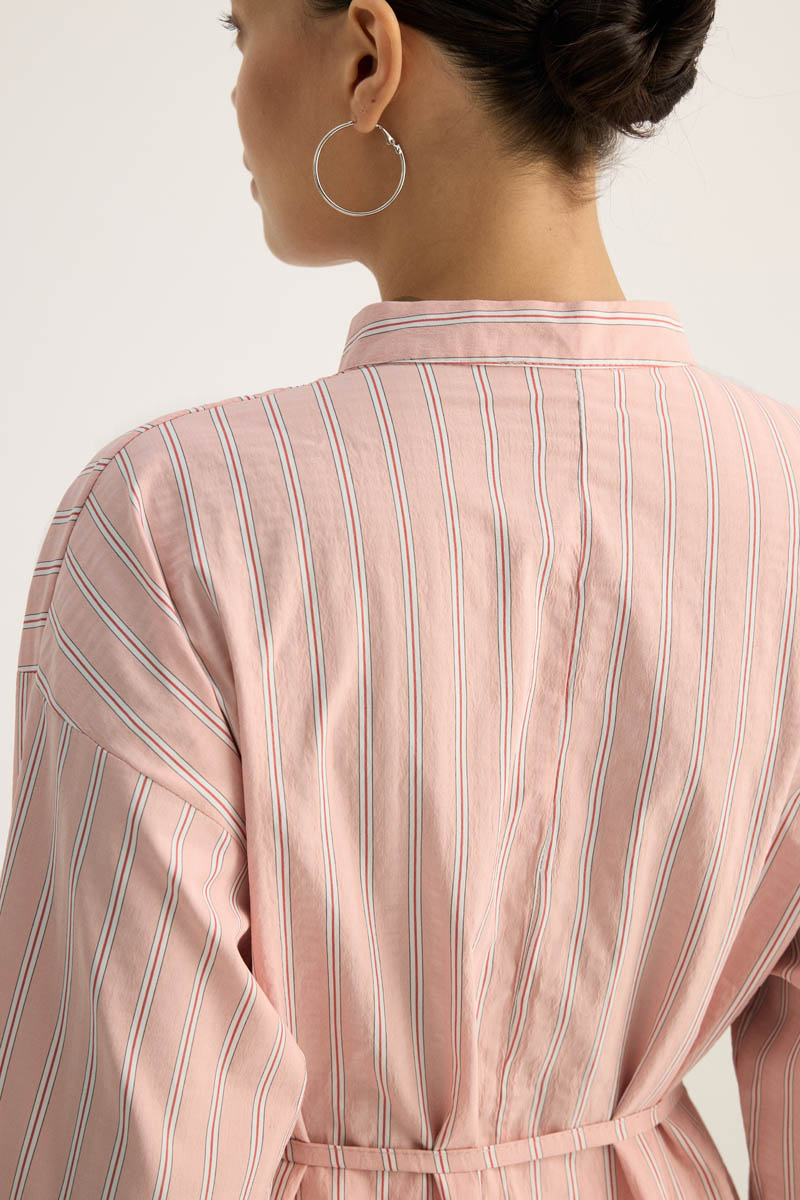 Çizgili Hakim Yaka Tunik Toz Pembe. Gömlek yakadır, önden yarım düğmelidir ve küçük A pile detaylıdır, biye kuşaklıdır, düşük omuzludur, kalın bol manşetlidir, yandan gizli ceplidir, eteği yırtmaçlıdır, kumaşı kendiliğinden çizgilidir. Günlük kullanım ve özel günlerinizde tercih edebilirsiniz.