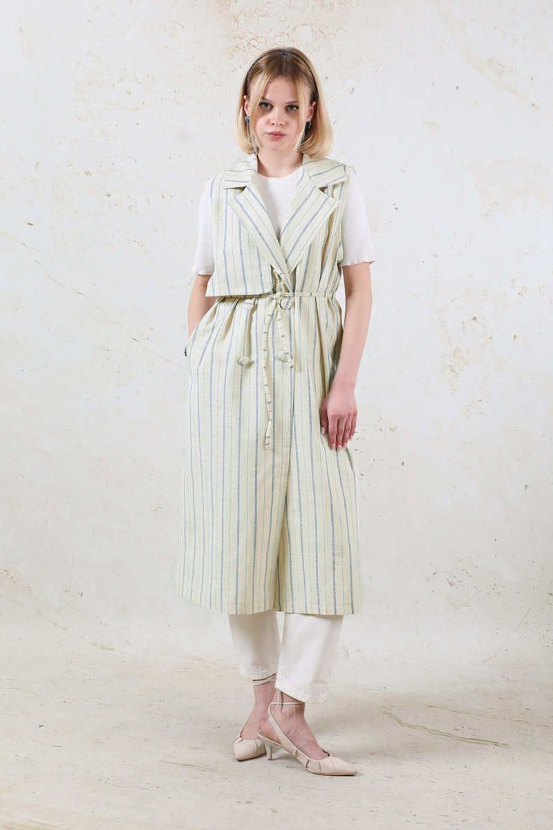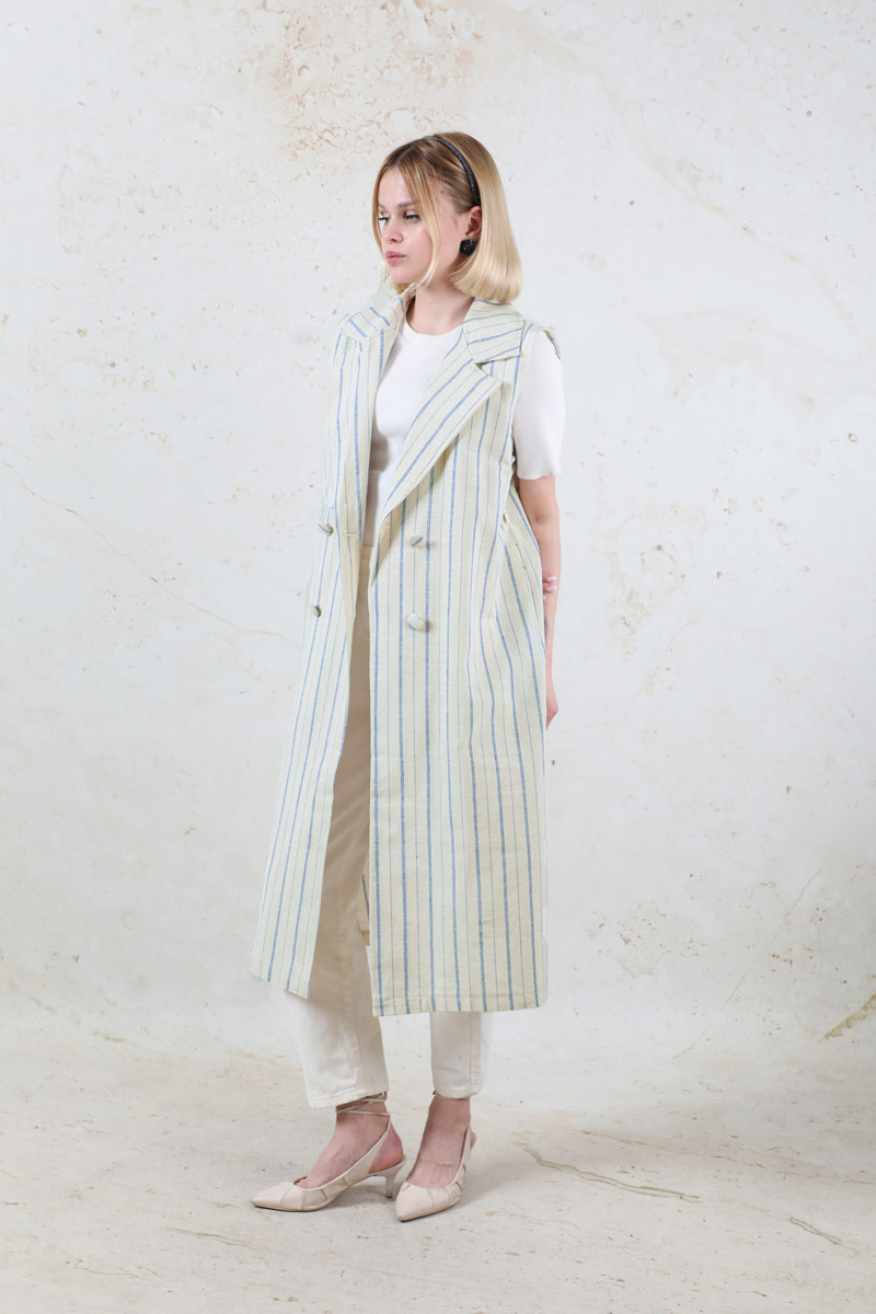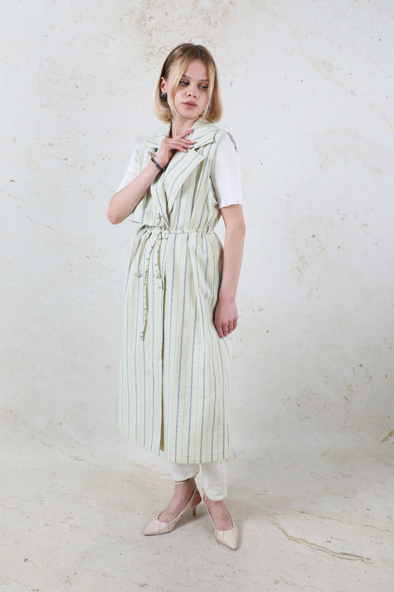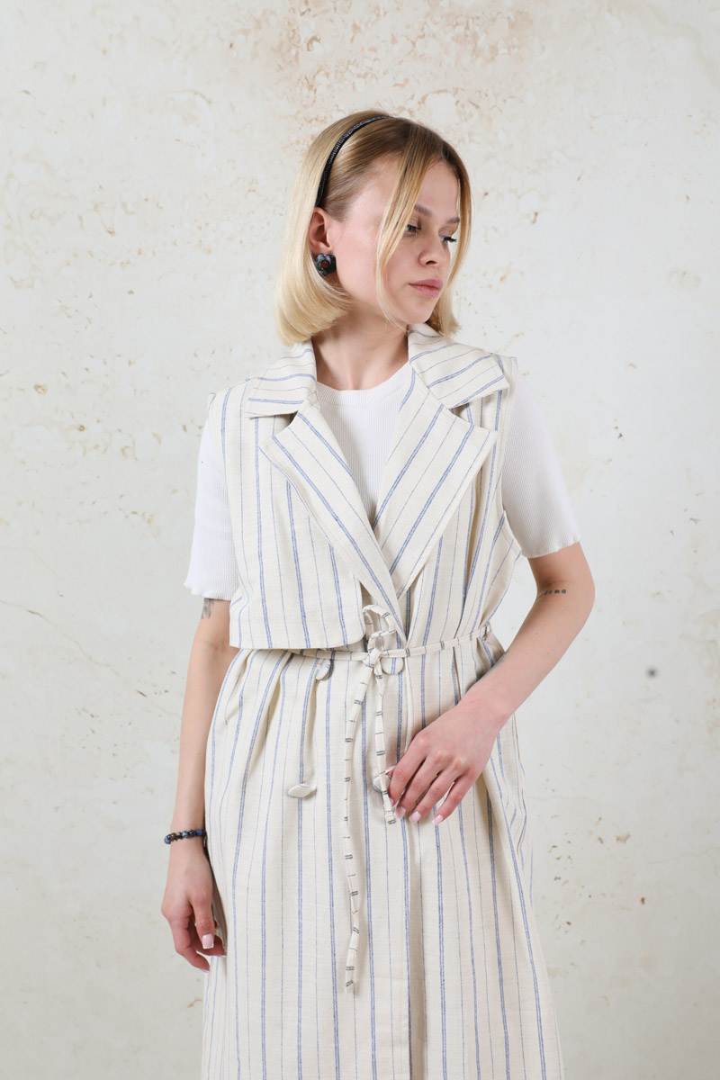 Çizgili Keten Yelek İndigo. Kruvaze kapamalıdır. Rüzgarlık detaylıdır. Yandan ceplidir. İnce kuşaklıdır.Günlük kullanım ve özel günlerinizde tercih edebilirsiniz.