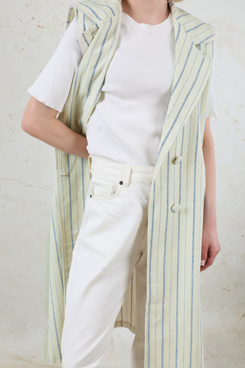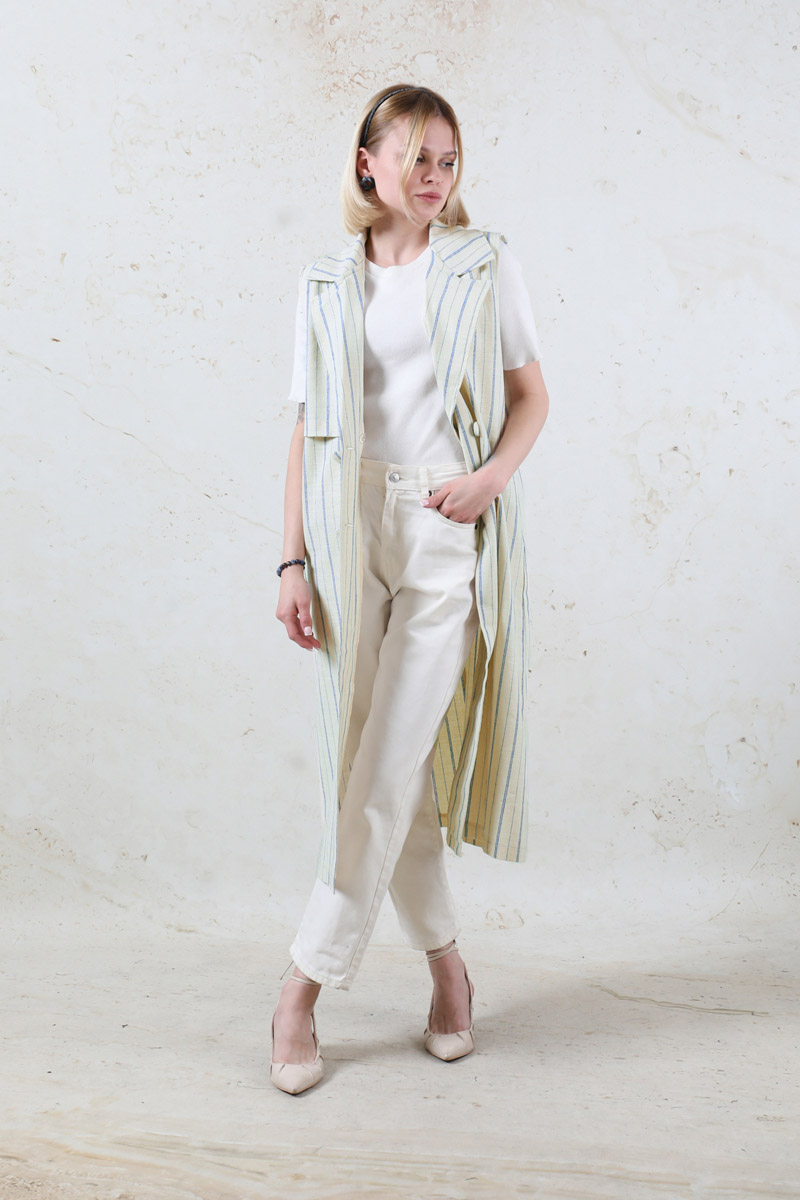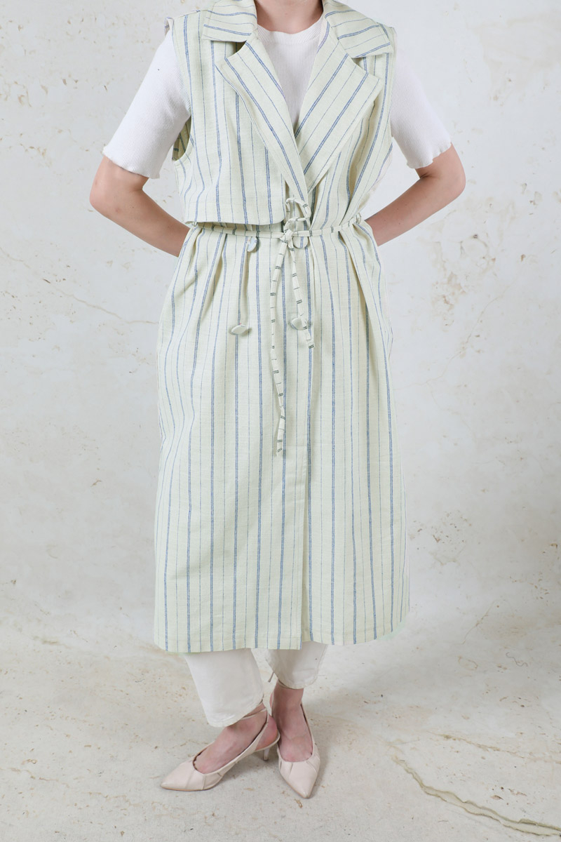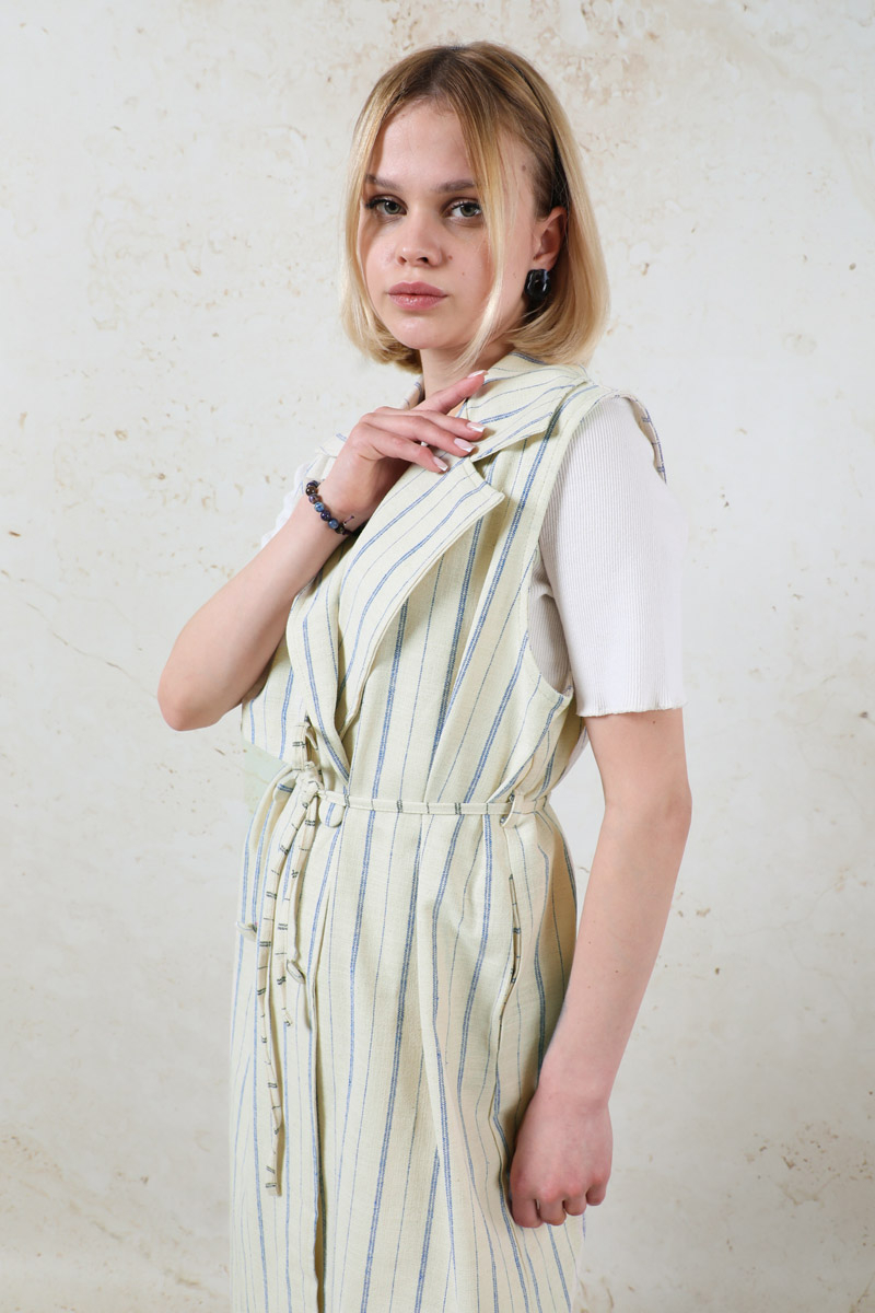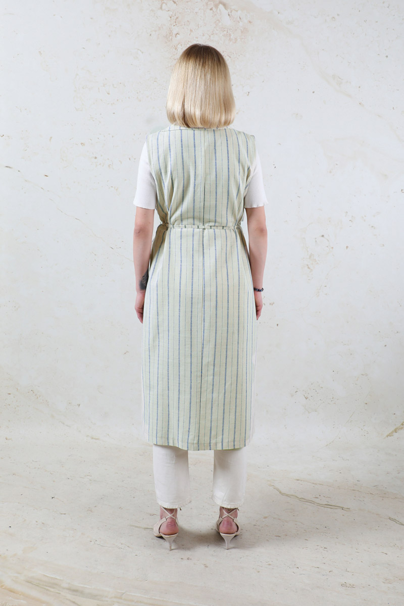Çizgili Keten Yelek İndigo. Kruvaze kapamalıdır. Rüzgarlık detaylıdır. Yandan ceplidir. İnce kuşaklıdır.Günlük kullanım ve özel günlerinizde tercih edebilirsiniz.