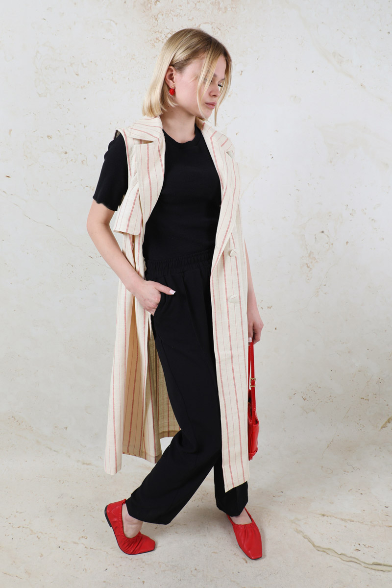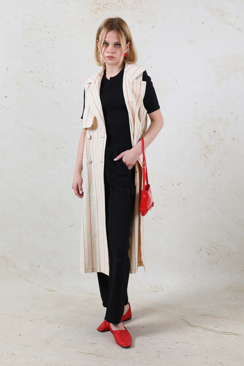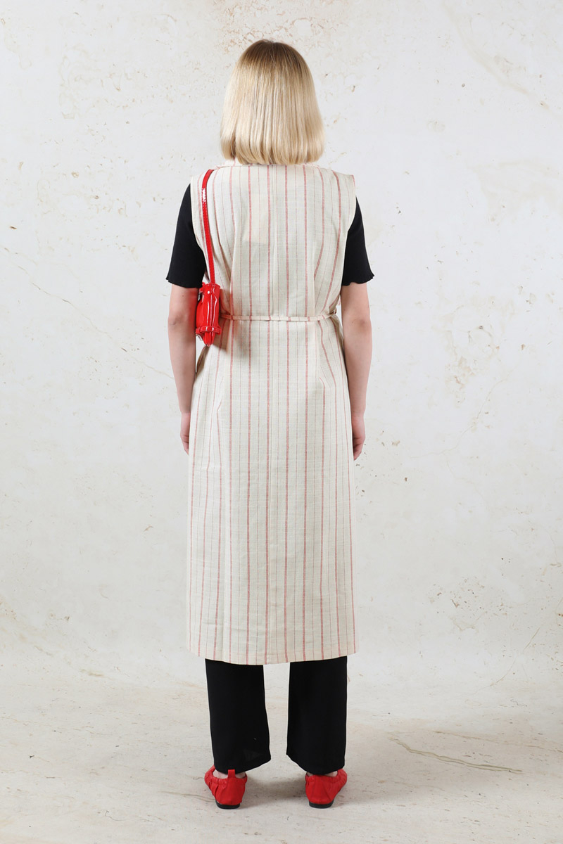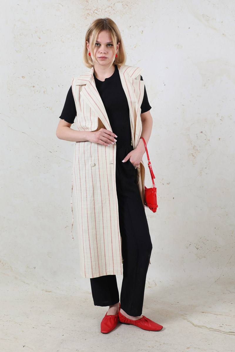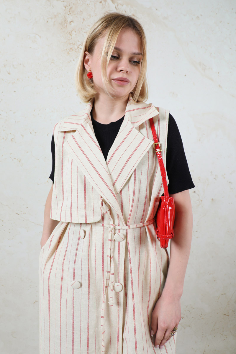 Çizgili Keten Yelek Kırmızı