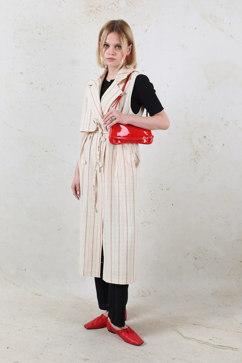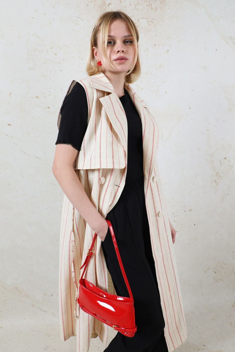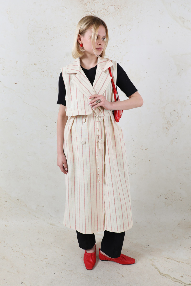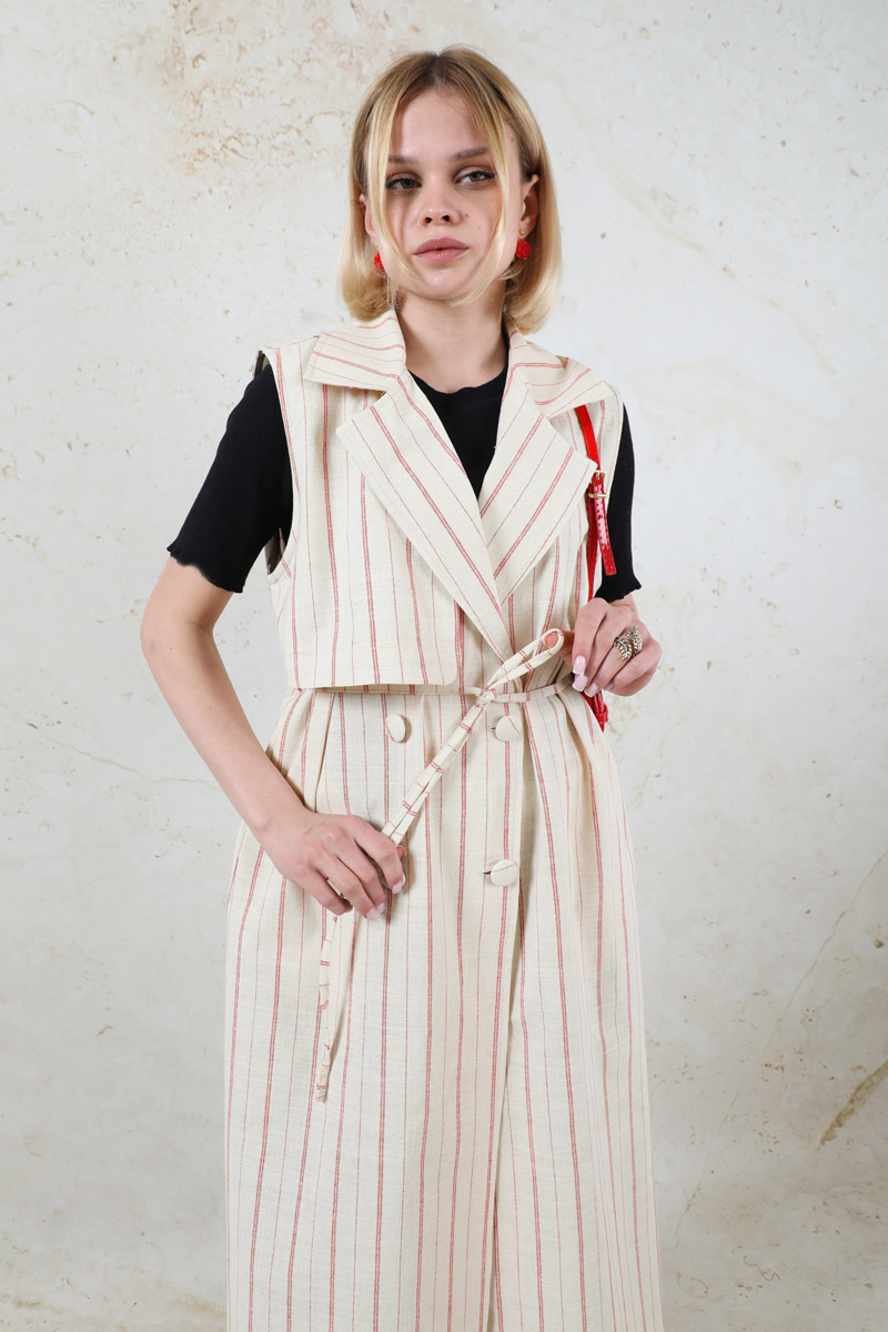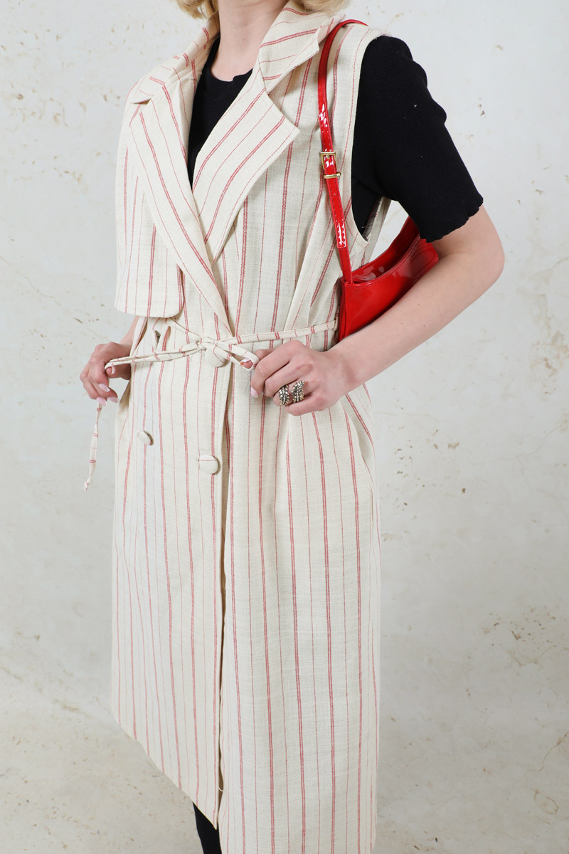 Çizgili Keten Yelek Kırmızı. Kruvaze kapamalıdır. Rüzgarlık detaylıdır. Yandan ceplidir. İnce kuşaklıdır.Günlük kullanım ve özel günlerinizde tercih edebilirsiniz.