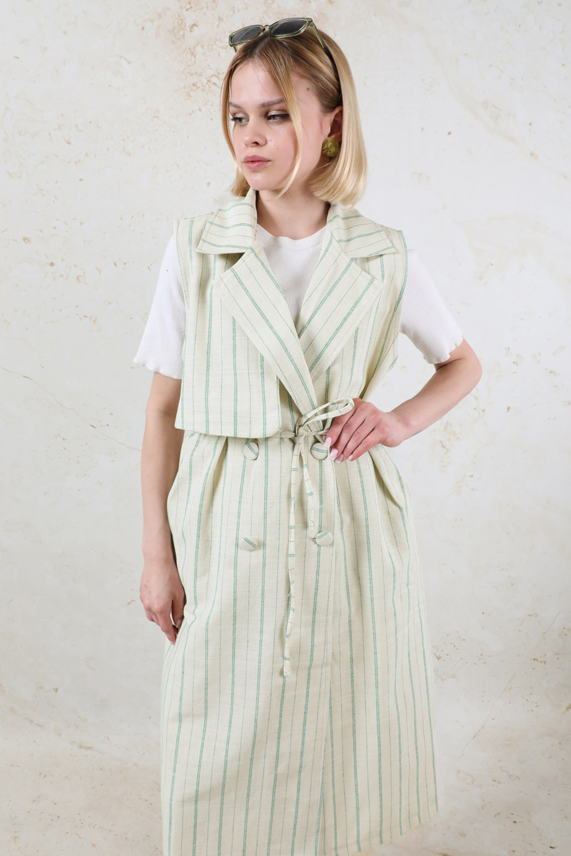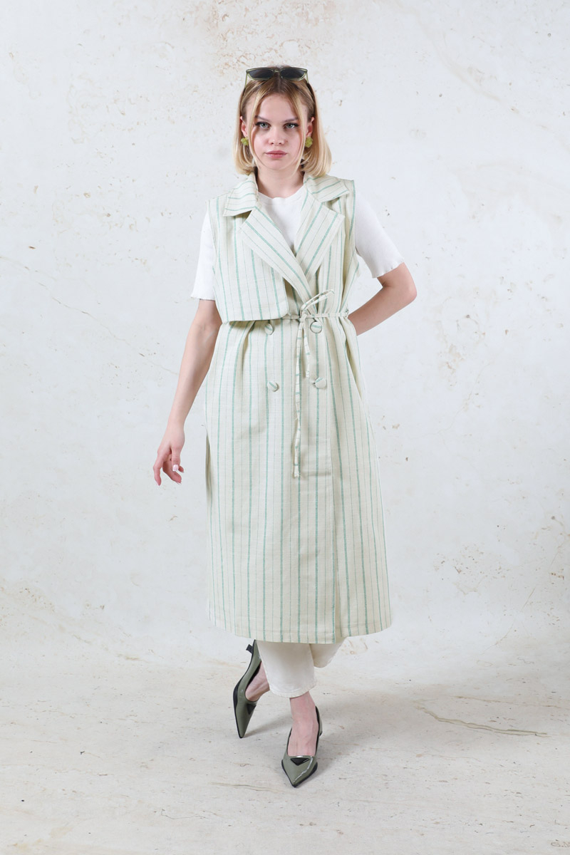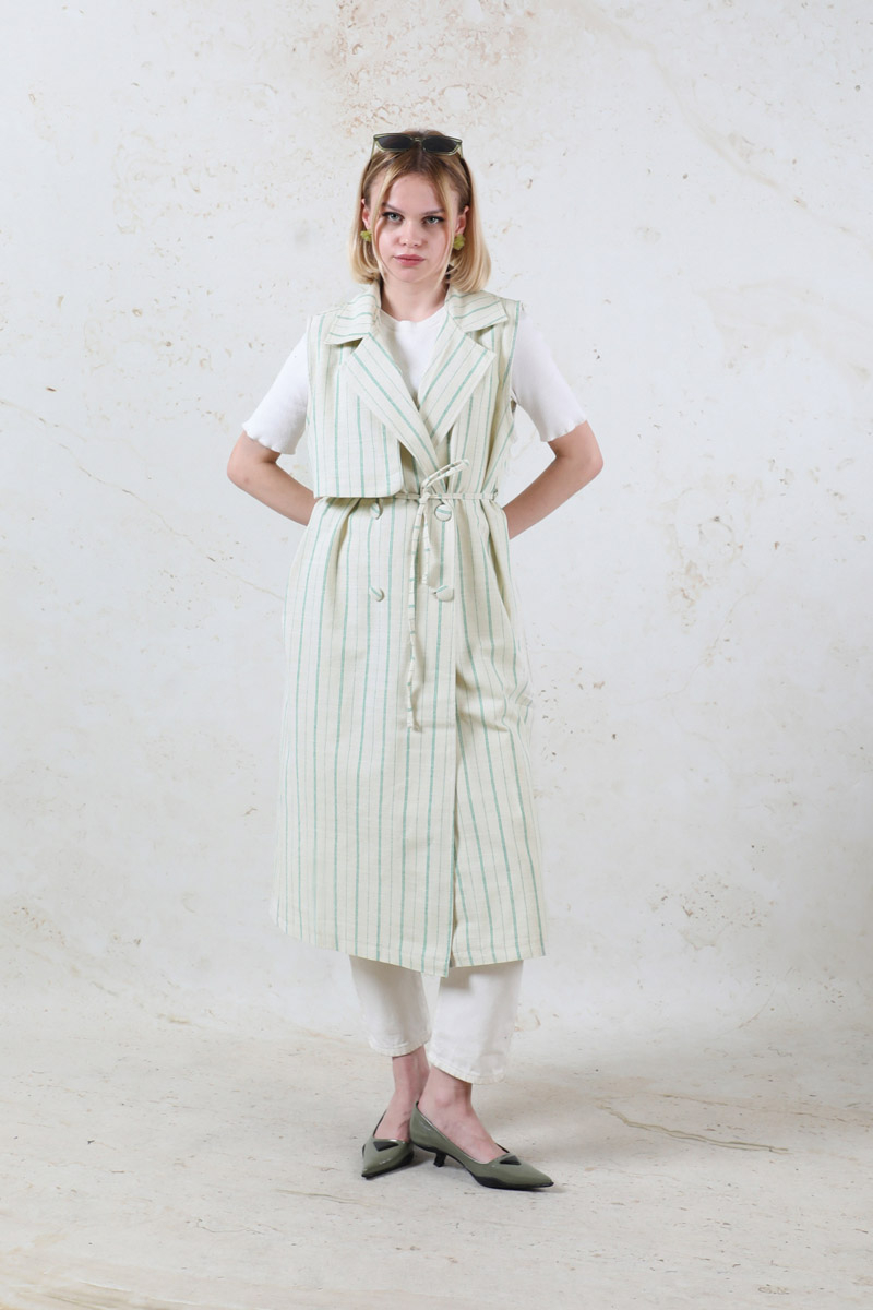 Çizgili Keten Yelek Mint. Kruvaze kapamalıdır. Rüzgarlık detaylıdır. Yandan ceplidir. İnce kuşaklıdır.Günlük kullanım ve özel günlerinizde tercih edebilirsiniz.