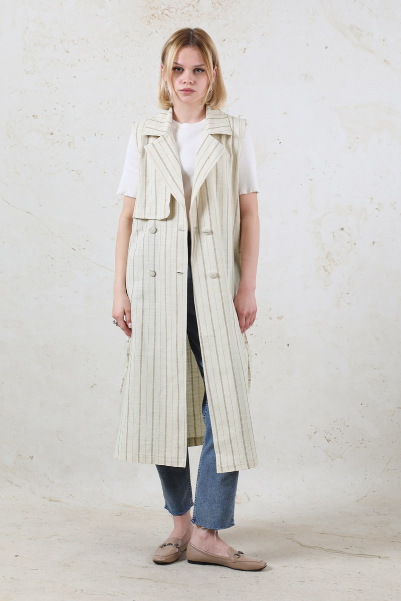 Çizgili Keten Yelek Vizon