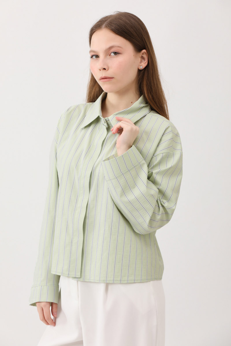 Çizgili Kısa Gömlek Açık Yeşil. Gömlek yakadır, önden gizli düğmelidir, düşük omuzludur, kalın bol manşetlidir, kumaşı kendiliğinden çizgilidir. Günlük kullanım ve özel günlerinizde tercih edebilirsiniz.