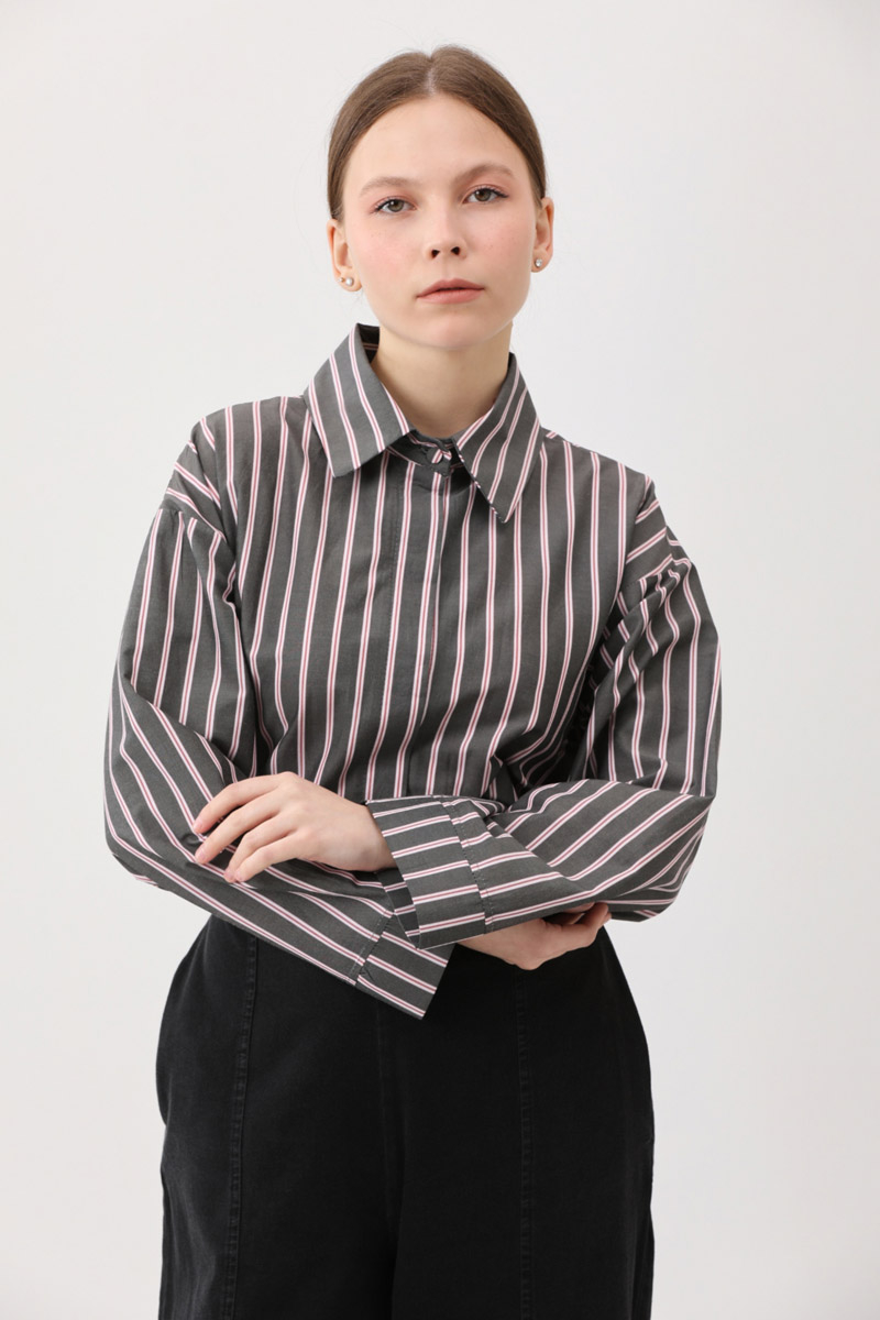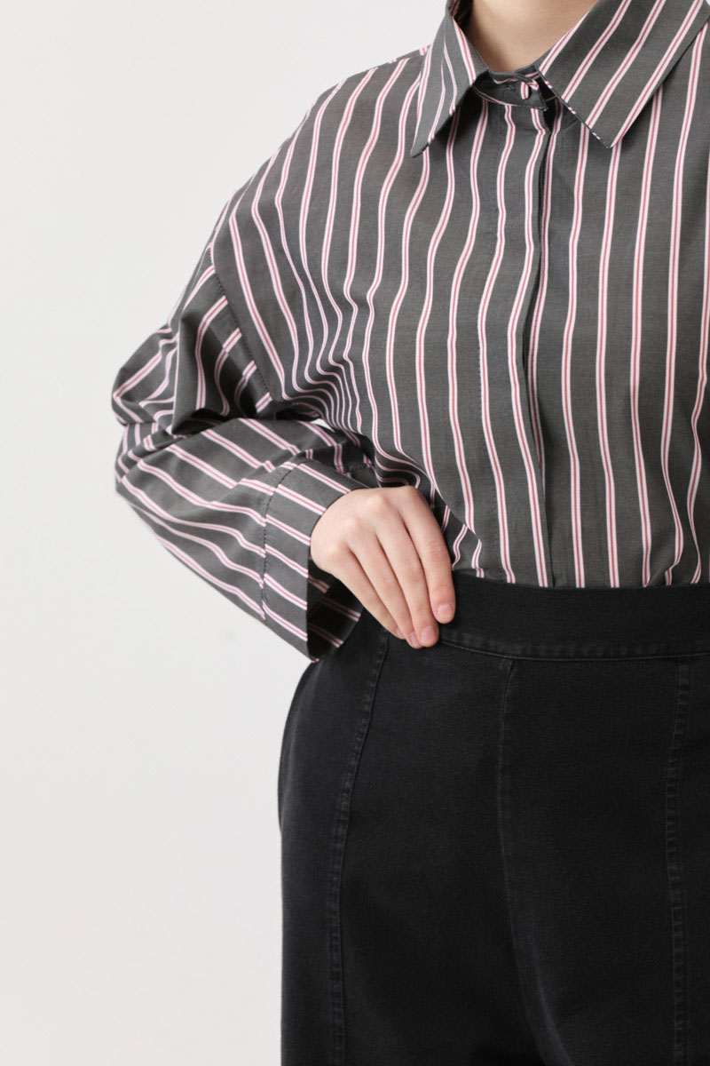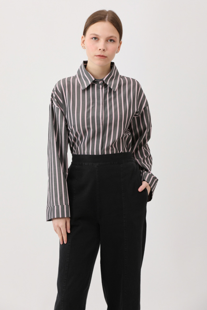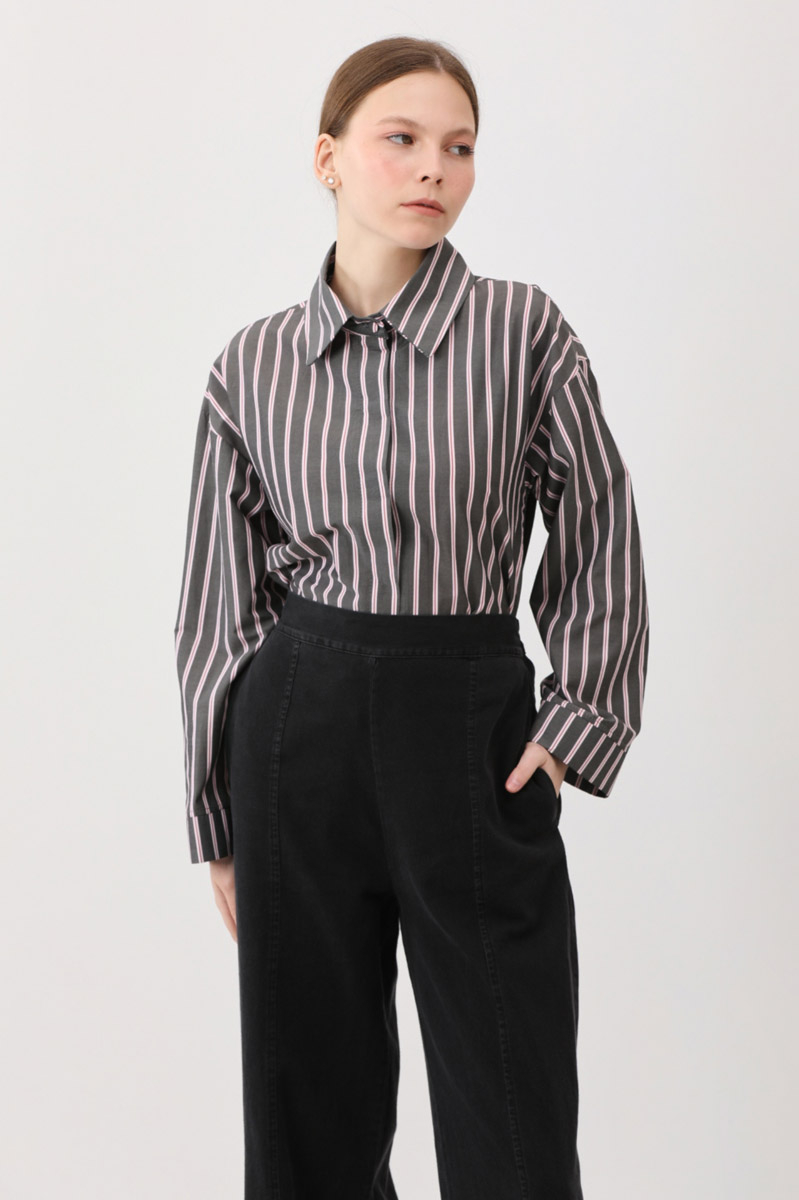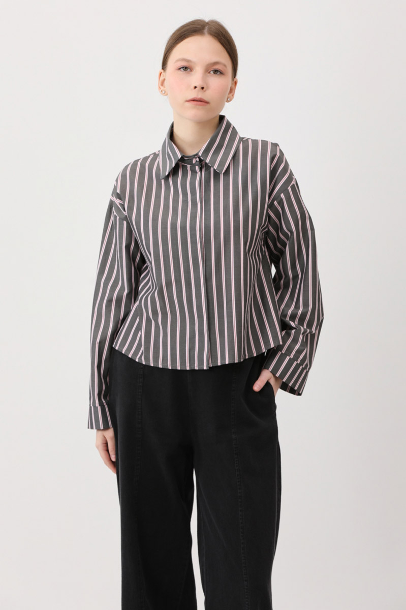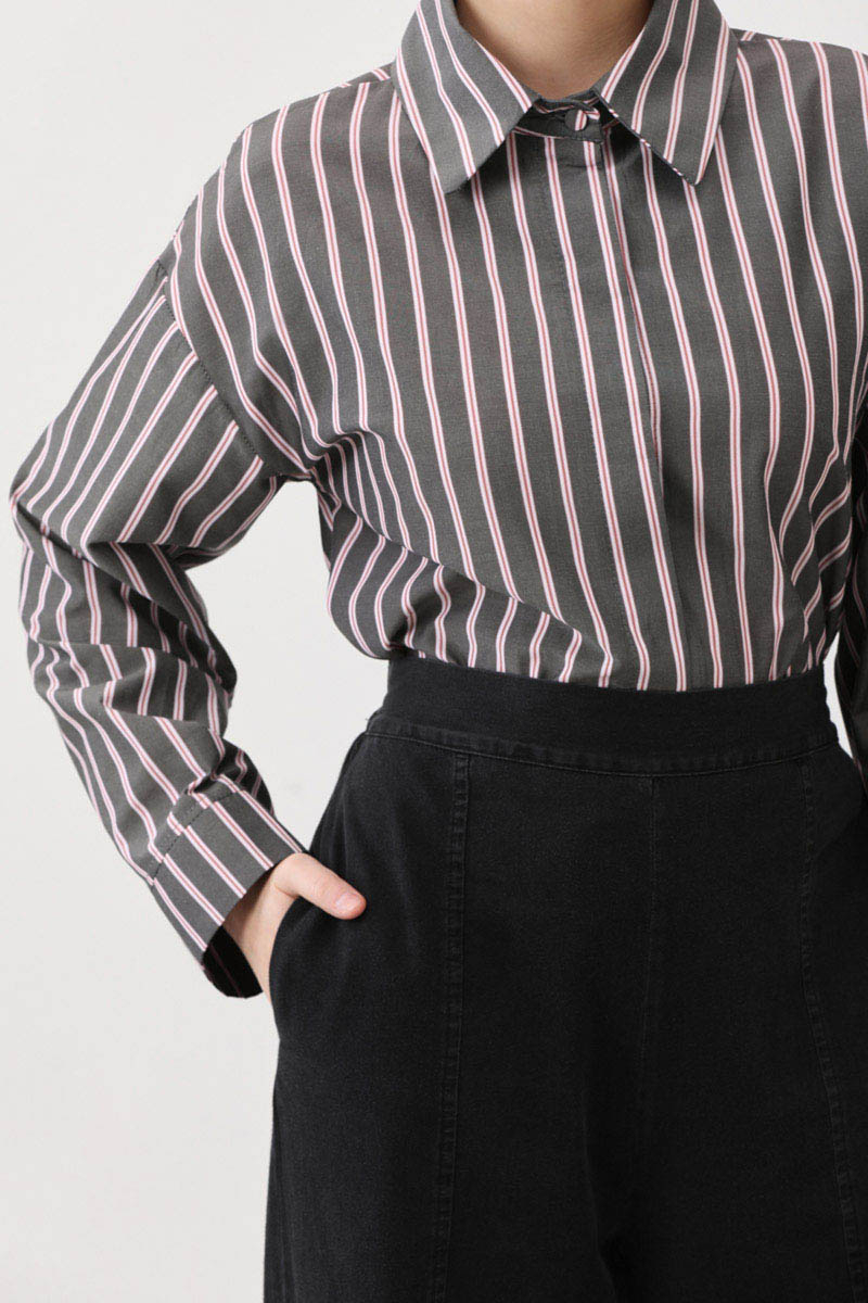 Çizgili Kısa Gömlek Siyah. Gömlek yakadır, önden gizli düğmelidir, düşük omuzludur, kalın bol manşetlidir, kumaşı kendiliğinden çizgilidir. Günlük kullanım ve özel günlerinizde tercih edebilirsiniz.