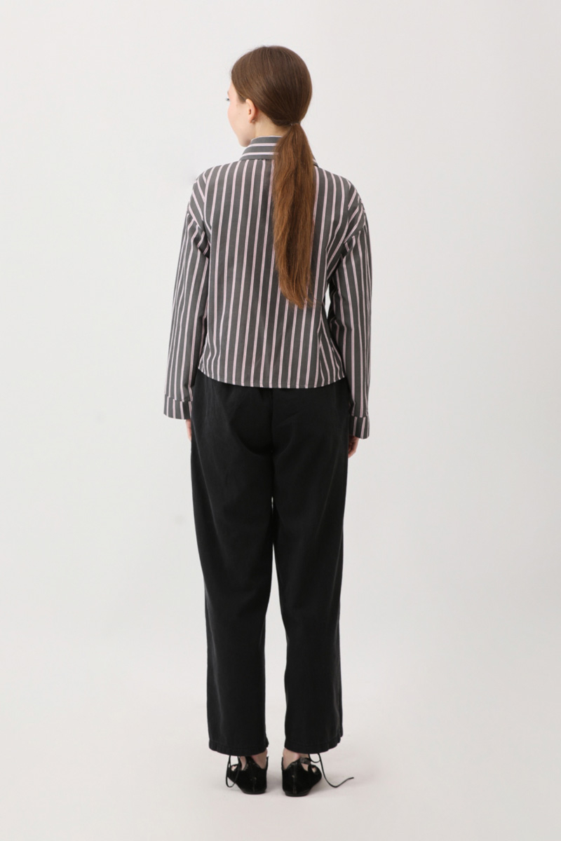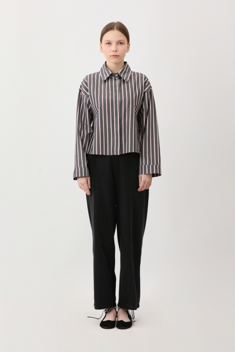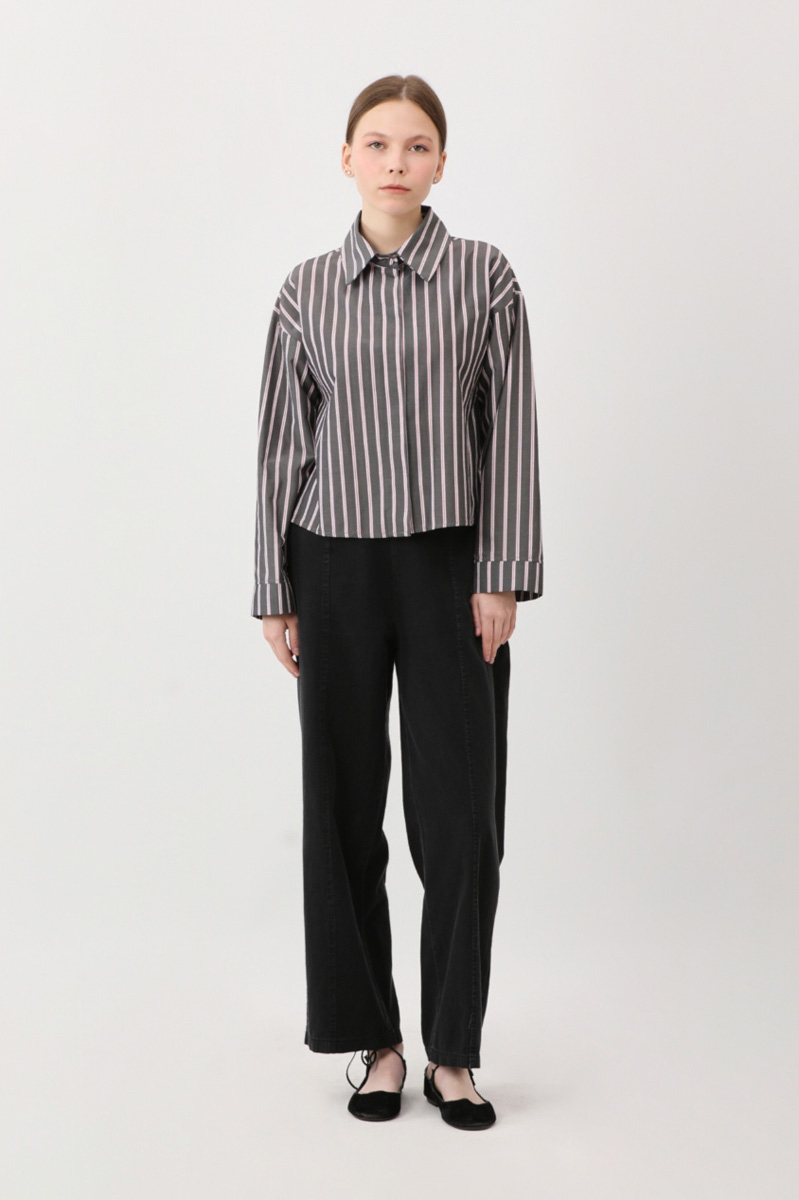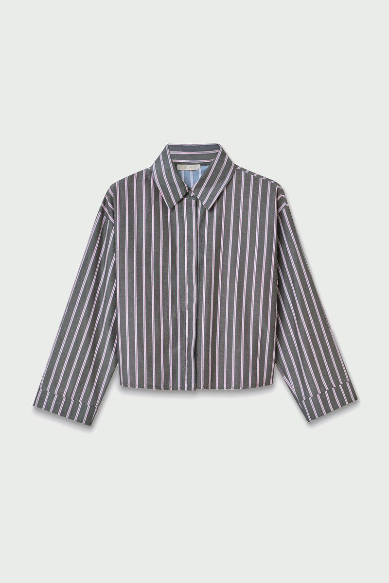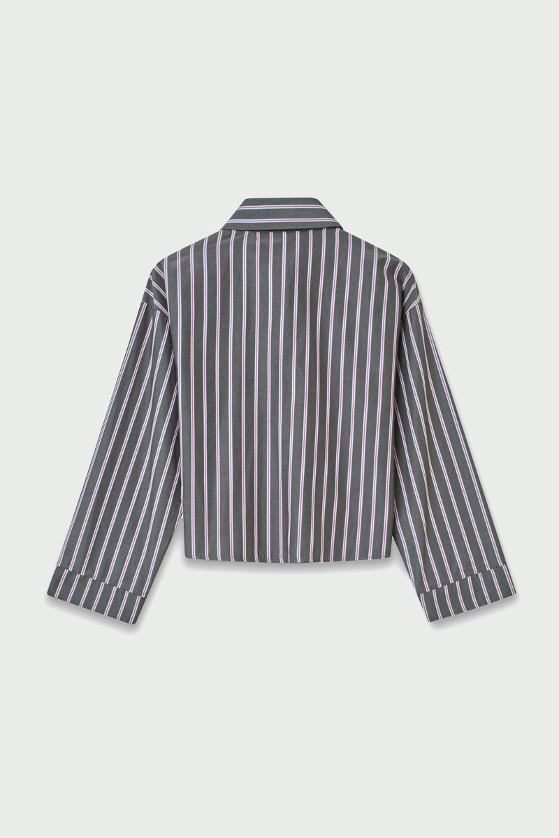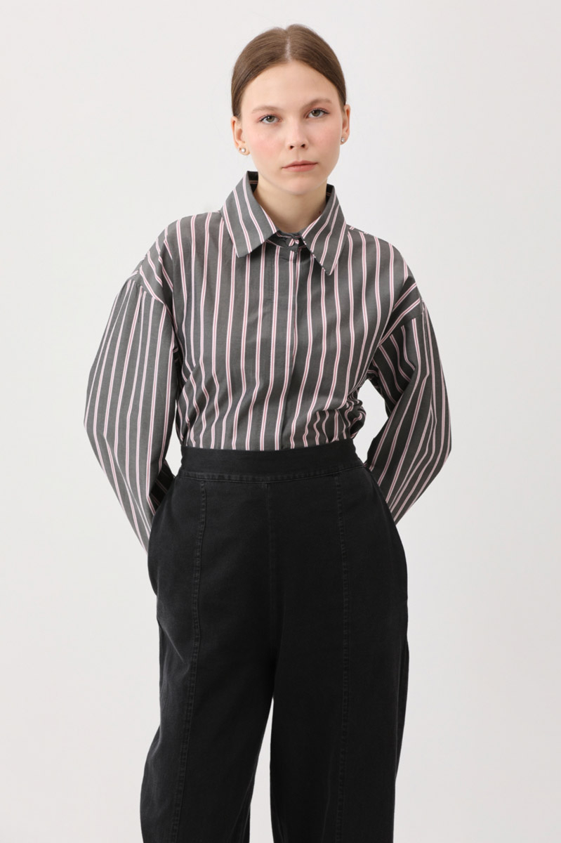 Çizgili Kısa Gömlek Siyah. Gömlek yakadır, önden gizli düğmelidir, düşük omuzludur, kalın bol manşetlidir, kumaşı kendiliğinden çizgilidir. Günlük kullanım ve özel günlerinizde tercih edebilirsiniz.