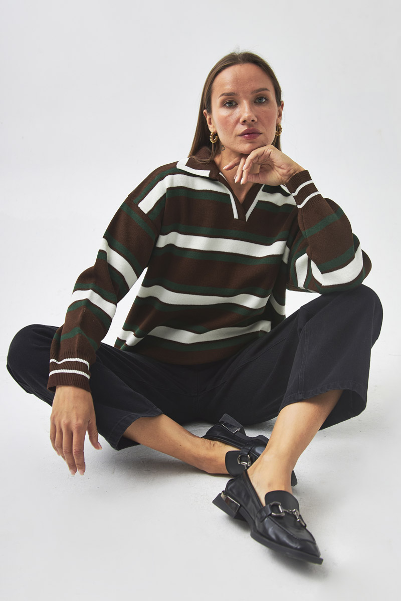 Çizgili Polo Kazak Kahverengi, modern ve dinamik tasarımıyla günlük stilinize enerji katıyor. Polo yaka formu ve kahverengi-bebe mavisi çizgili deseniyle retro bir hava sunarken, rahat kalıbı sayesinde konforlu bir kullanım sağlar. Hem ofis hem de günlük kombinlerde kolaylıkla tercih edilebilecek çok yönlü bir parçadır.