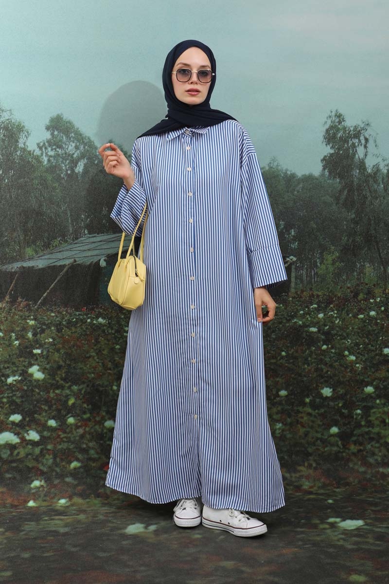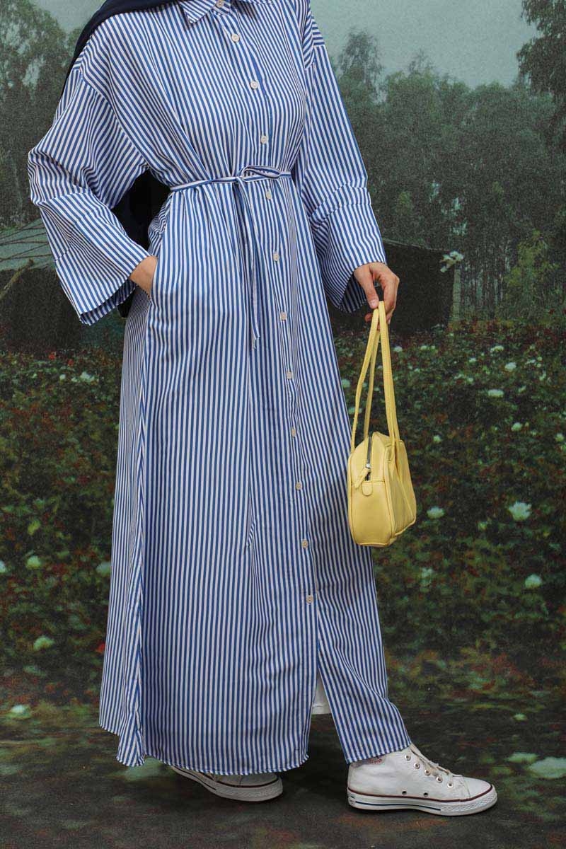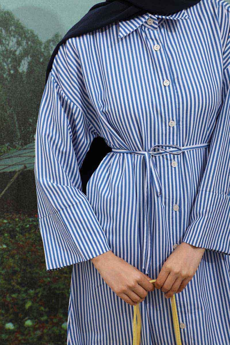 Çizgili Poplin Gömlek Elbise İndigo. Ürünümüz önden düğmelidir. İnce kuşaklıdır. Kalın manşet detaylı günlük hayatınızda tercih edebileceğiniz gömlek elbisedir.