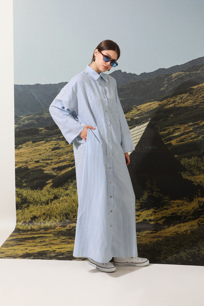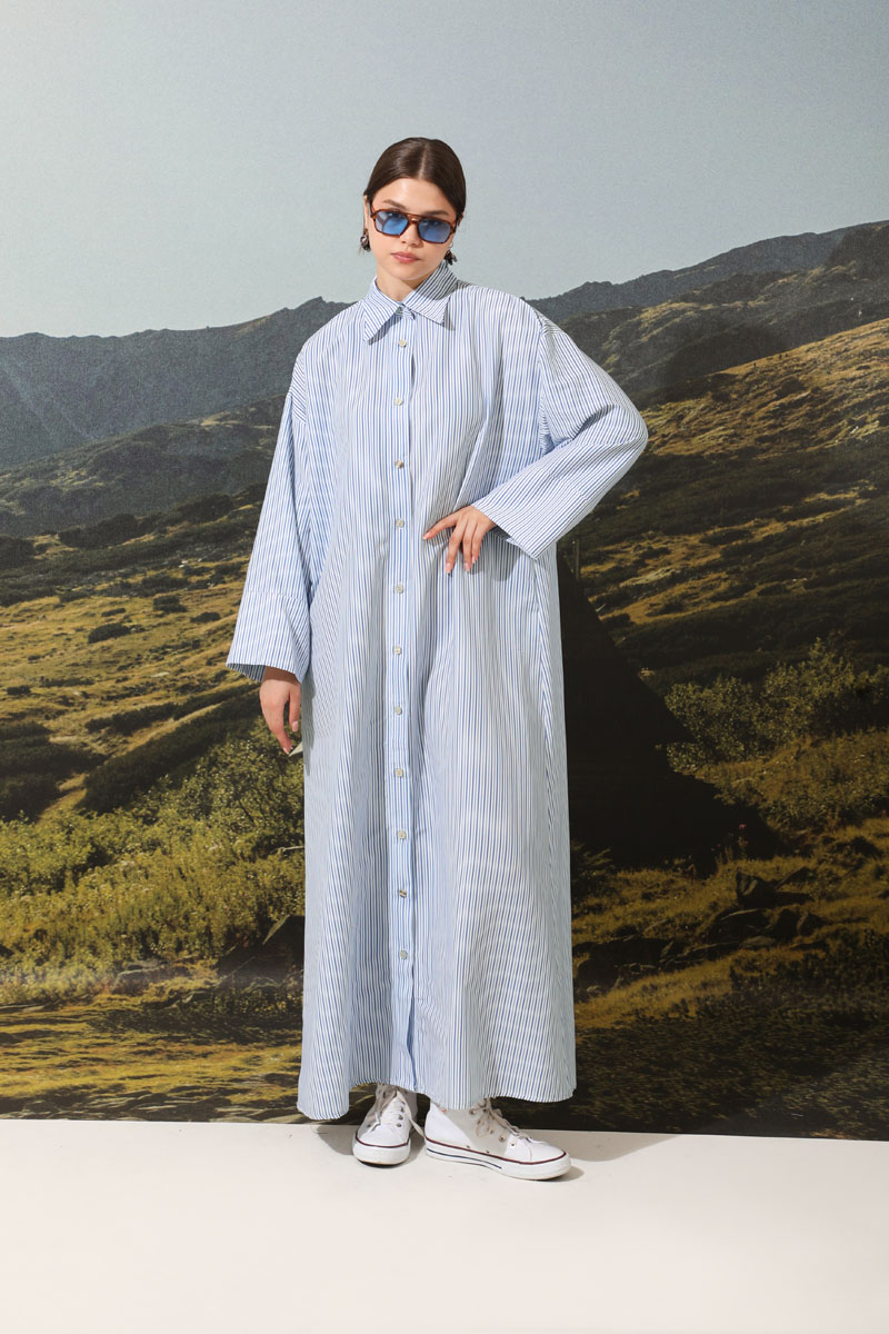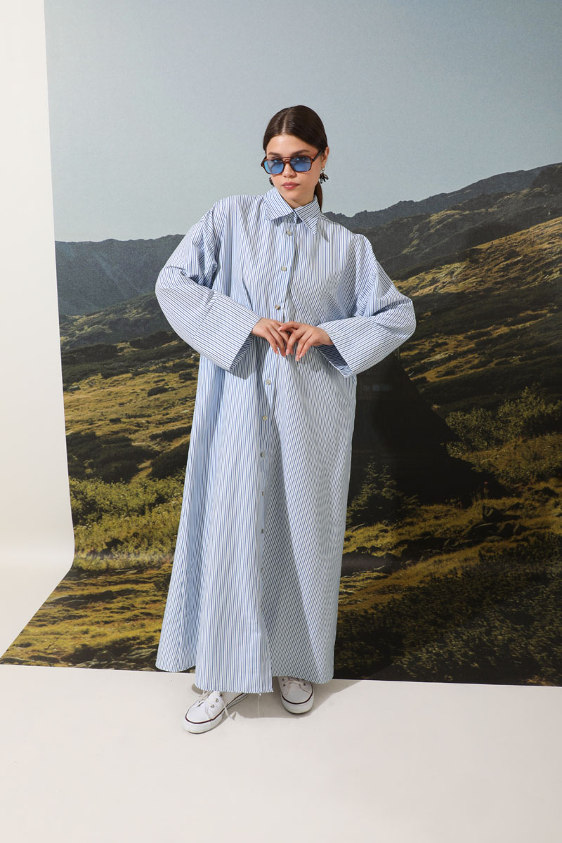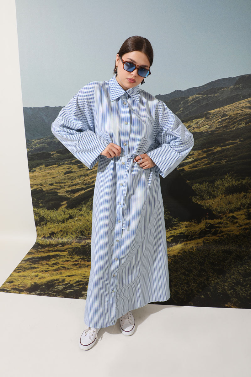 Çizgili Poplin Gömlek Elbise Mavi. Ürünümüz önden düğmelidir. İnce kuşaklıdır.Kalın manşet detaylıdır. Günlük hayatınızda abaya, tunik veya elbise olarak tercih edebilirsiniz