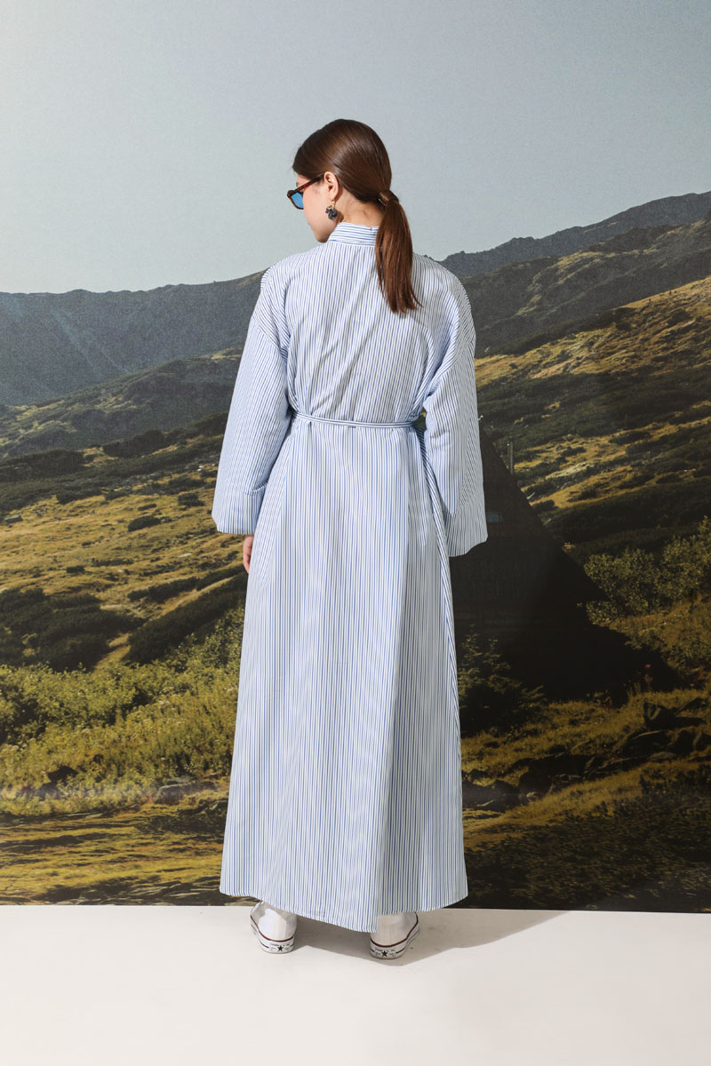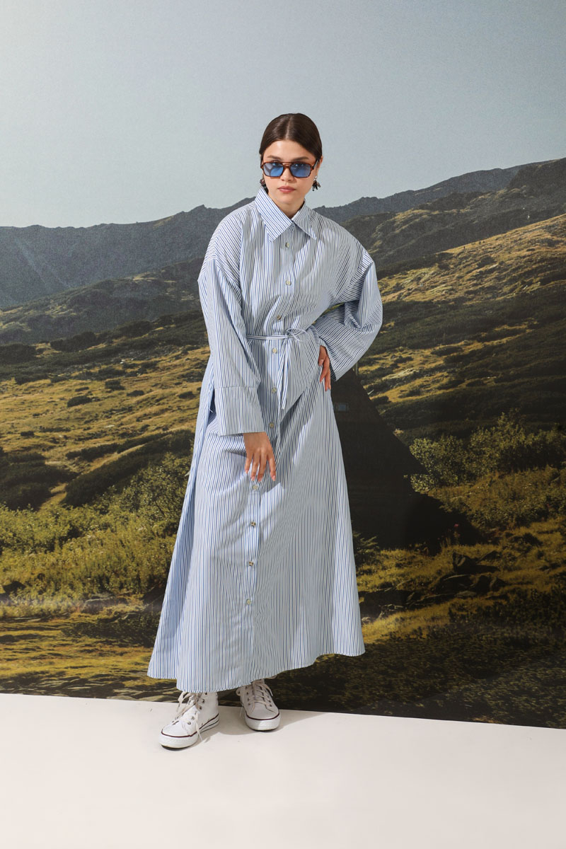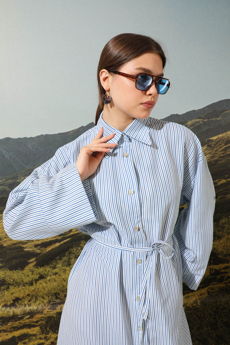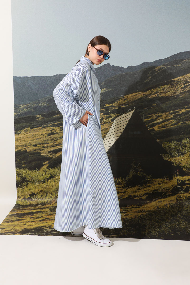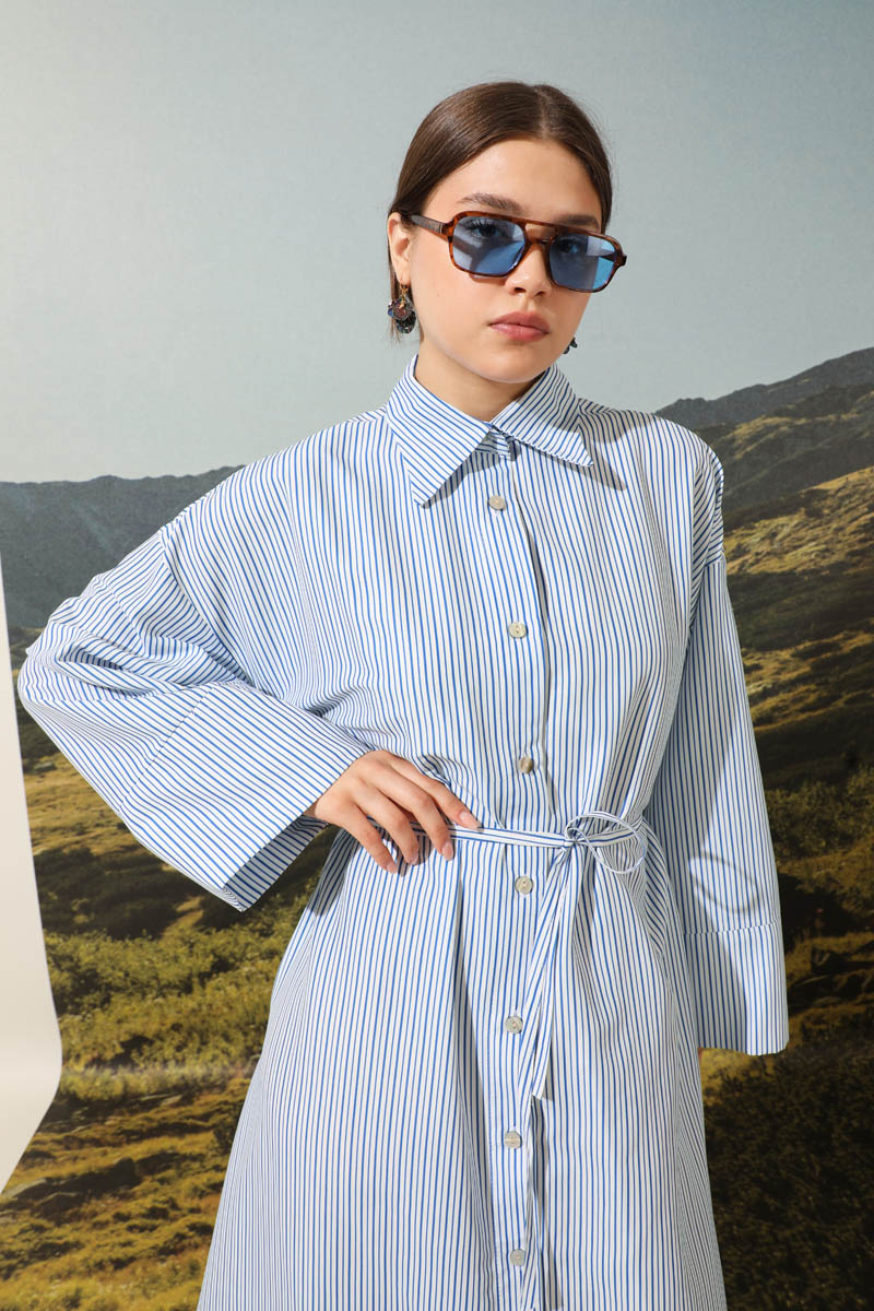 Çizgili Poplin Gömlek Elbise Mavi. Ürünümüz önden düğmelidir. İnce kuşaklıdır.Kalın manşet detaylıdır. Günlük hayatınızda abaya, tunik veya elbise olarak tercih edebilirsiniz