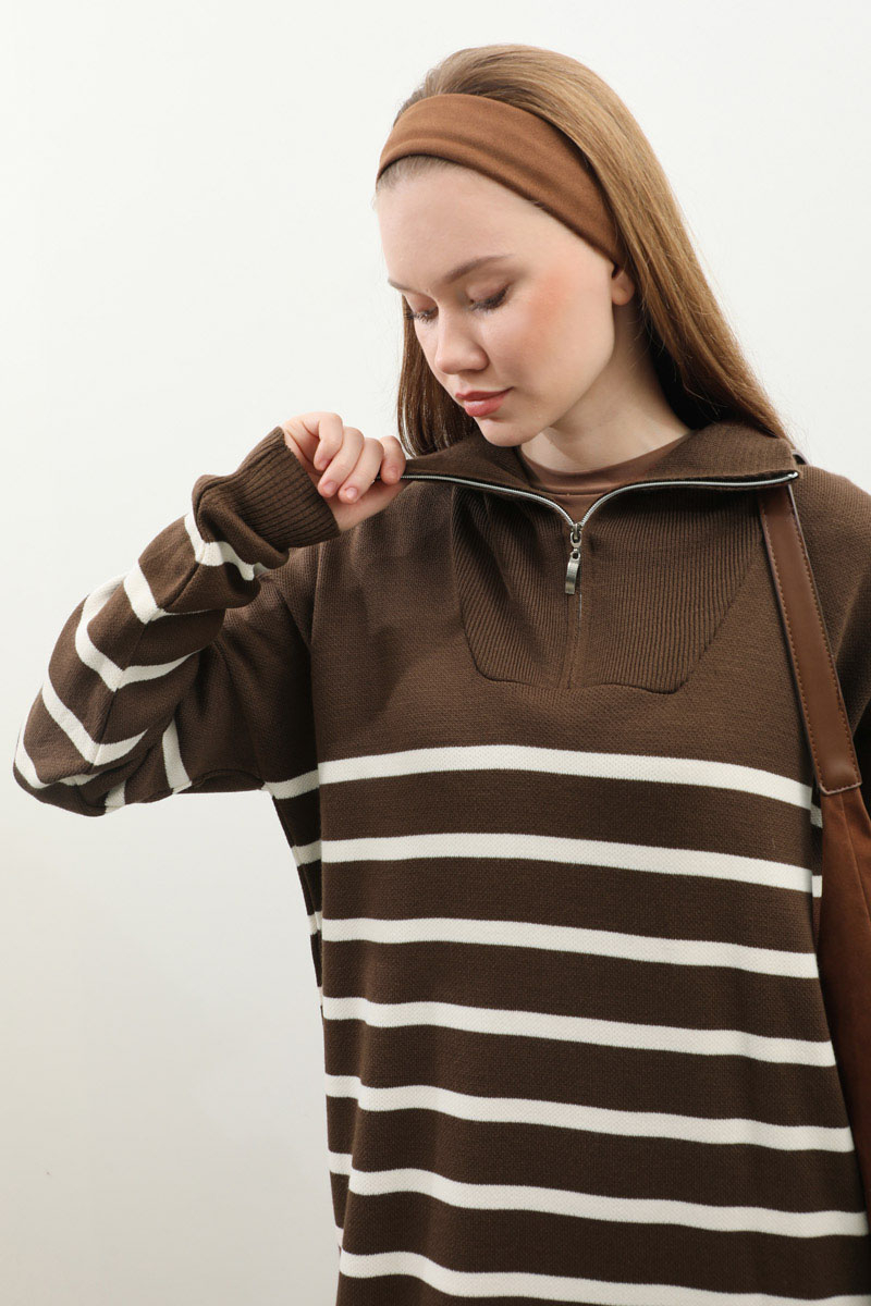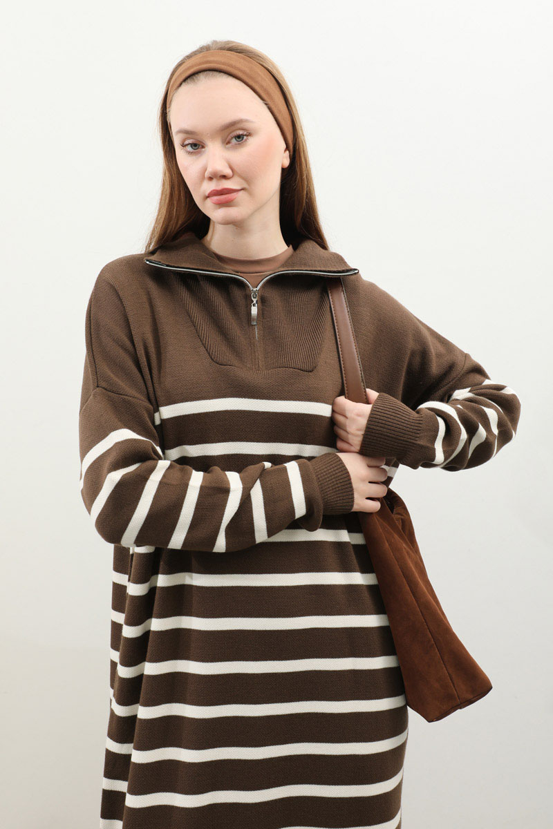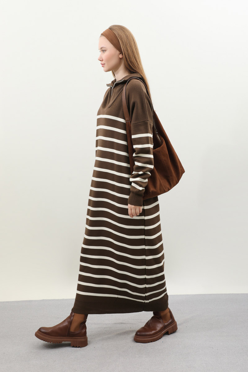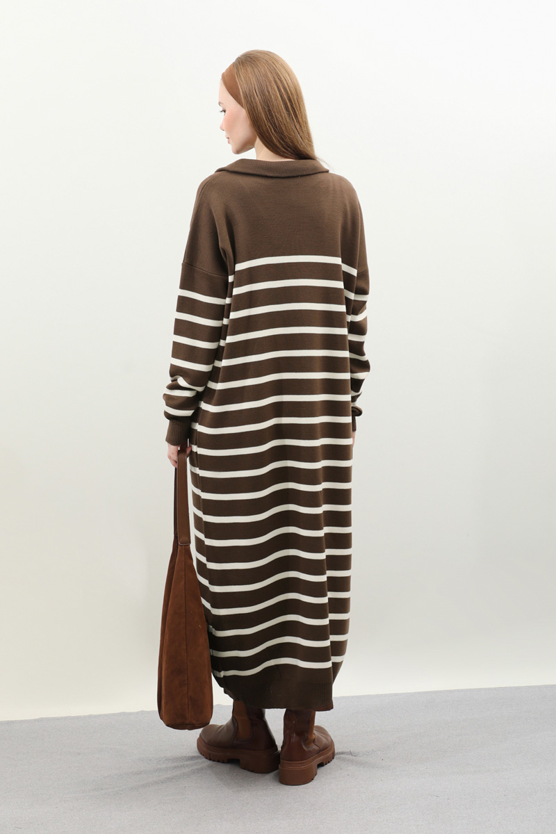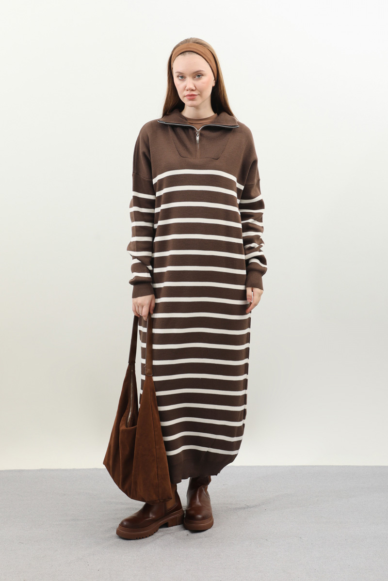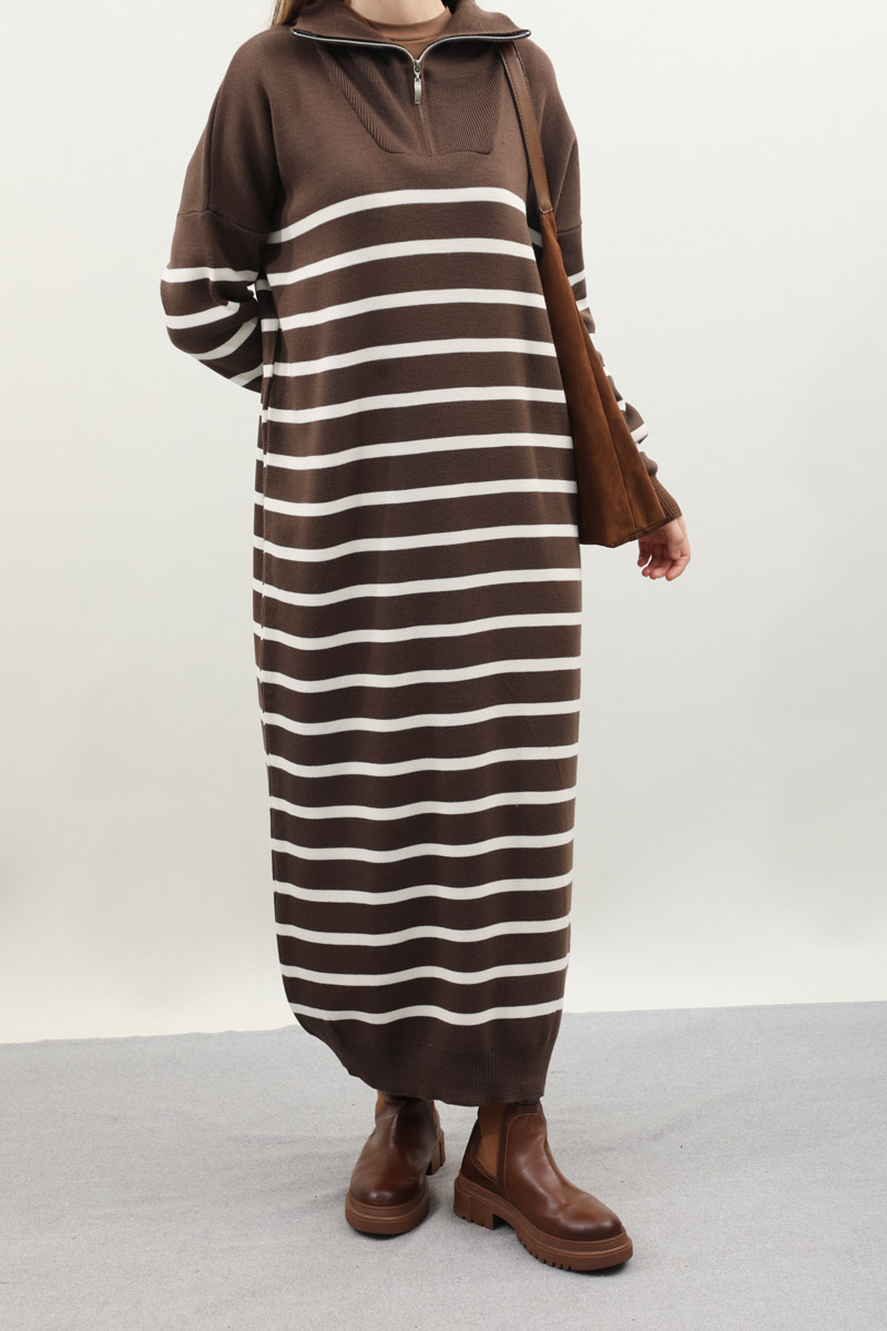 Çizgili Uzun Elbise Kahverengi. Fermuar detaylı balıkçı yakadır, düşük kolludur, manşet ve etek ucu ribanalıdır. kollar ve bedeninde cizgi detaylıdır, cepsizdir, astarsızdır. Günlük kullanım ve özel günlerinizde tercih edebilirsiniz.