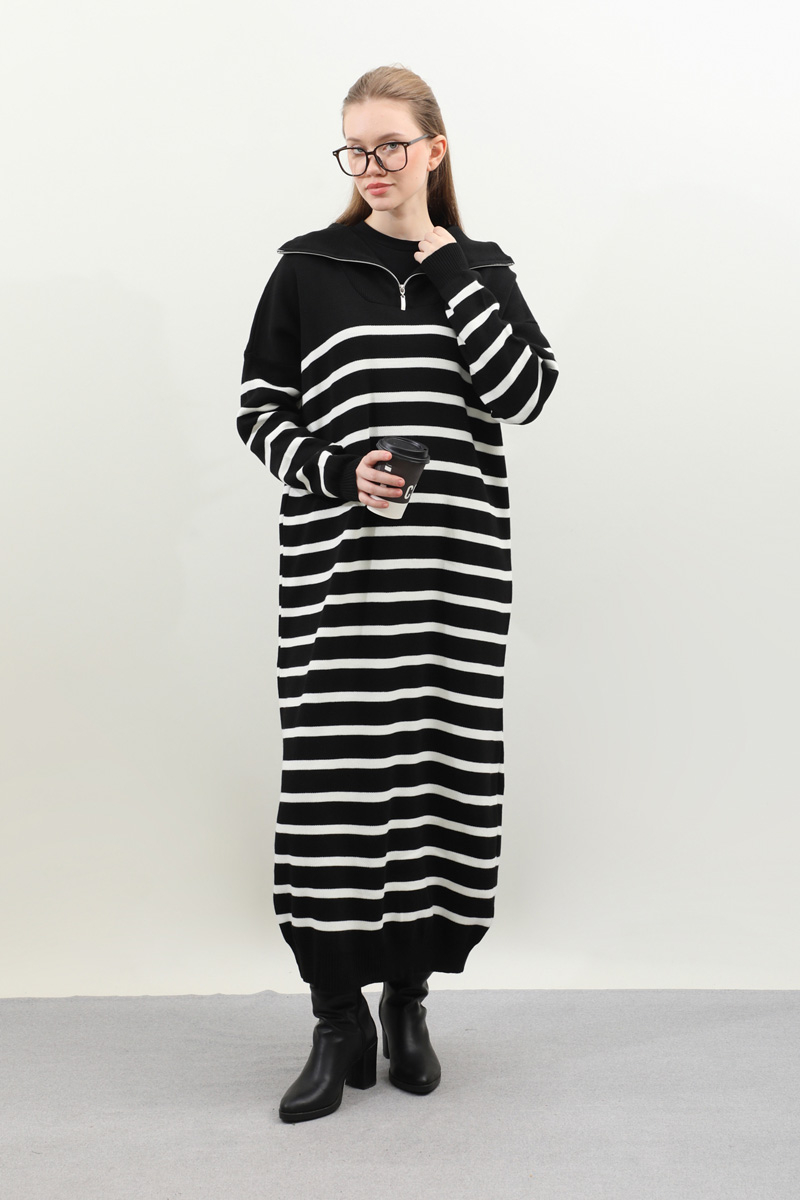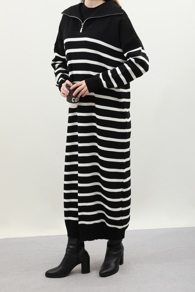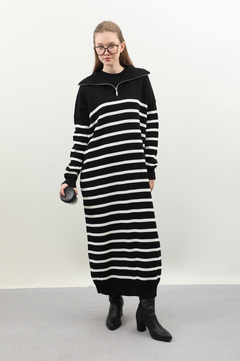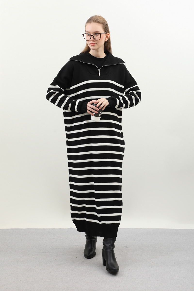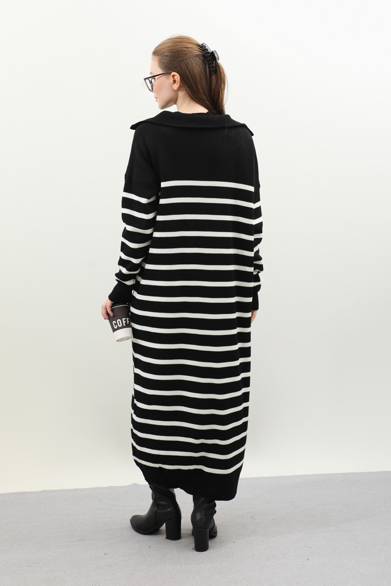 Çizgili Uzun Elbise Siyah. Fermuar detaylı balıkçı yakadır, düşük kolludur, manşet ve etek ucu ribanalıdır. kollar ve bedeninde cizgi detaylıdır, cepsizdir, astarsızdır. Günlük kullanım ve özel günlerinizde tercih edebilirsiniz.