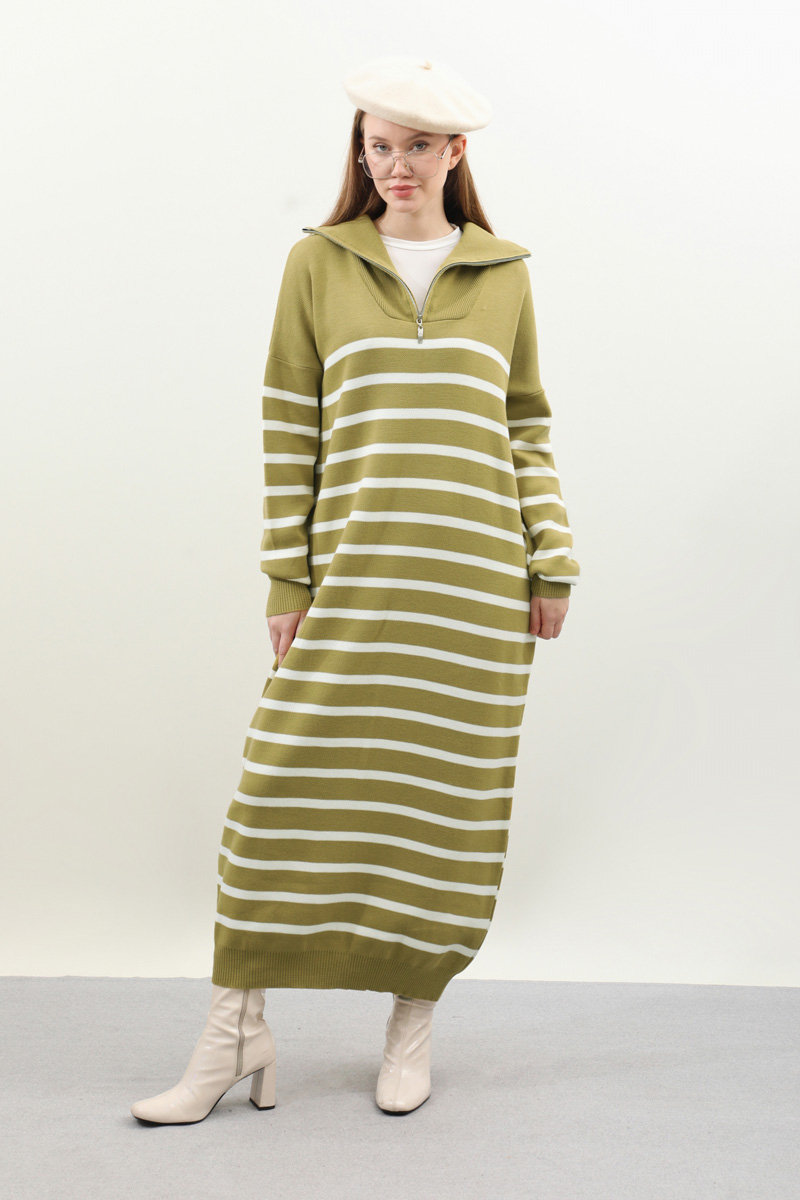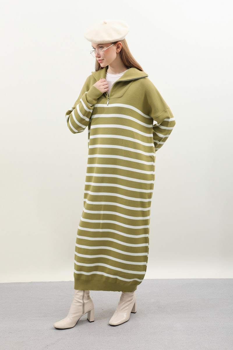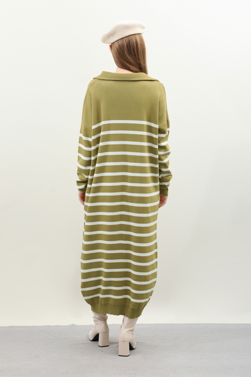 Çizgili Uzun Elbise Yağ Yeşili. Fermuar detaylı balıkçı yakadır, düşük kolludur, manşet ve etek ucu ribanalıdır. kollar ve bedeninde cizgi detaylıdır, cepsizdir, astarsızdır. Günlük kullanım ve özel günlerinizde tercih edebilirsiniz.