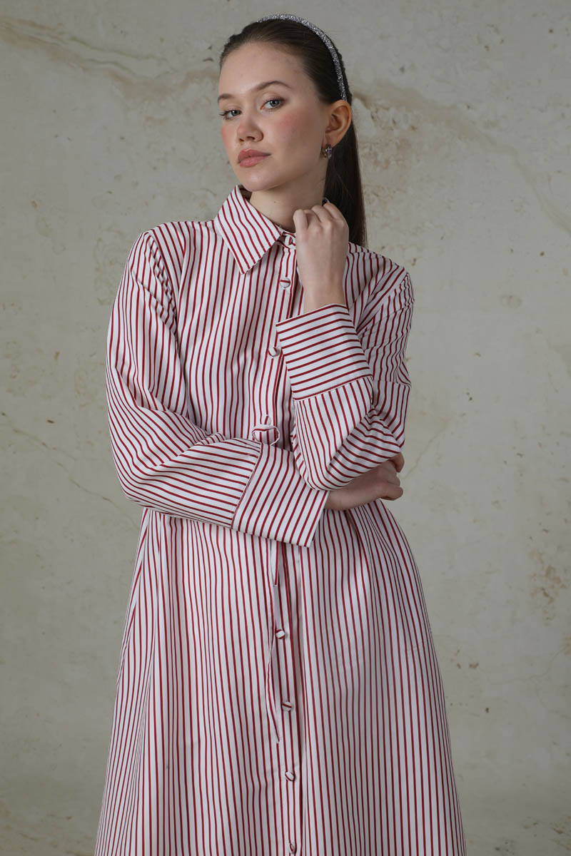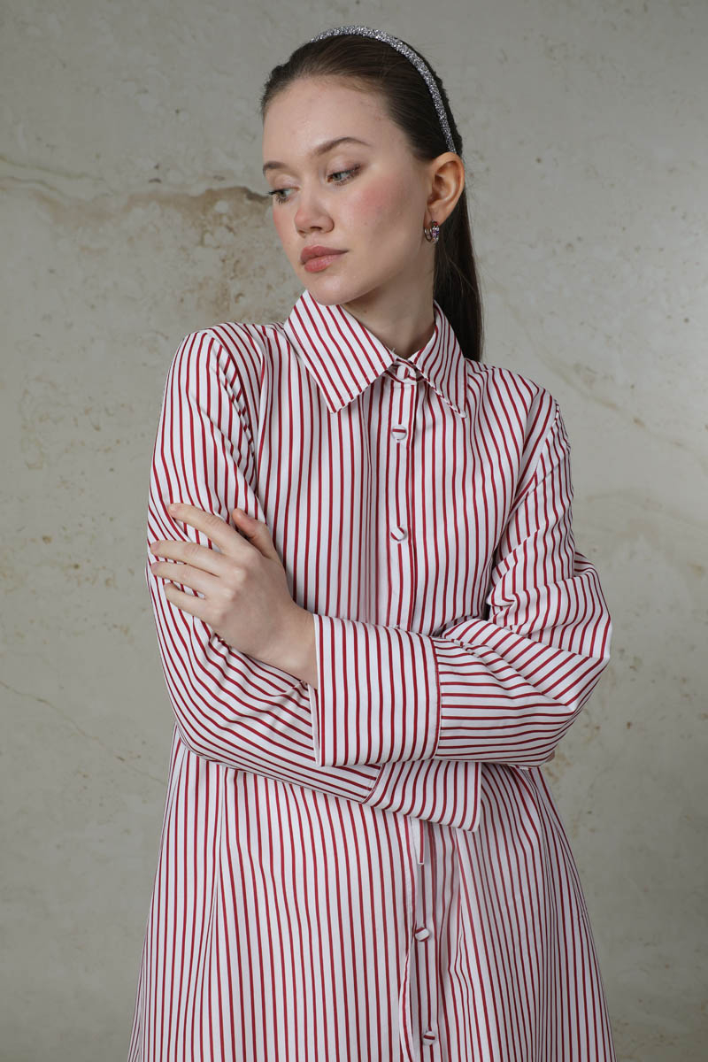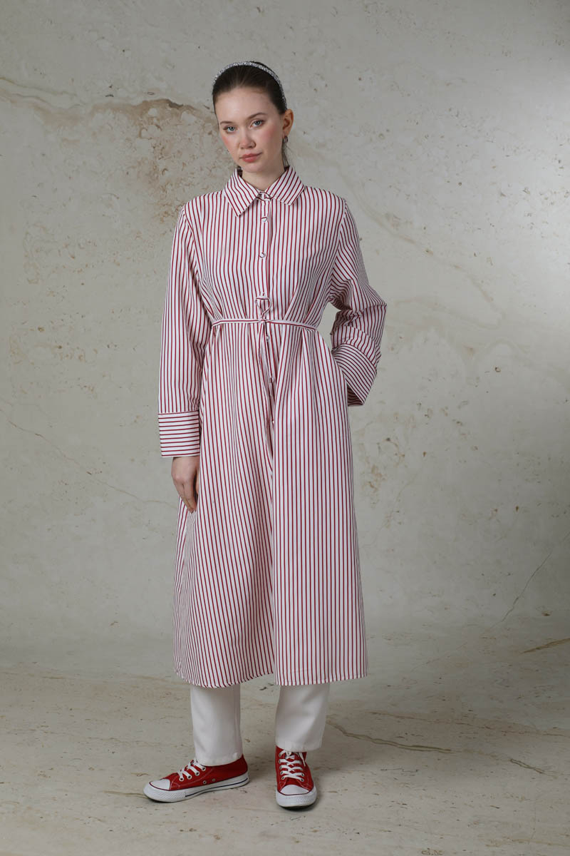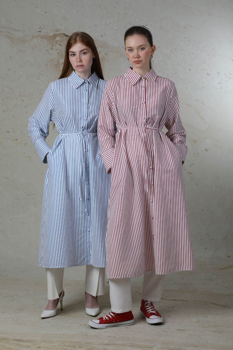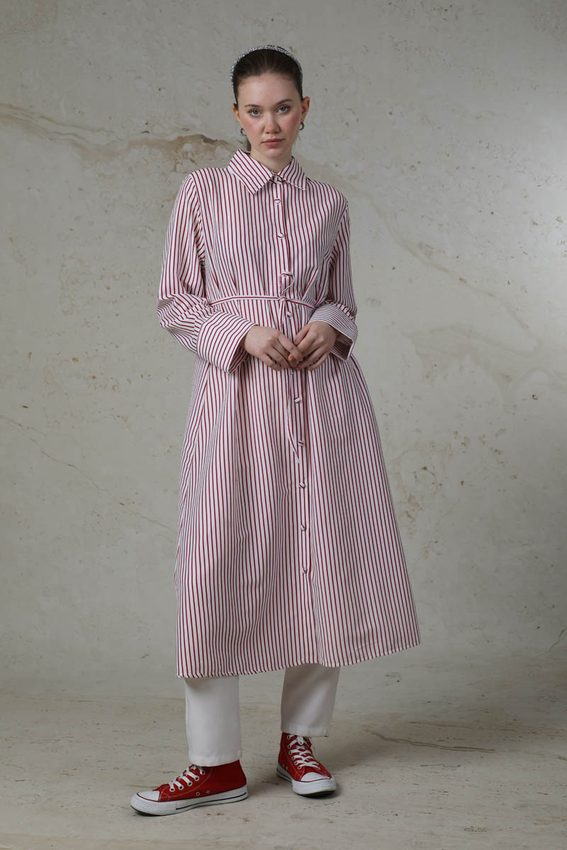Çizgili Uzun Gömlek Tunik Nar Çiçeği. Gömlek yakalıdır. Ceplidir. Geniş manşet detaylıdır. Kaplama düğmelidir. Belden bağlanılabilir biye detaylıdır. Günlük kullanım ve özel günlerinizde tercih edebilirsiniz.