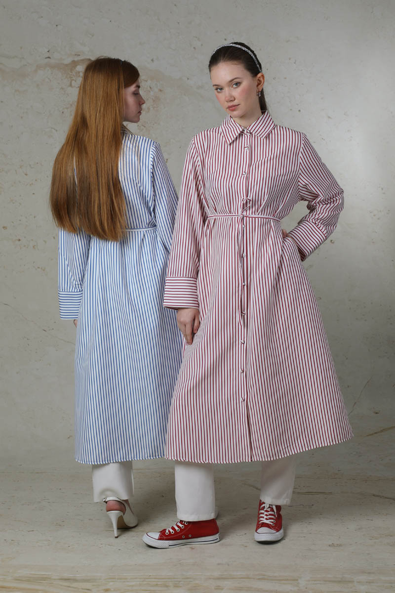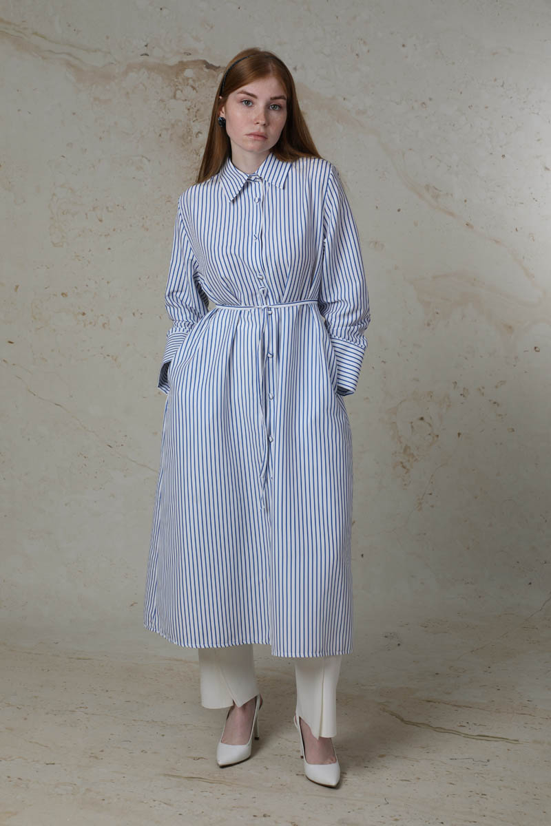 Çizgili Uzun Gömlek Tunik Saks Mavisi. Gömlek yakalıdır. Ceplidir. Geniş manşet detaylıdır. Kaplama düğmelidir. Belden bağlanılabilir biye detaylıdır. Günlük kullanım ve özel günlerinizde tercih edebilirsiniz.
