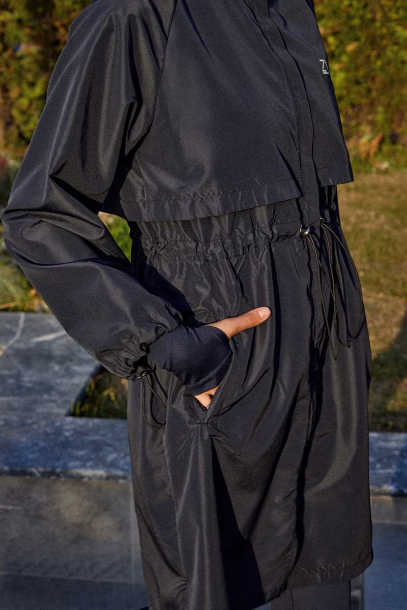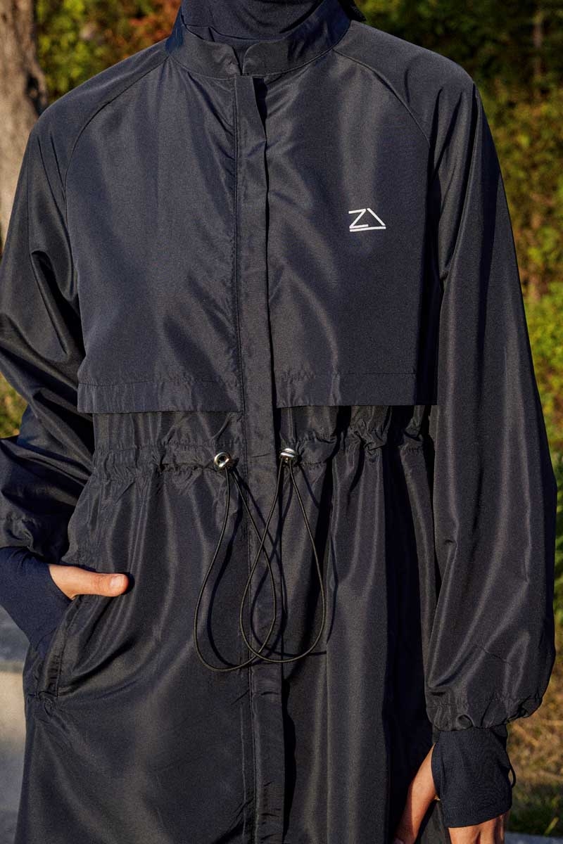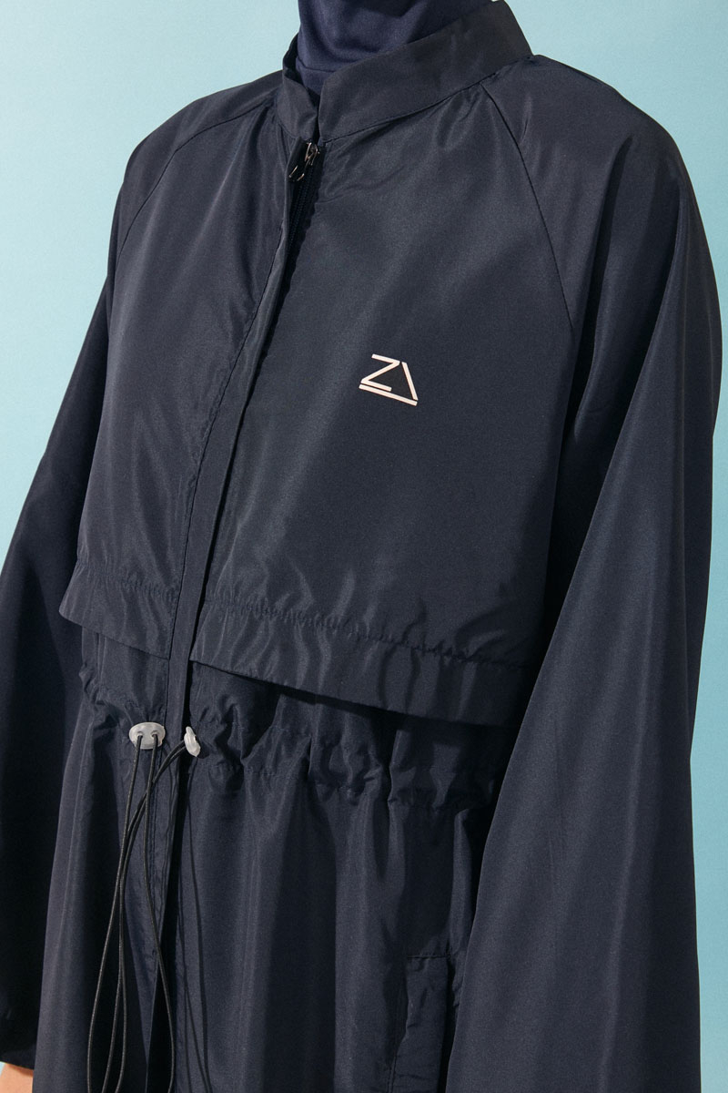 Features a stand collar. The tunic includes an adjustable stopper at the waist, windbreaker-style fabric, short side slits, a hidden front zipper, and zippered front pockets.