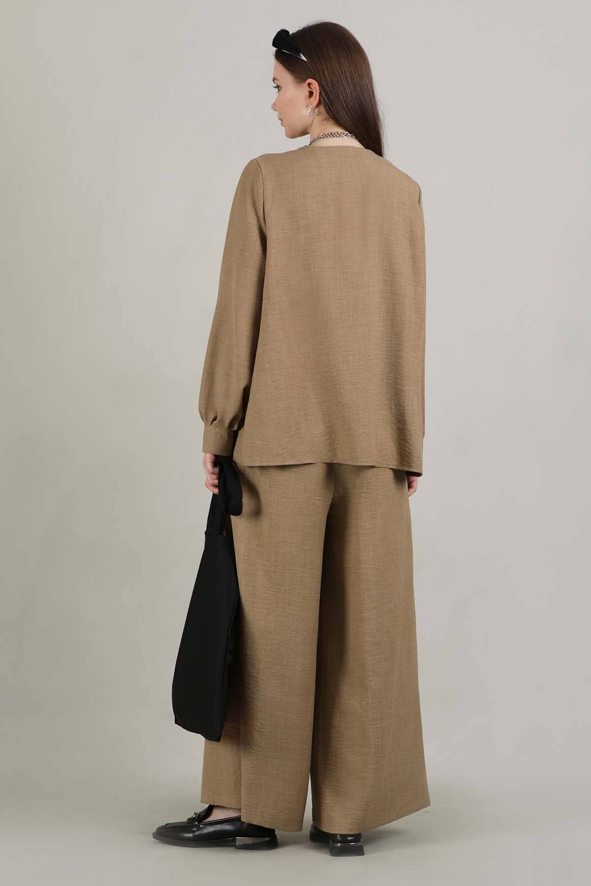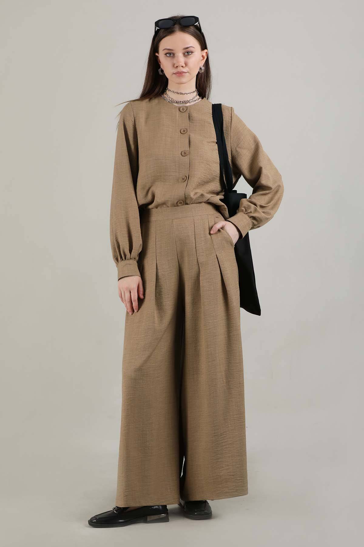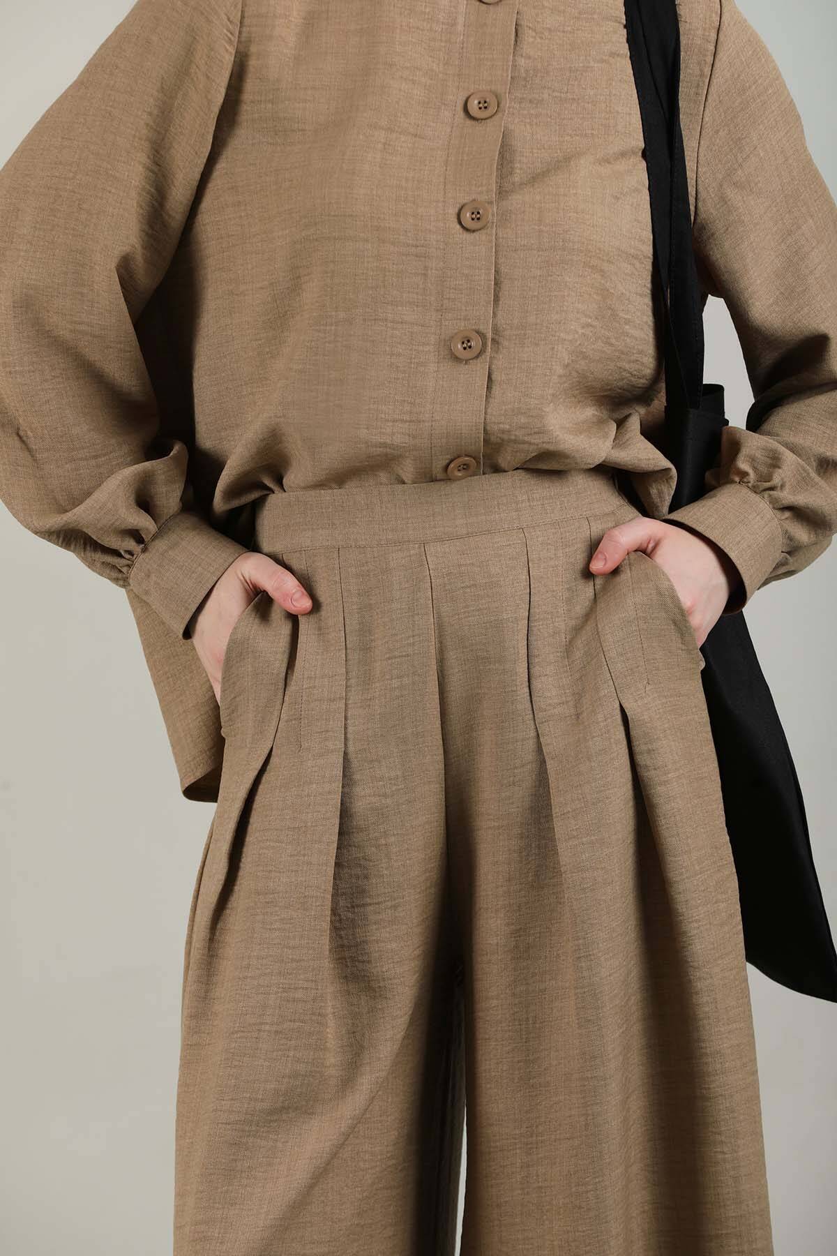Classic Shirt Suit Camel. Shirt Buttoned. Sold as a set with trousers.