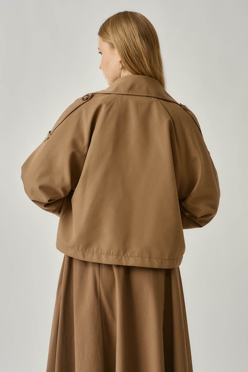 Classic Short Trench Coat Camel in Black adds an elegant touch to modern city style. Featuring a wide lapel and double-breasted button detail, it carries the signature lines of a traditional trench coat while offering a dynamic and effortless look with its short length. Its structured fabric maintains form, and the oversize cut makes it an ideal layering piece for all seasons. Perfectly adaptable to various looks—from daily outfits to office wear.