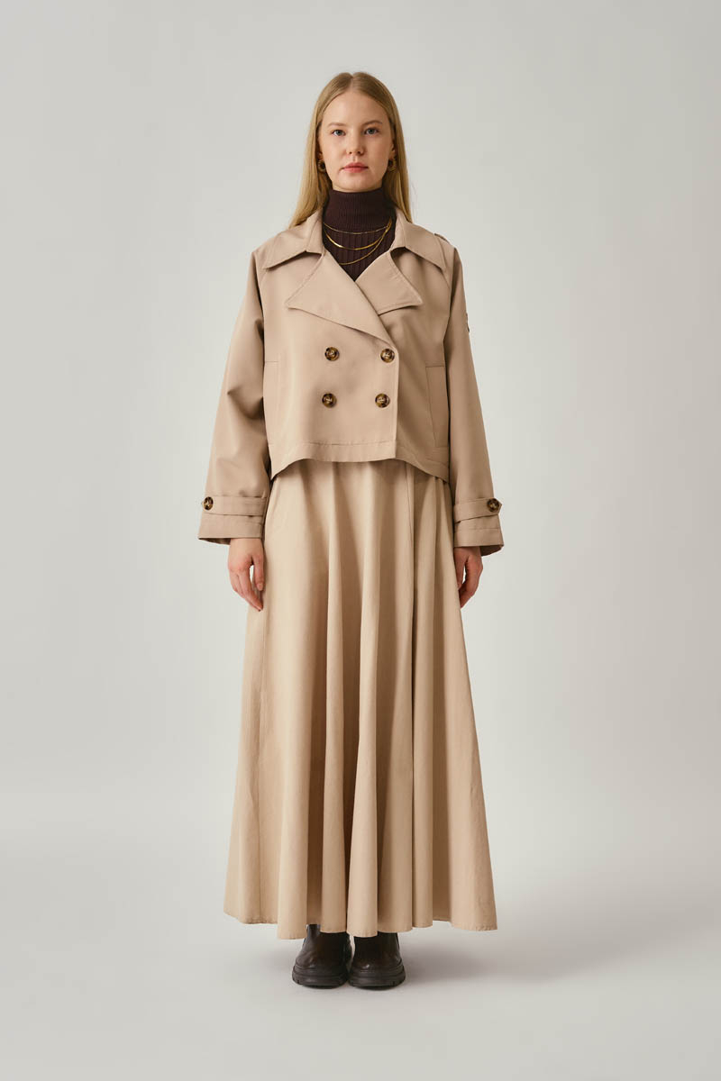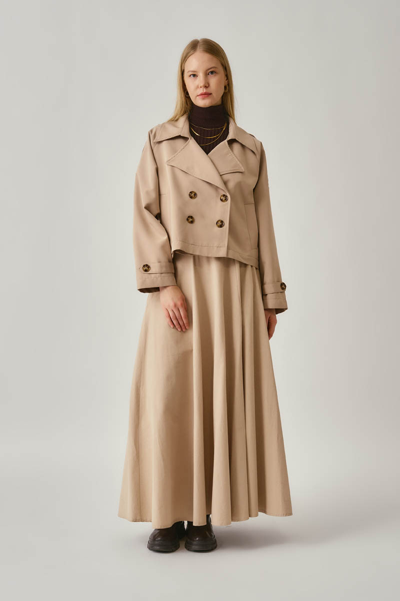 Classic Short Trench Coat Stone in Black adds an elegant touch to modern city style. Featuring a wide lapel and double-breasted button detail, it carries the signature lines of a traditional trench coat while offering a dynamic and effortless look with its short length. Its structured fabric maintains form, and the oversize cut makes it an ideal layering piece for all seasons. Perfectly adaptable to various looks—from daily outfits to office wear.