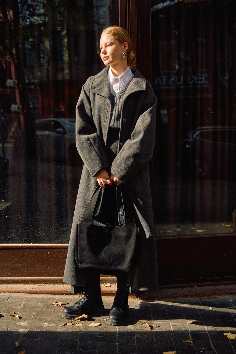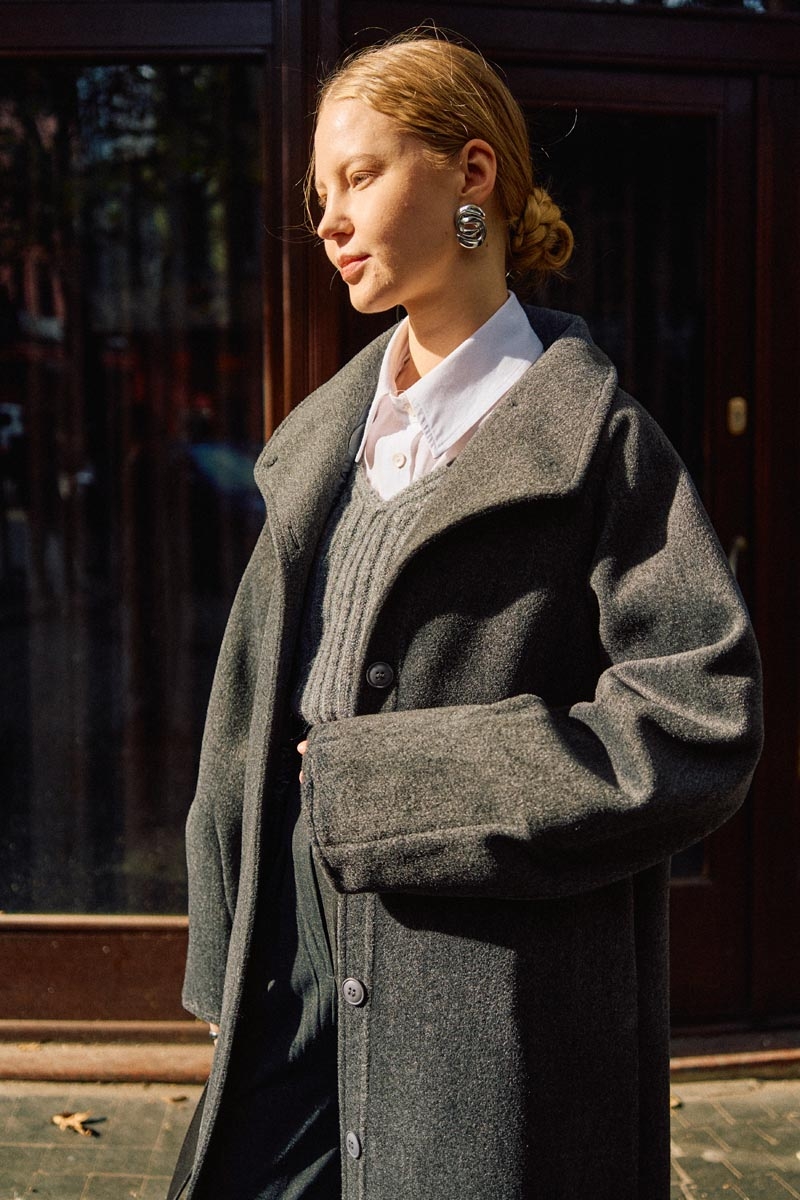Coat with Dart Detail Anthracite reflects a refined urban elegance with its clean lines and structured silhouette. The raglan sleeve form and high collar add a modern touch, while the front dart seams subtly shape the body. Made from a dense yet soft-textured fabric, it provides warmth throughout the winter. With its classic cut, it easily complements both casual and formal looks.