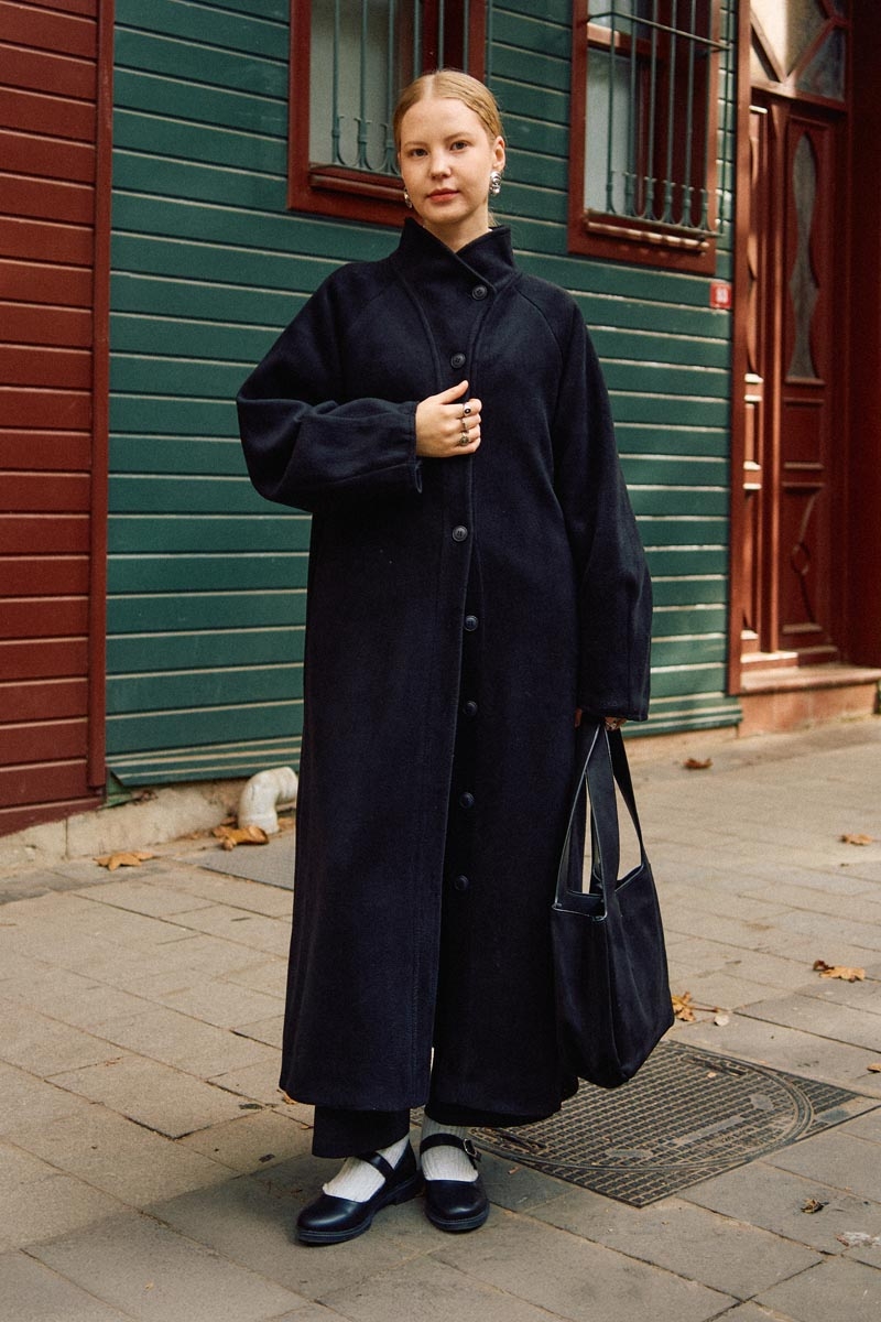 Coat with Dart Detail Black reflects a refined urban elegance with its clean lines and structured silhouette. The raglan sleeve form and high collar add a modern touch, while the front dart seams subtly shape the body. Made from a dense yet soft-textured fabric, it provides warmth throughout the winter. With its classic cut, it easily complements both casual and formal looks.