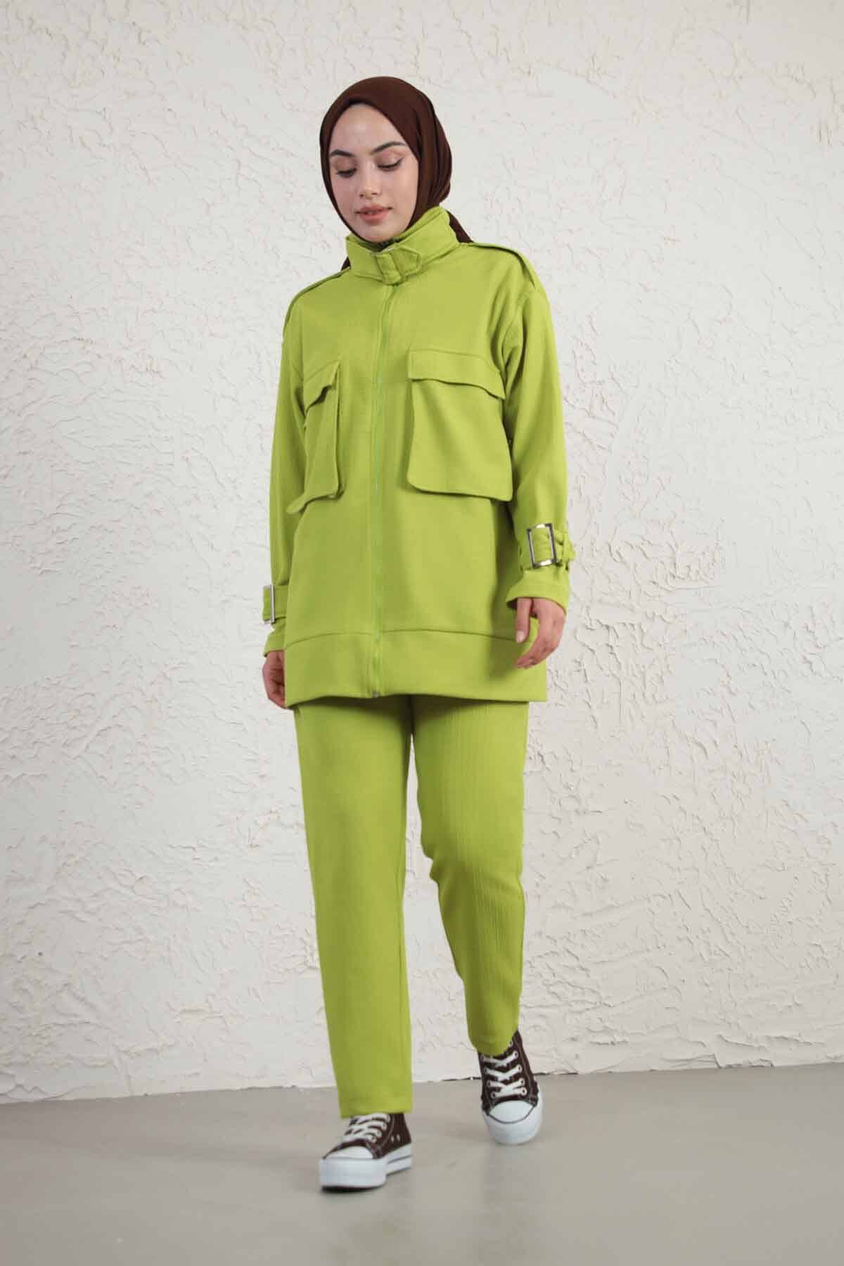Buckled Collar Double Suit Oil Green. The tunic is zippered, there is a fastening buckle on the collar. The trousers have elastic waist and pockets.