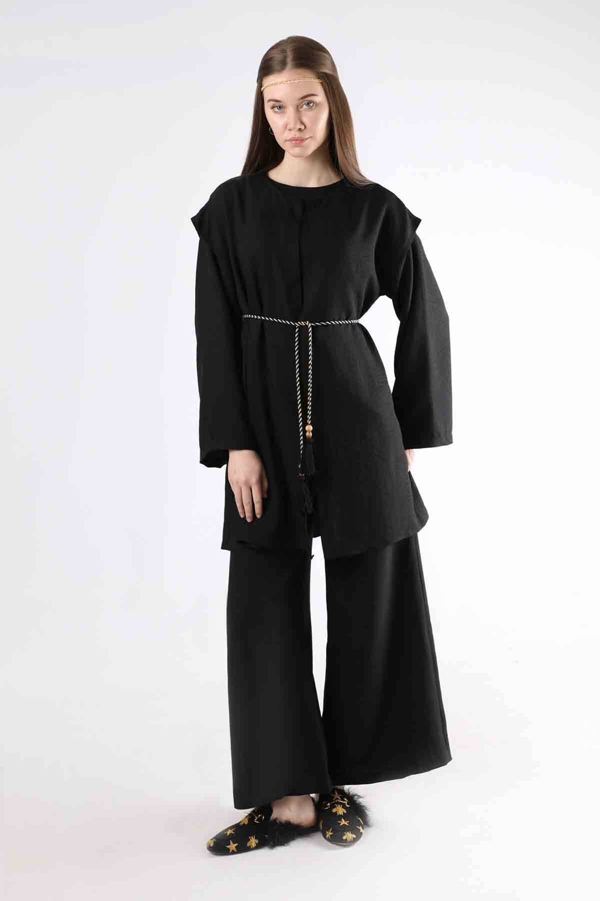 Corded Wide Leg Vest Set Black. Tassel detailed cord. vest. The trousers have elastic waist and wide leg. It's a normal pattern. Sold as a set of three. Our product, designed using the trendy colors of the season, is one of the favorite products of the new season.