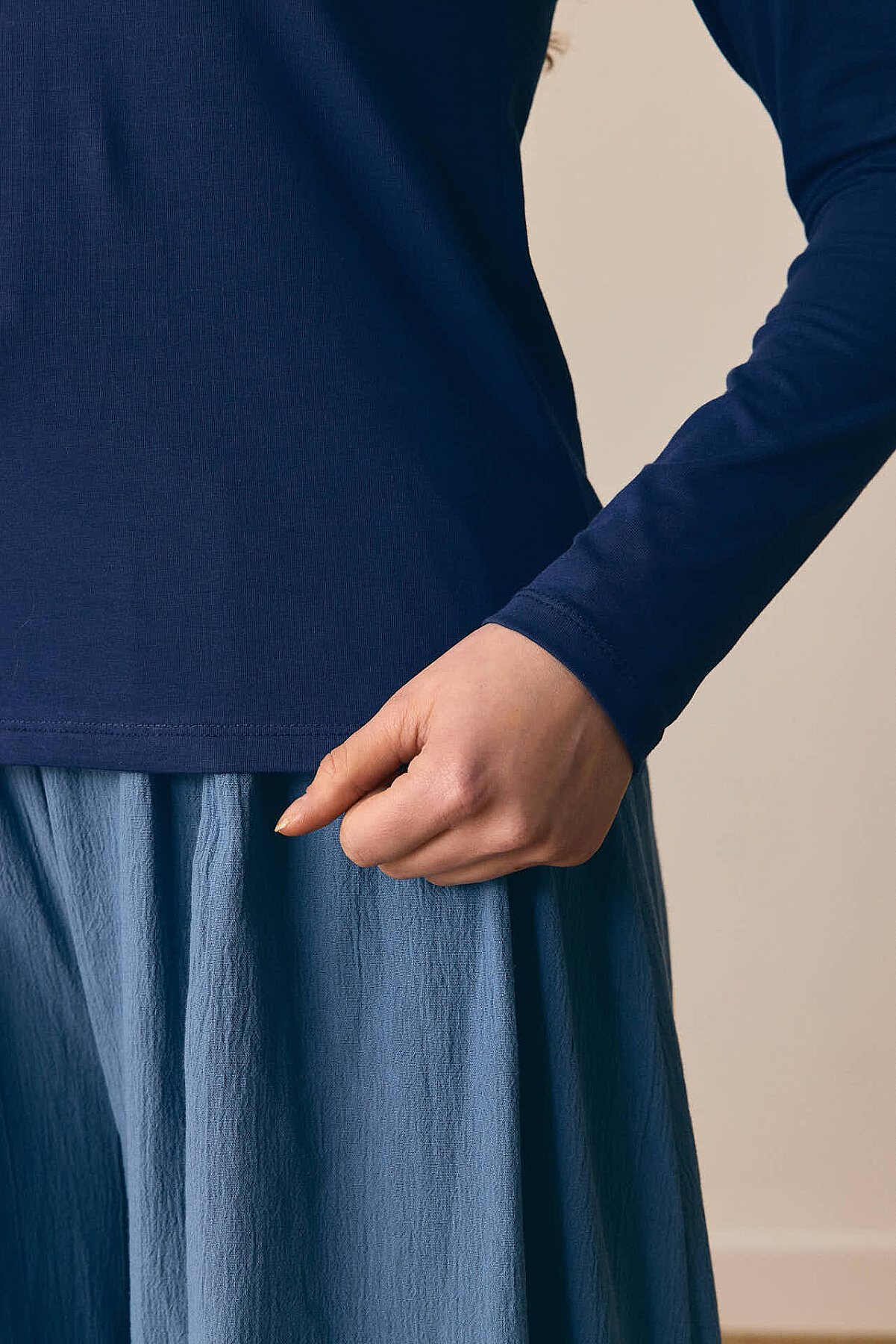 This long-sleeve basic t-shirt hugs the body with its soft and stretchy fabric, making it perfect for wearing alone or as a layering piece. Ideal for those who want to achieve everyday elegance with a simple touch.