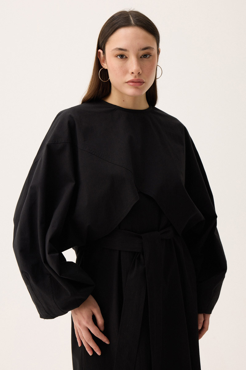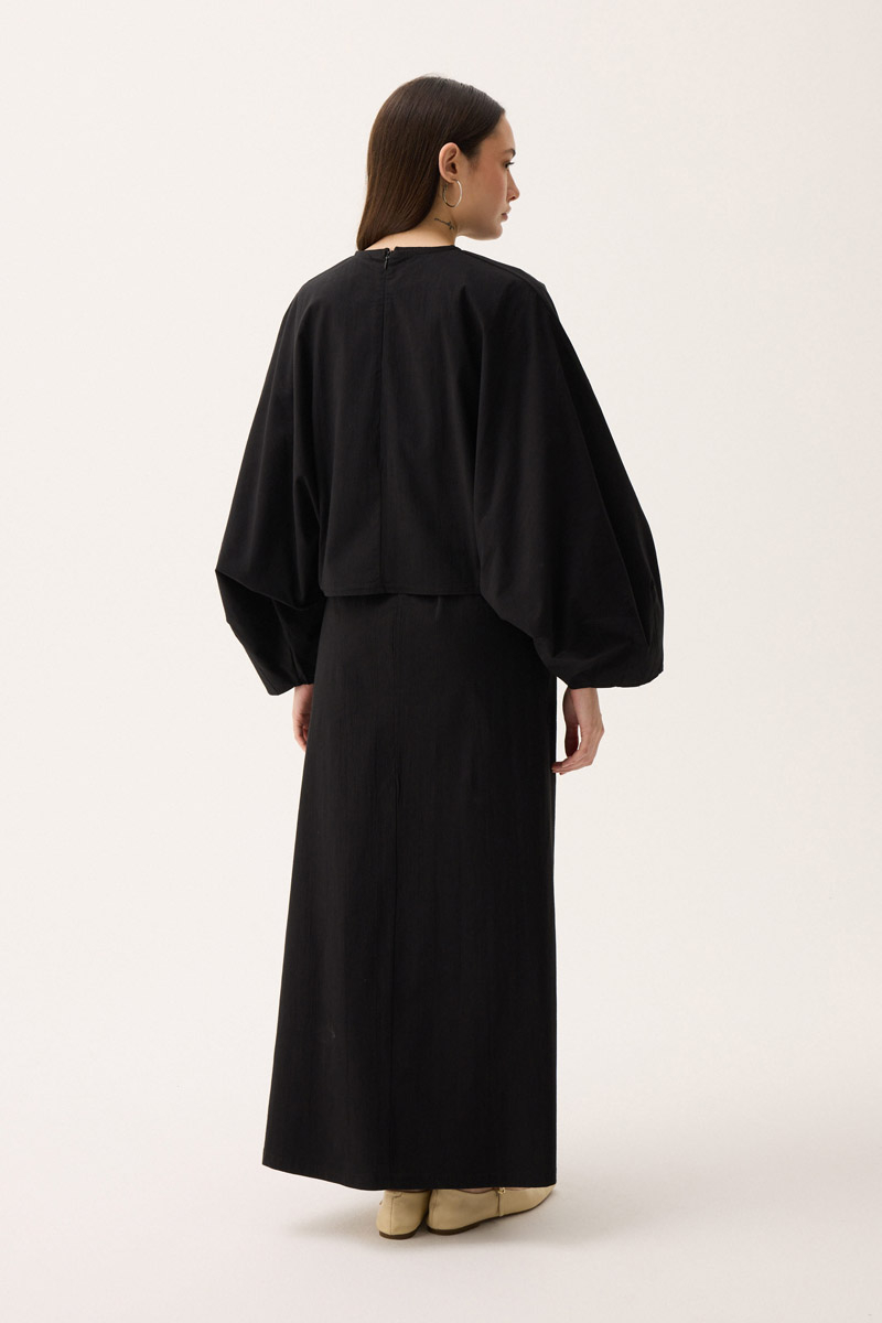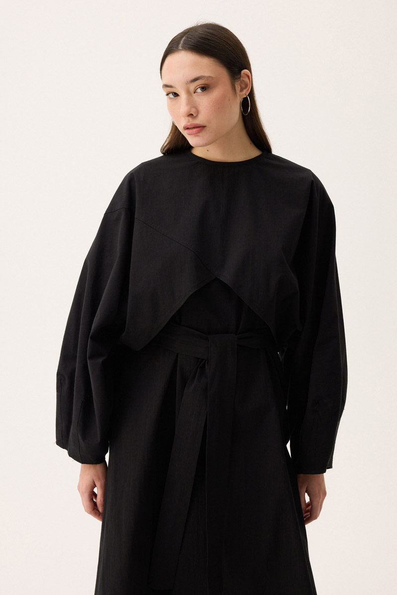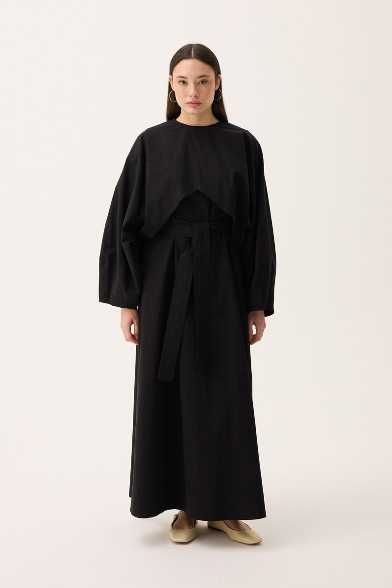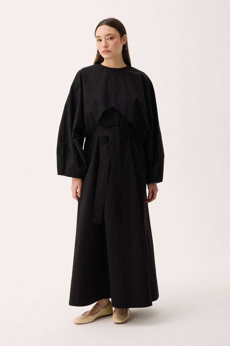 Croplu Elbise Takım Siyah. Crop bisiklet yakadır, düşük omuzludur, yandan cepli ve astarsızdır, iç jiledir, dış crop elbise takım kol ucu pens detaylı beli kusakli bol kalıptır, Günlük kullanım için uygundur.